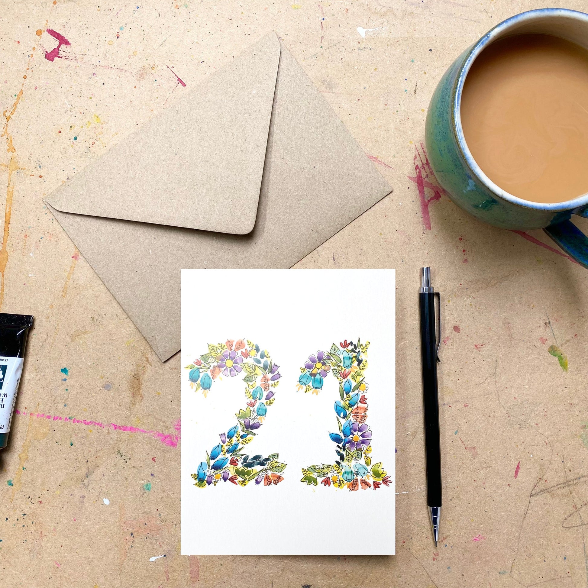 Single greetings card featuring an original floral illustration in the shape of a 21. This is a blank A5 greetings card with a print of a watercolour painting of flowers and foliage and is the perfect birthday card for your loved one who is turning the big 21!