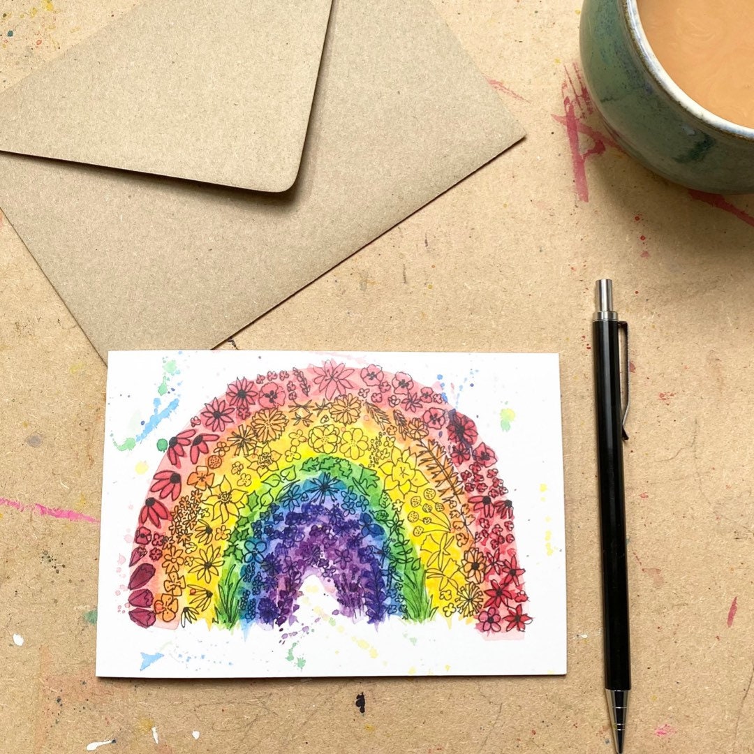 Blank A6 greetings card with a print of a floral rainbow. Perfect for thankyous to healthcare workers, LGBTQ+ celebrations, or welcoming rainbow babies.