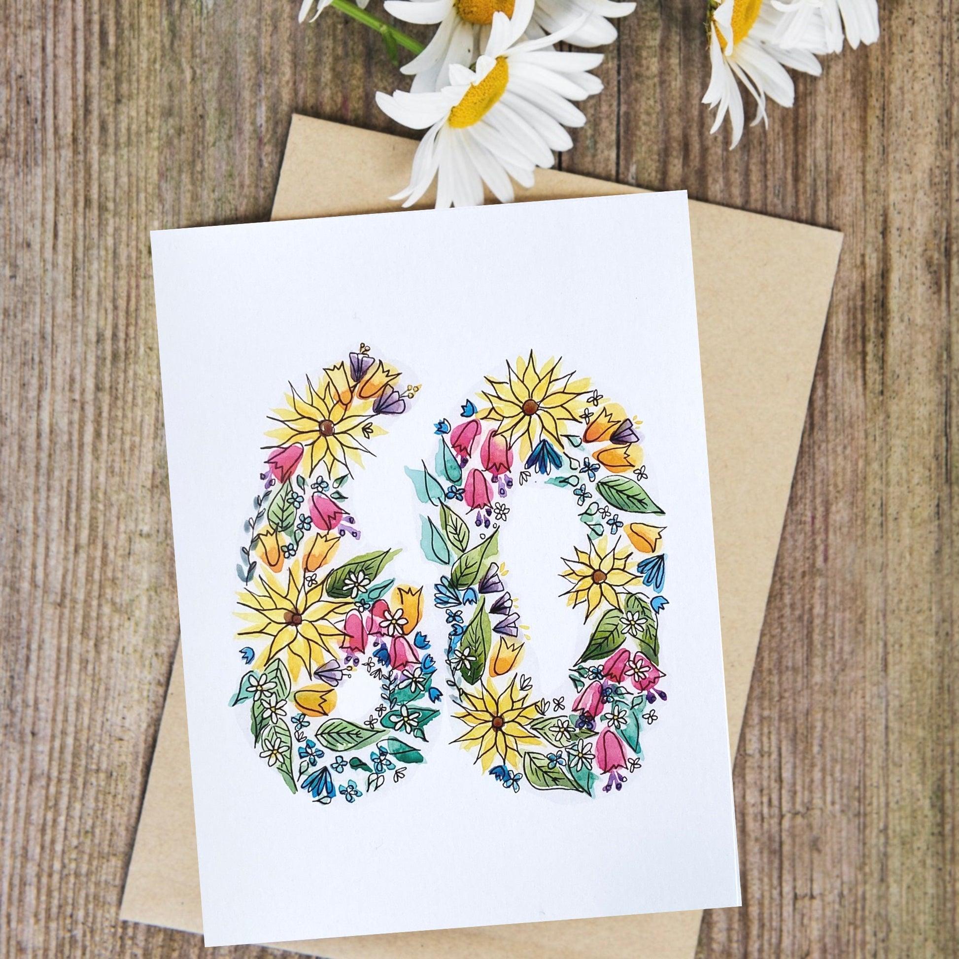 Single greetings card featuring an original floral illustration in the shape of a 60. This is a blank A5 greetings card with a print of a watercolour painting of flowers and foliage and is the perfect birthday card for your loved one who is turning sixty and fabulous!