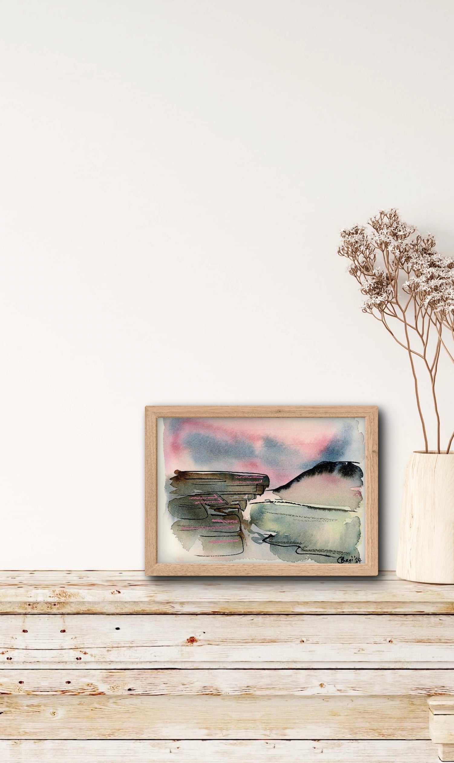 This atmospheric landscape inspired by Bamford Edge in the Peak District features a selection of blues with vibrant pops of pink; this is an A4 print of a mixed media piece, created using watercolours, pastels and ink.