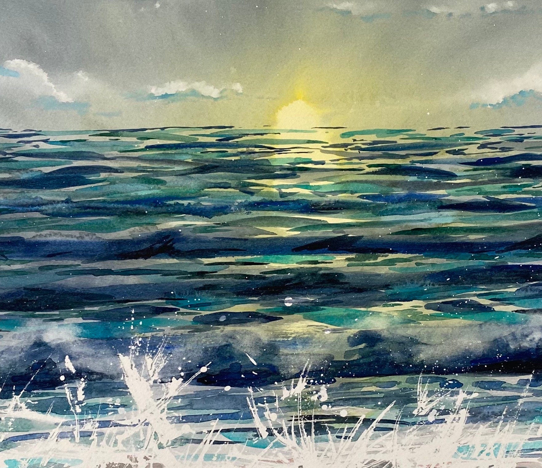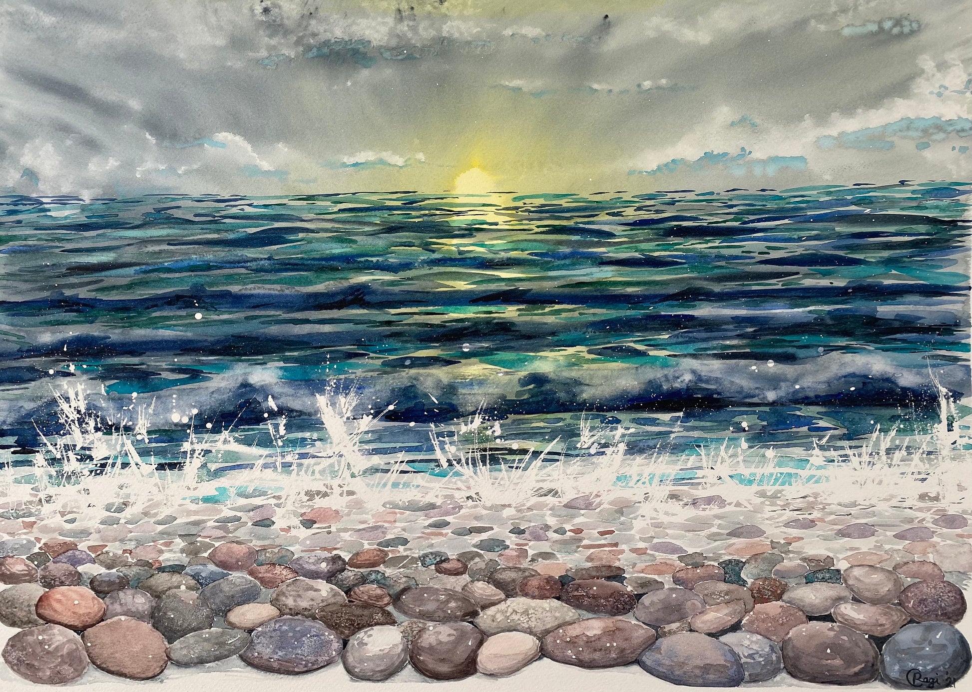 This painting has a fresh morning sun rising over a glossy ocean full of blues and greens. The pebbles have a realistic finish and provide endless details to look at.