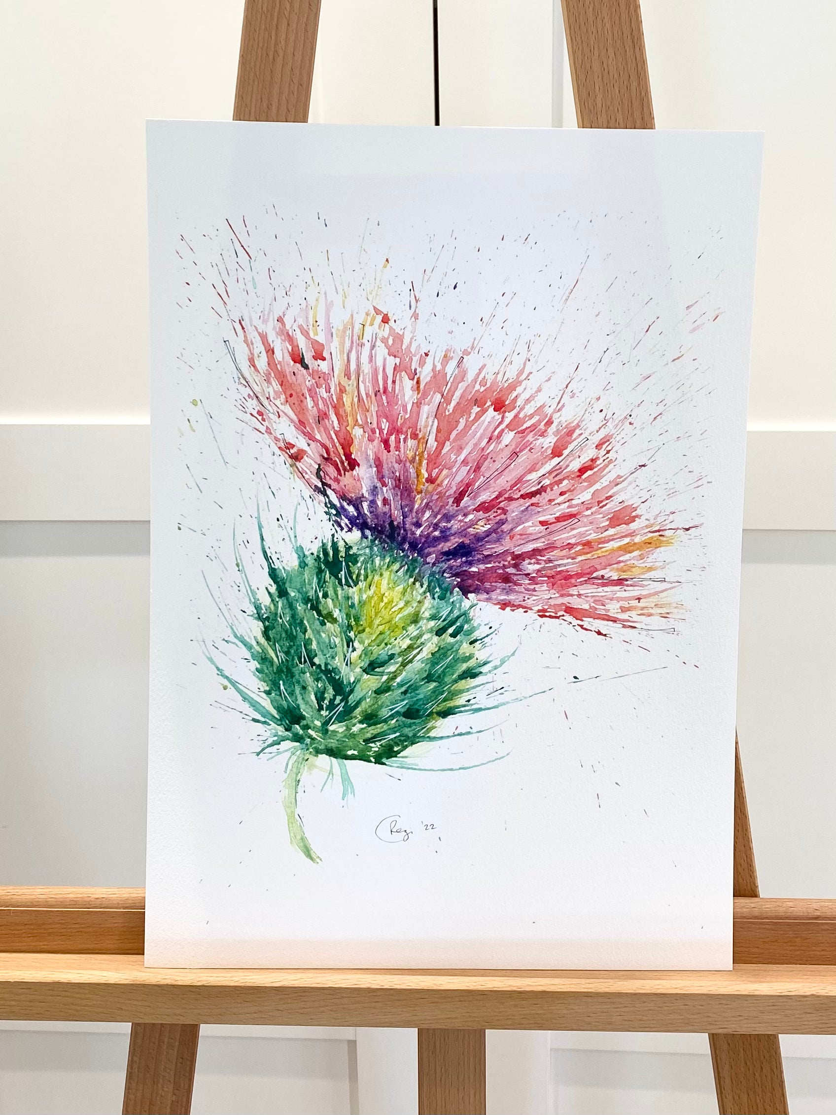 There are two thistles which can be bought individually or as a pair. They were created using watercolour paint and a quilt for the scratchy, splashy effect which works so well for this beautiful spiky plant. Zoom in close to see all the colours, these make a great gift for those with Scottish connections or who love wildflowers!