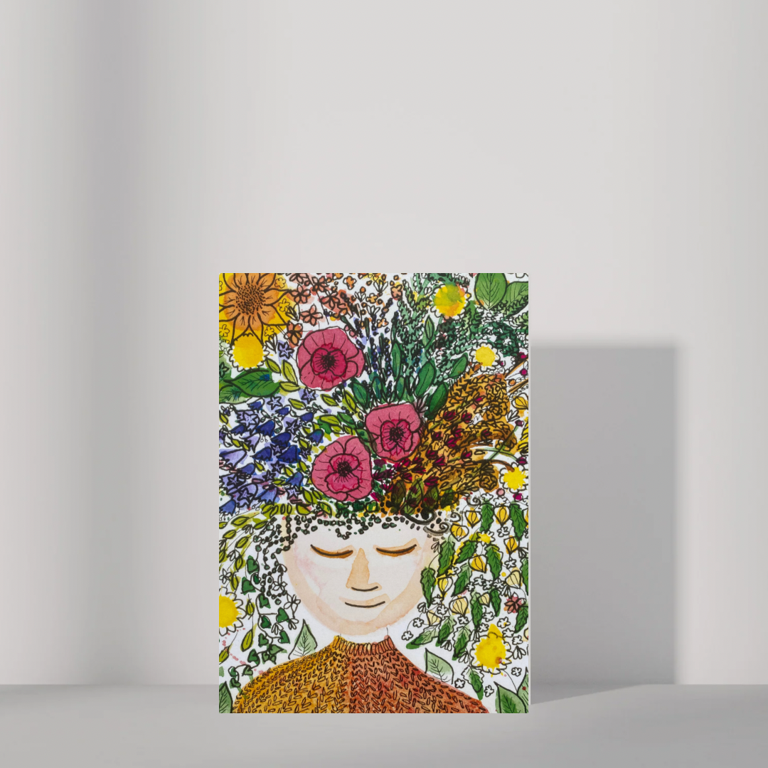 Blank A6 greetings card with a calm face and head of hair made of a wide range of flowers. There are poppies, a sunflower, bluebells, physalis, grasses and leaves. The design was drawn to keep me relaxed and it oozes calm into every space it enters.