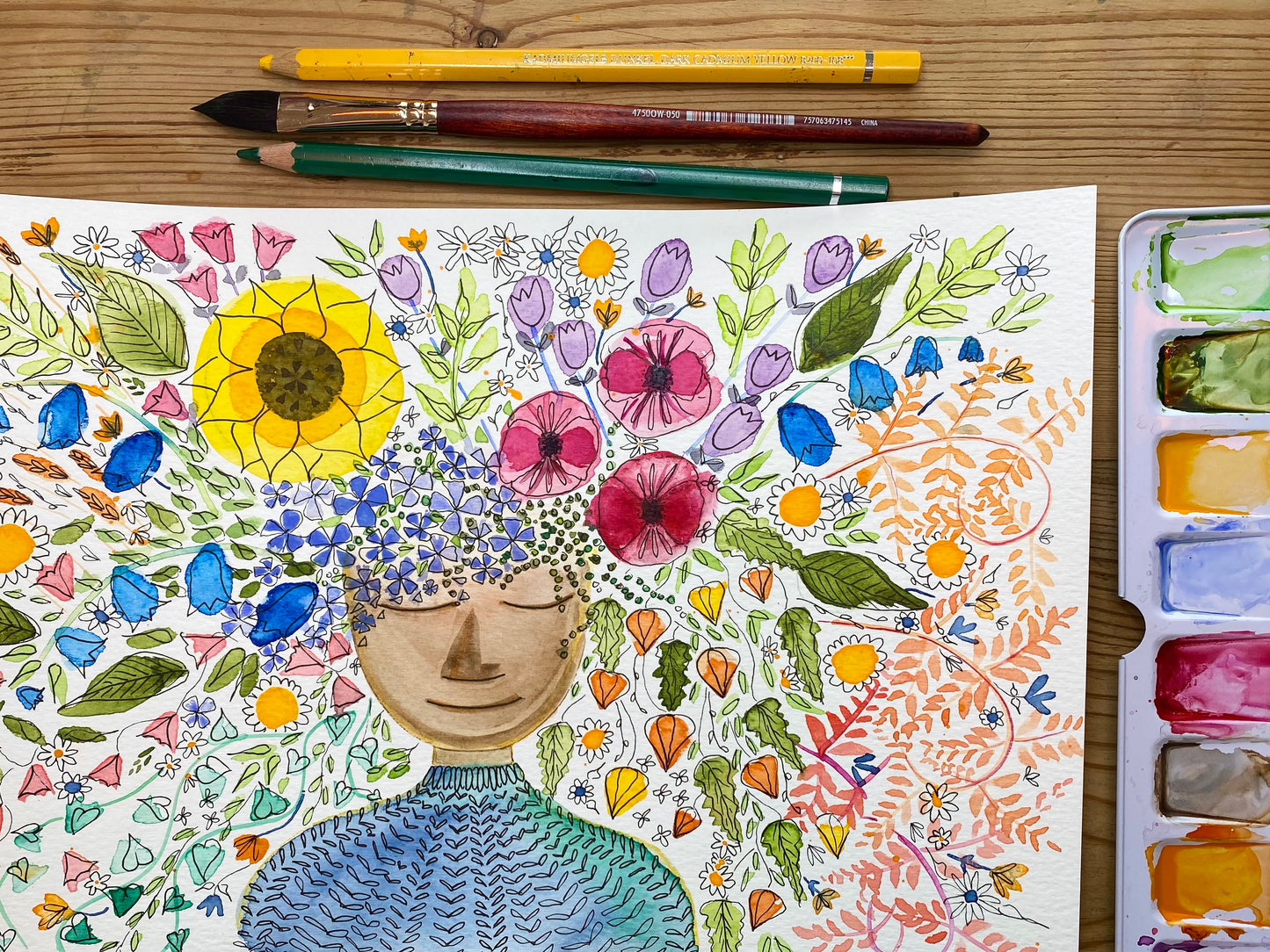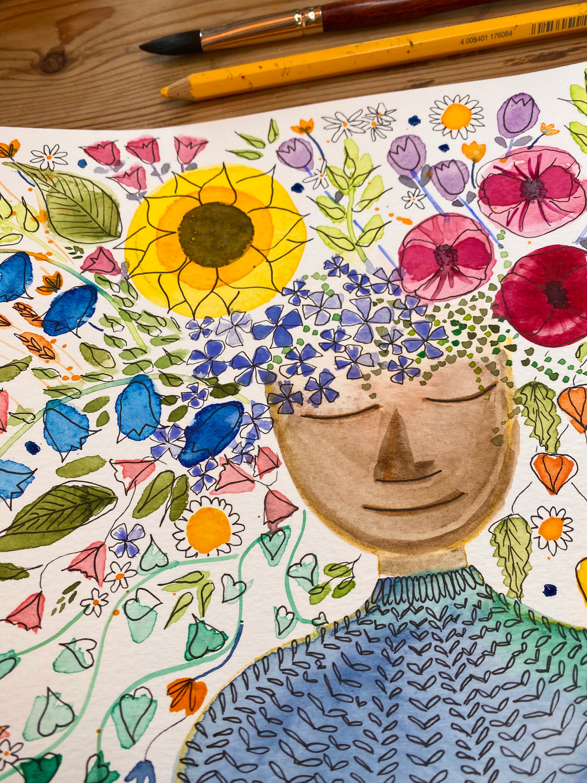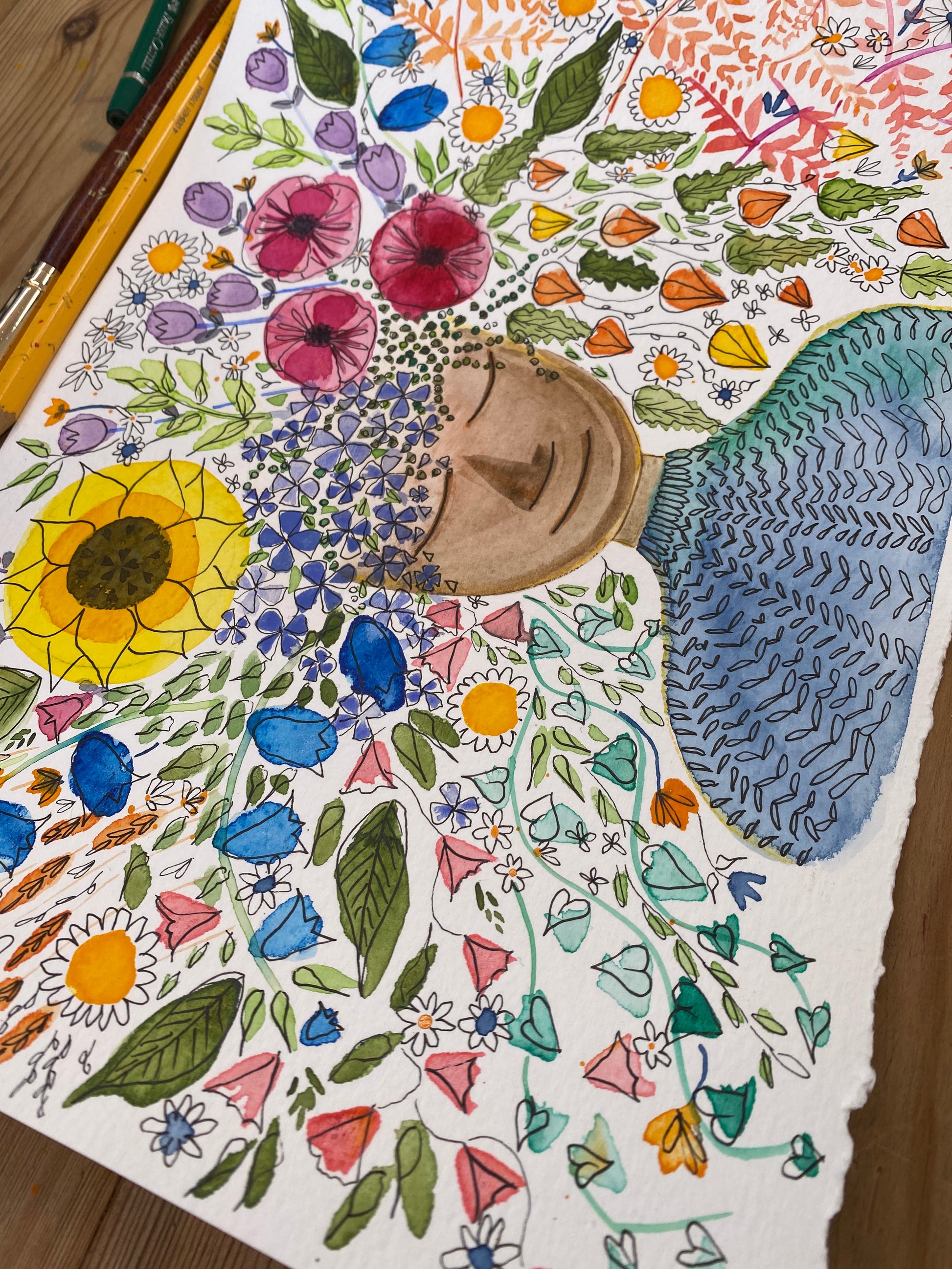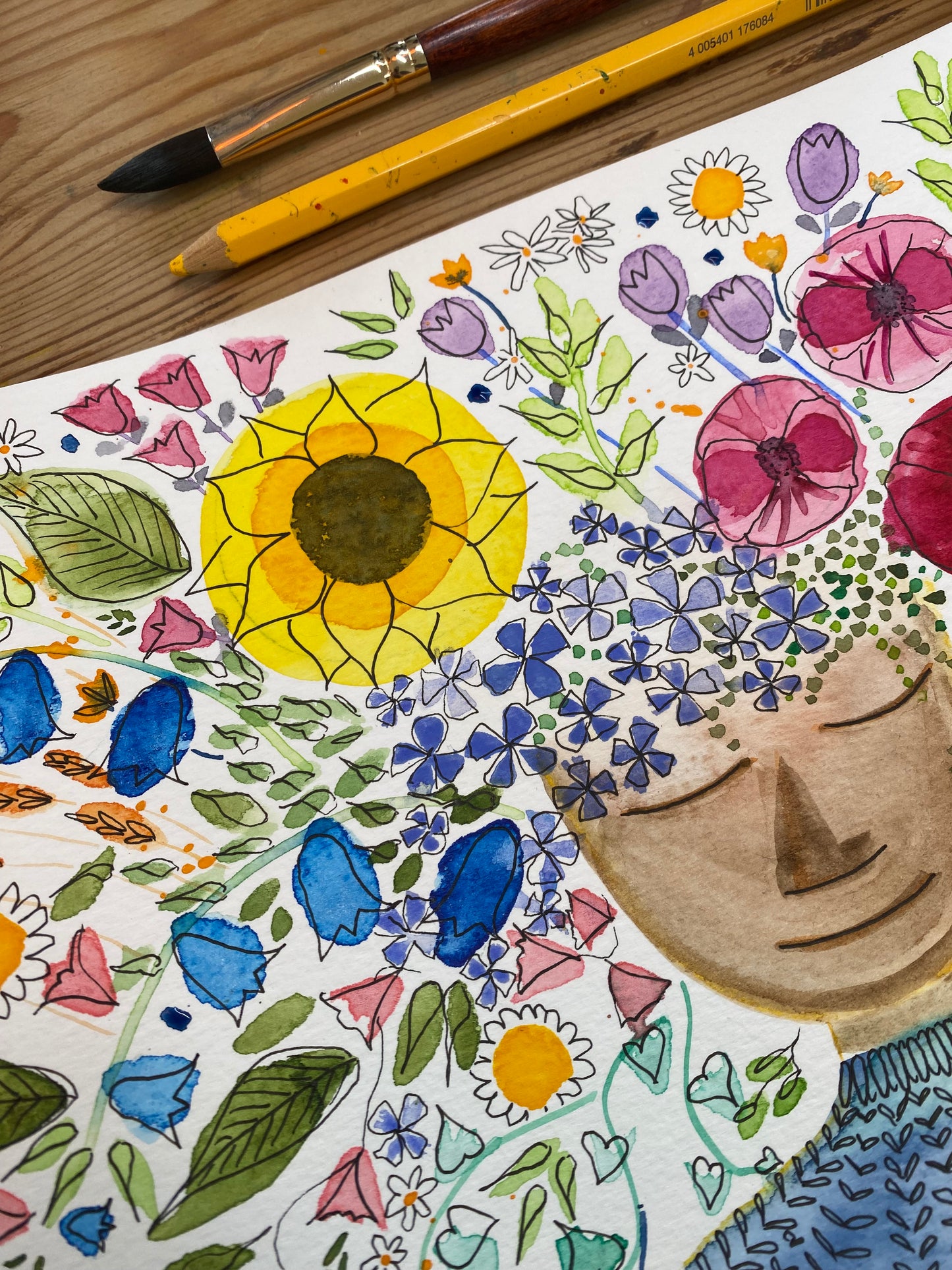 A range of watercolour techniques will be covered to create your own version of my painting 'Dreaming of Flowers'. I will talk you through drawing and painting multiple types of flowers as well as how to proportion a face and draw a knitwear effect. All students will be encouraged to focus on the idea of antiperfection, trying new things and enjoying the process as much as the outcome.