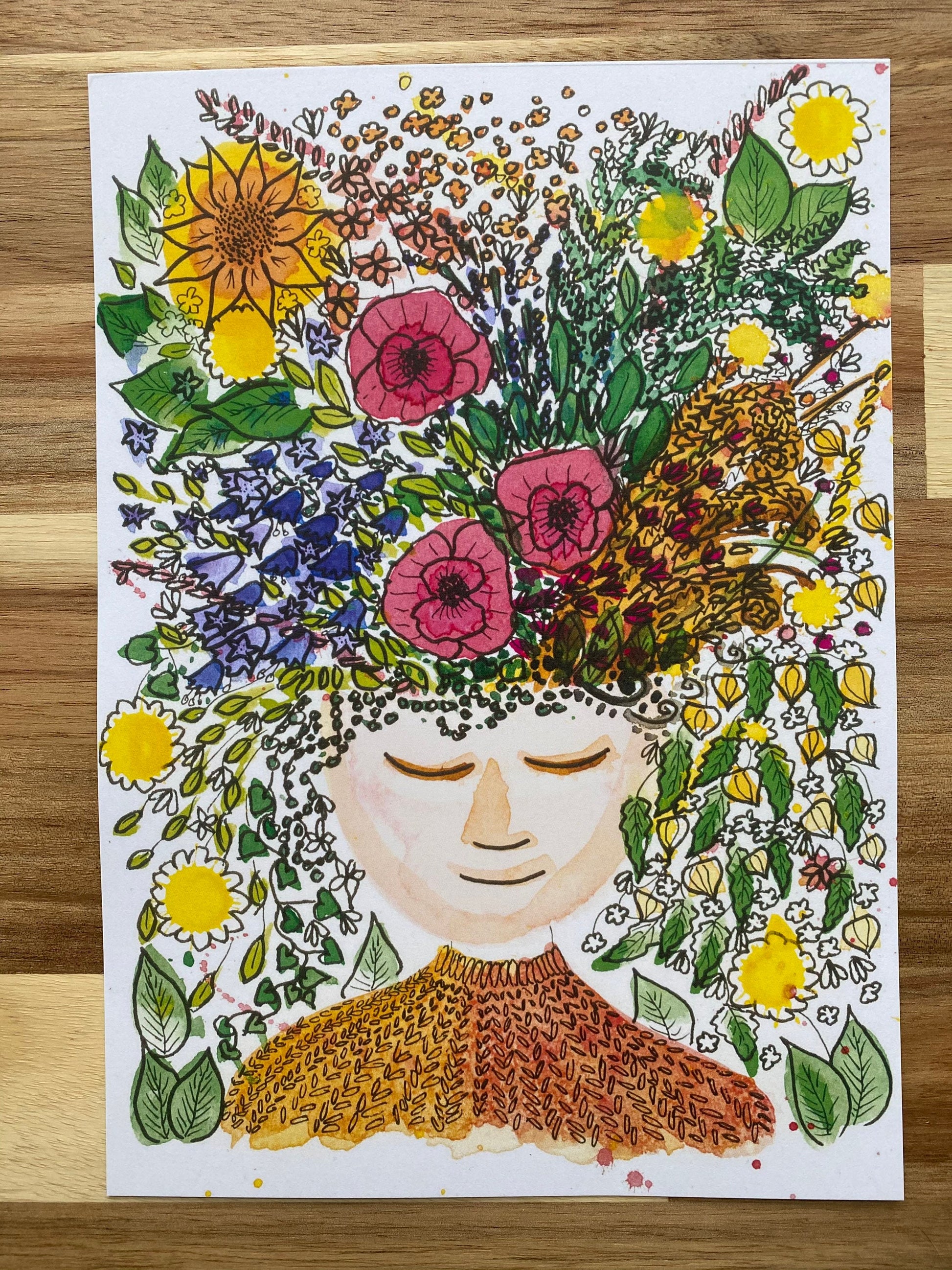 Dreaming of Flowers print is a single, A4 print of a watercolour, gouache and ink artwork.