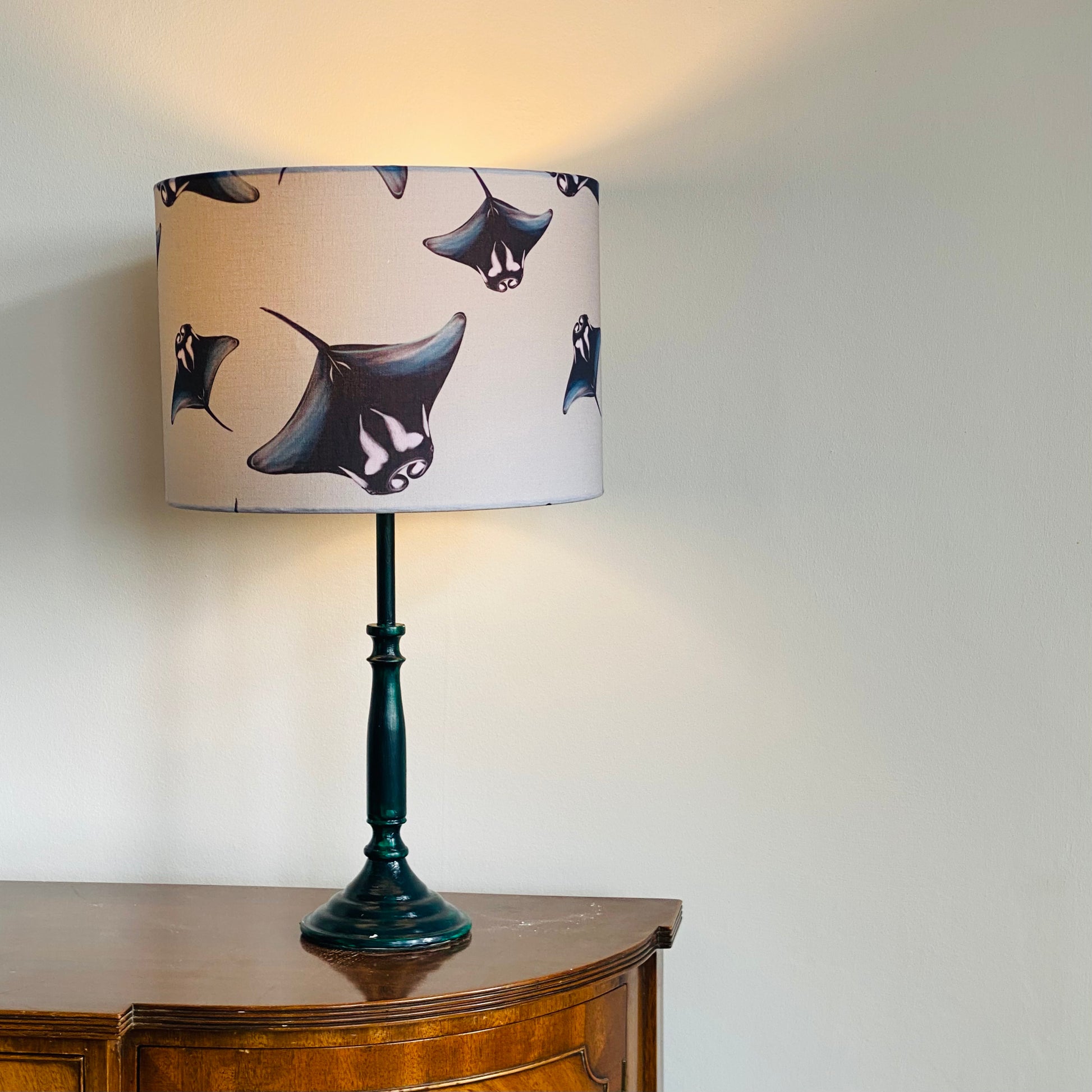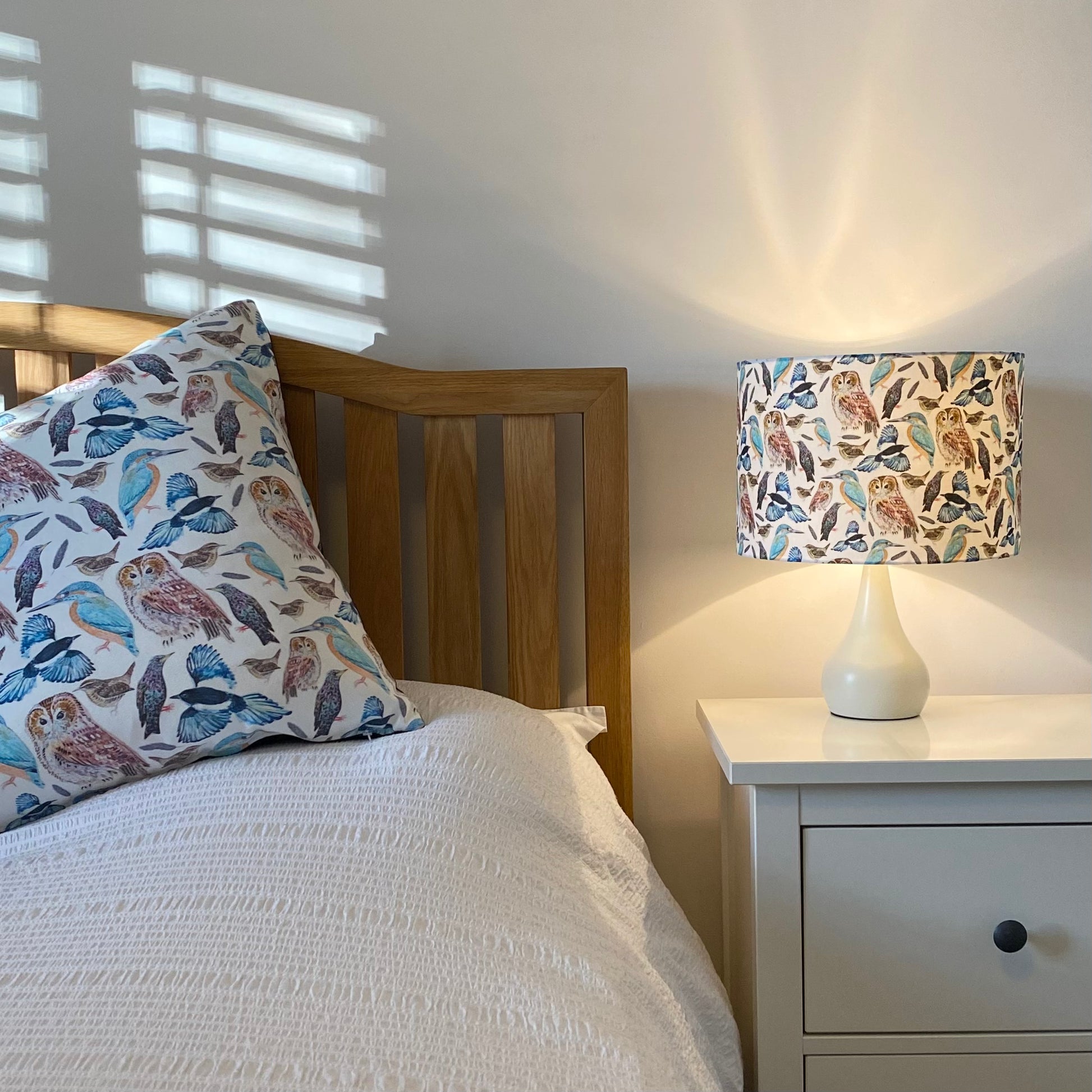 I create my fabrics using my original watercolour designs and have them printed onto high quality cotton. I then use this cotton to hand make a 30cm drum lampshade.