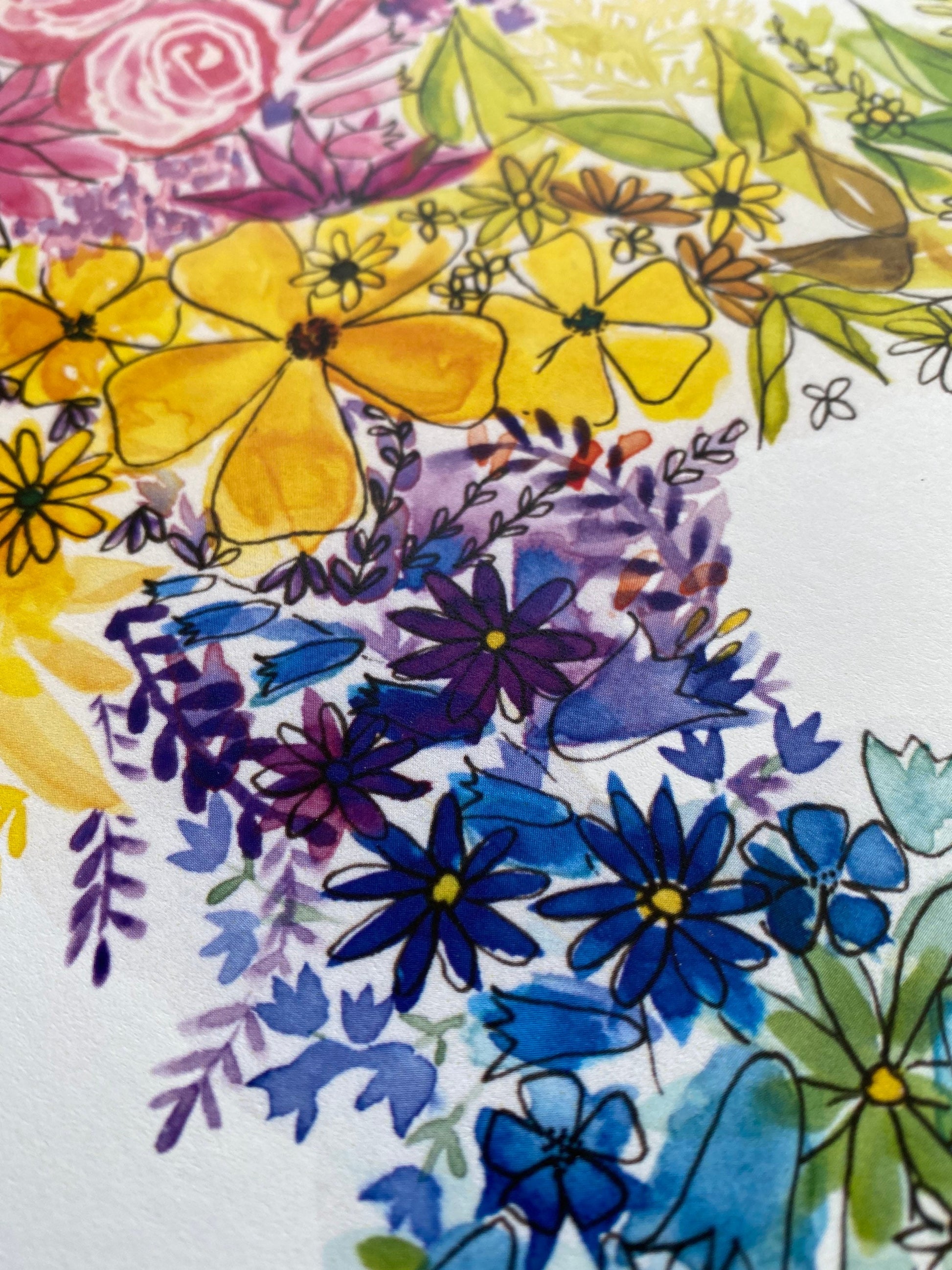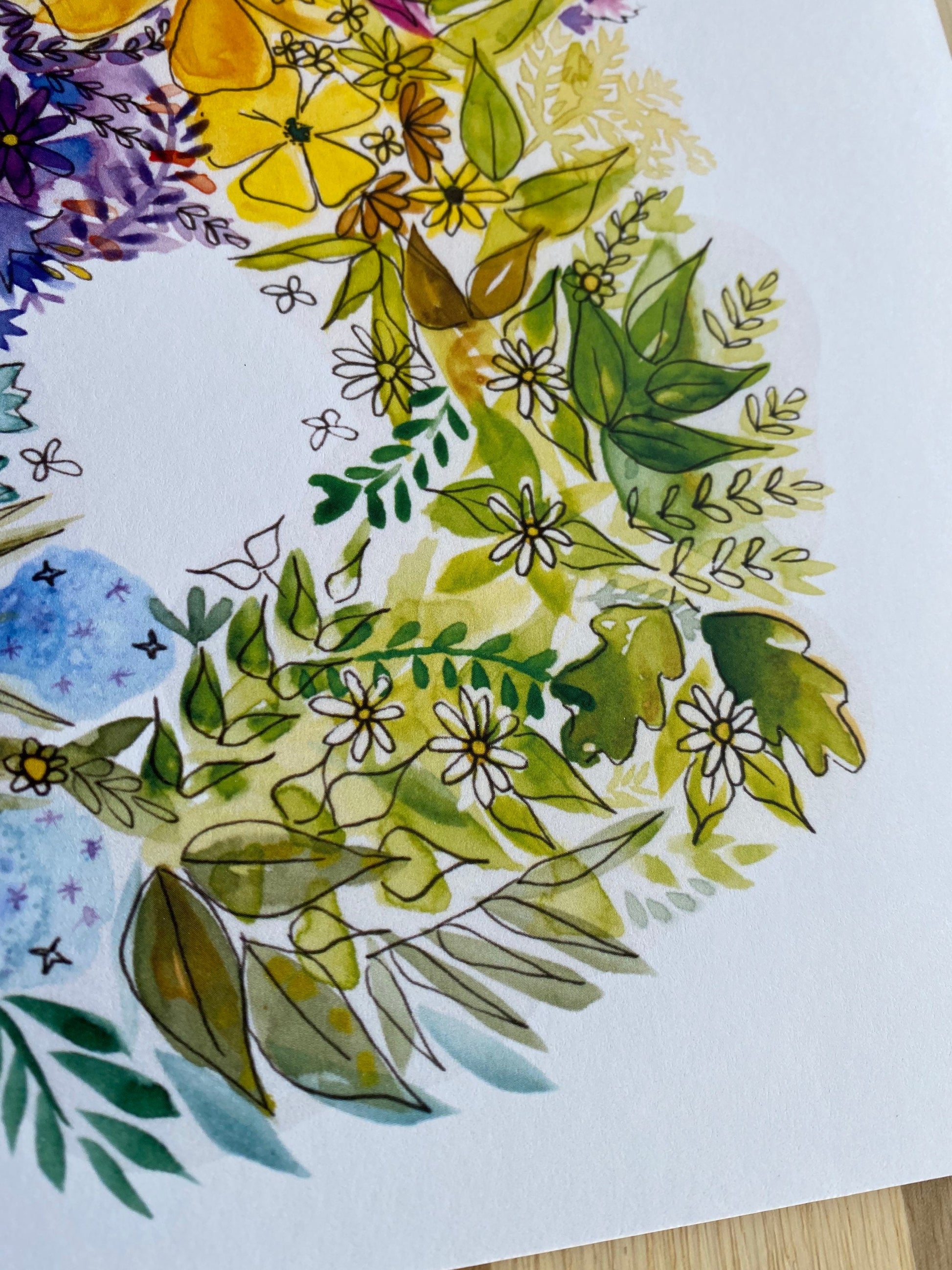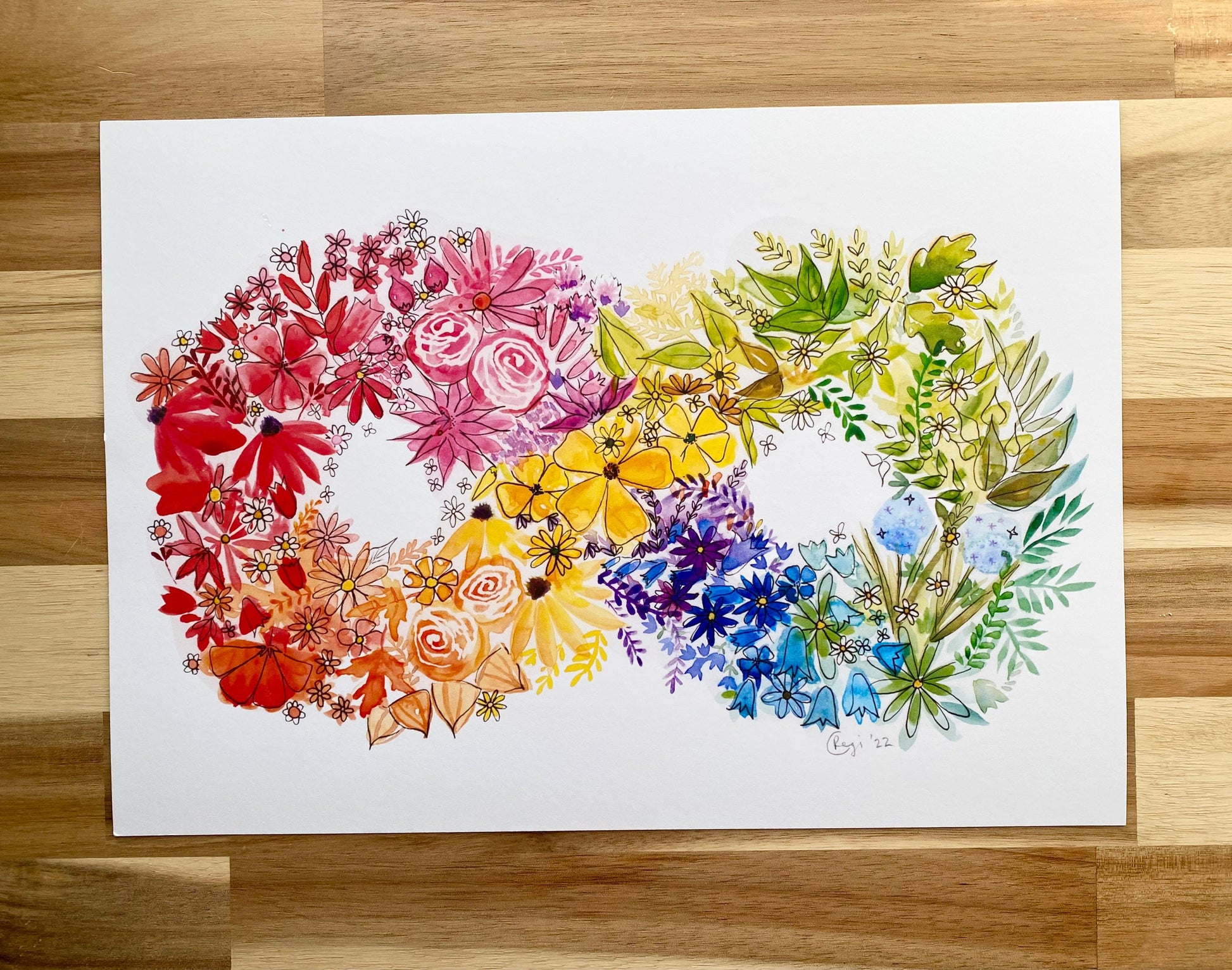 Celebrate neurodiversity with colourful watercolour artwork. This print is bright, happy and full of flowers of every colour - echinacea, buttercups, leaves from my favourite trees, lavender, alliums, daisies, roses and bluebells. It can brighten up your home and would also be ideal as a gift for a friend or teacher.