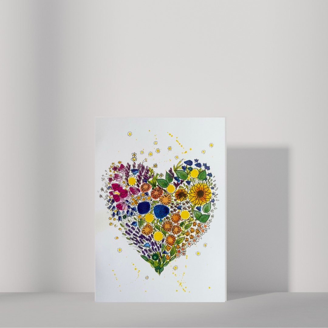 Blank A6 greetings card with a watercolour floral heart design on the front containing a range of flowers including sunflower, allium, fuschia and lavender.
