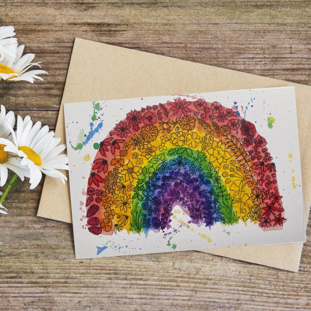 Blank A6 greetings card with a print of a floral rainbow. Perfect for thankyous to healthcare workers, LGBTQ+ celebrations, or welcoming rainbow babies.
