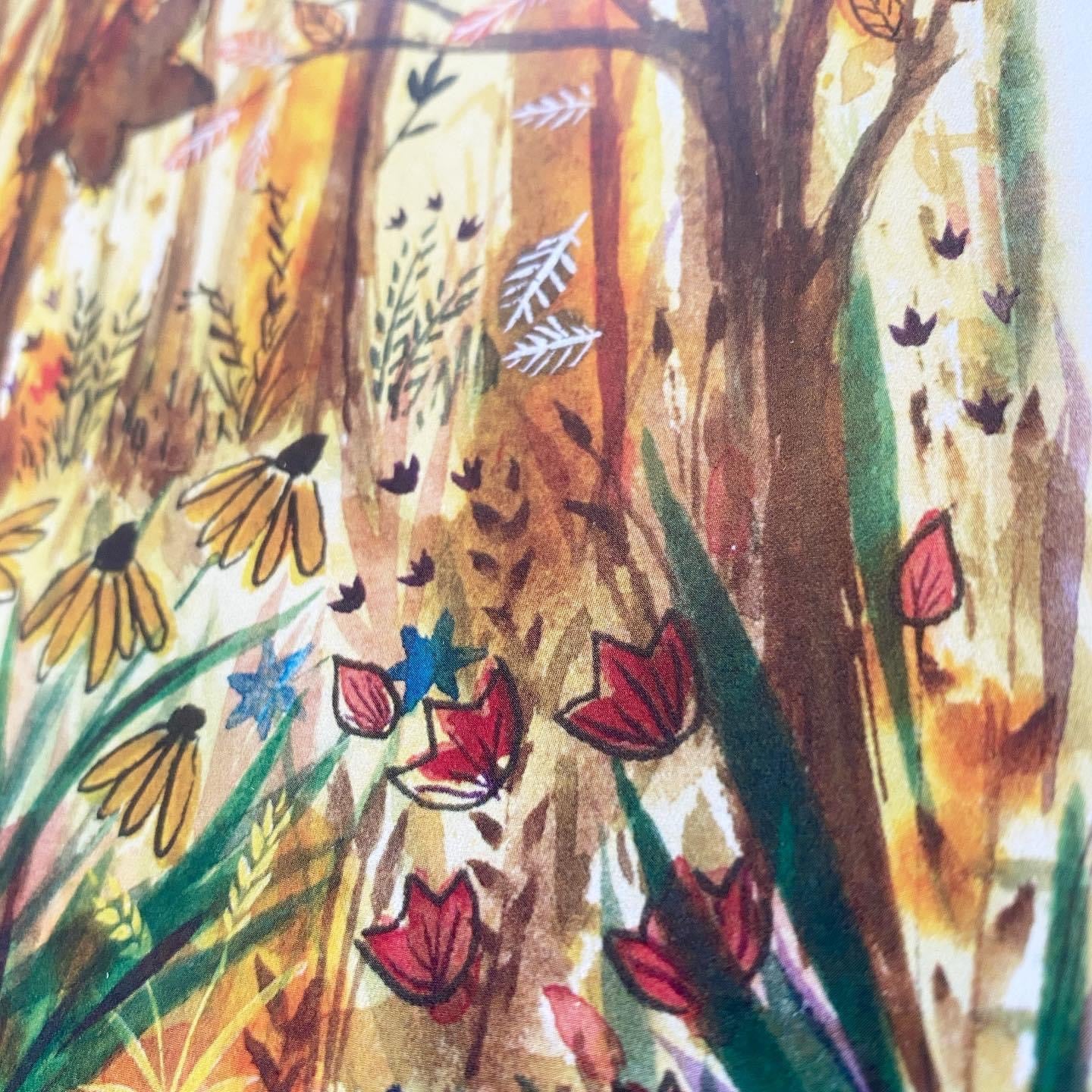 This painting glows with warm sunshine pushing through layers gold, yellow and ochre autumn leaves. There are rudbeckia, wildflowers and grasses filling the base of the painting.
