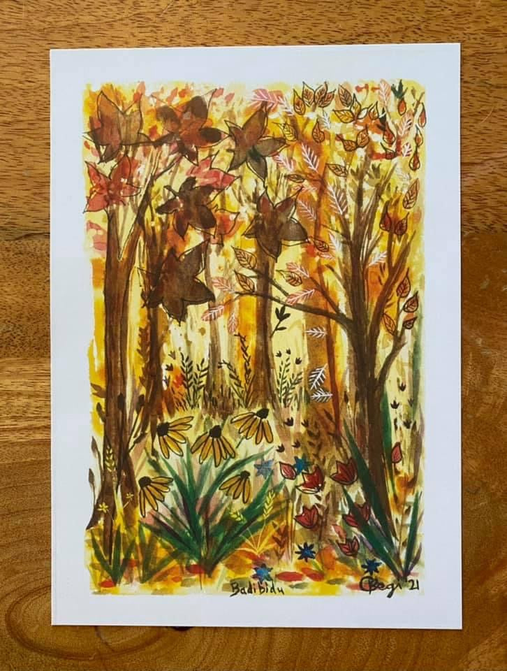 A5 Golden Autumn Light print is a single, A5 print of a watercolour, gouache and ink artwork.