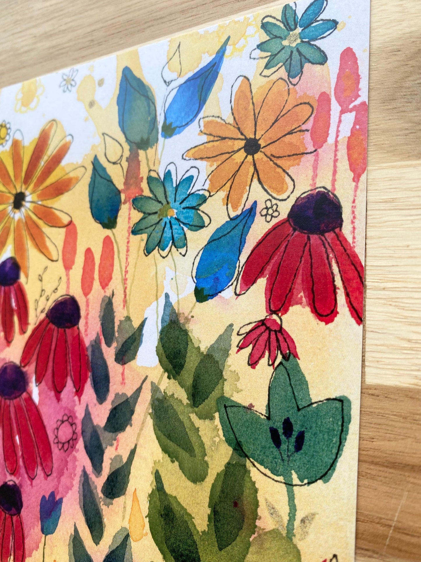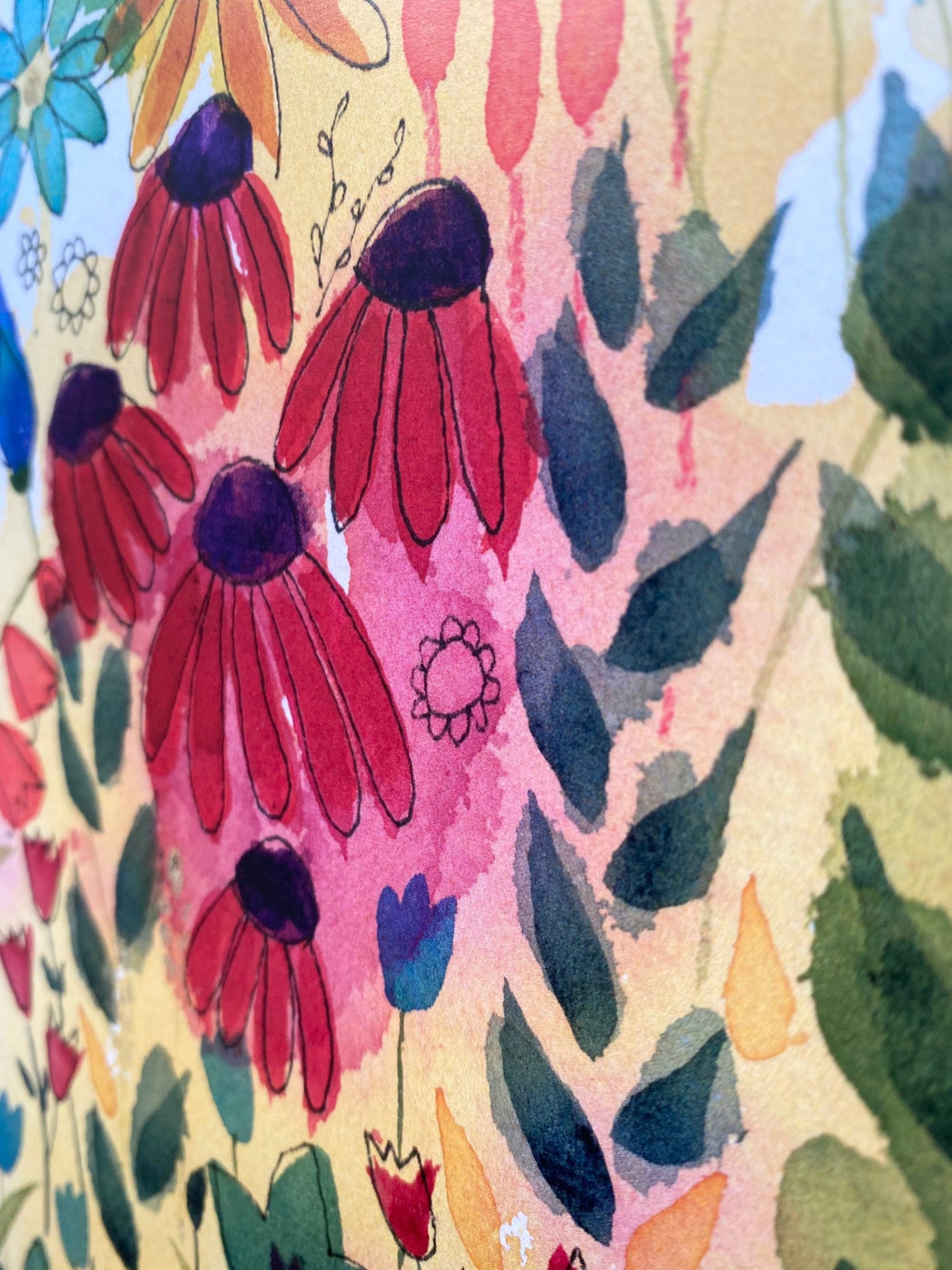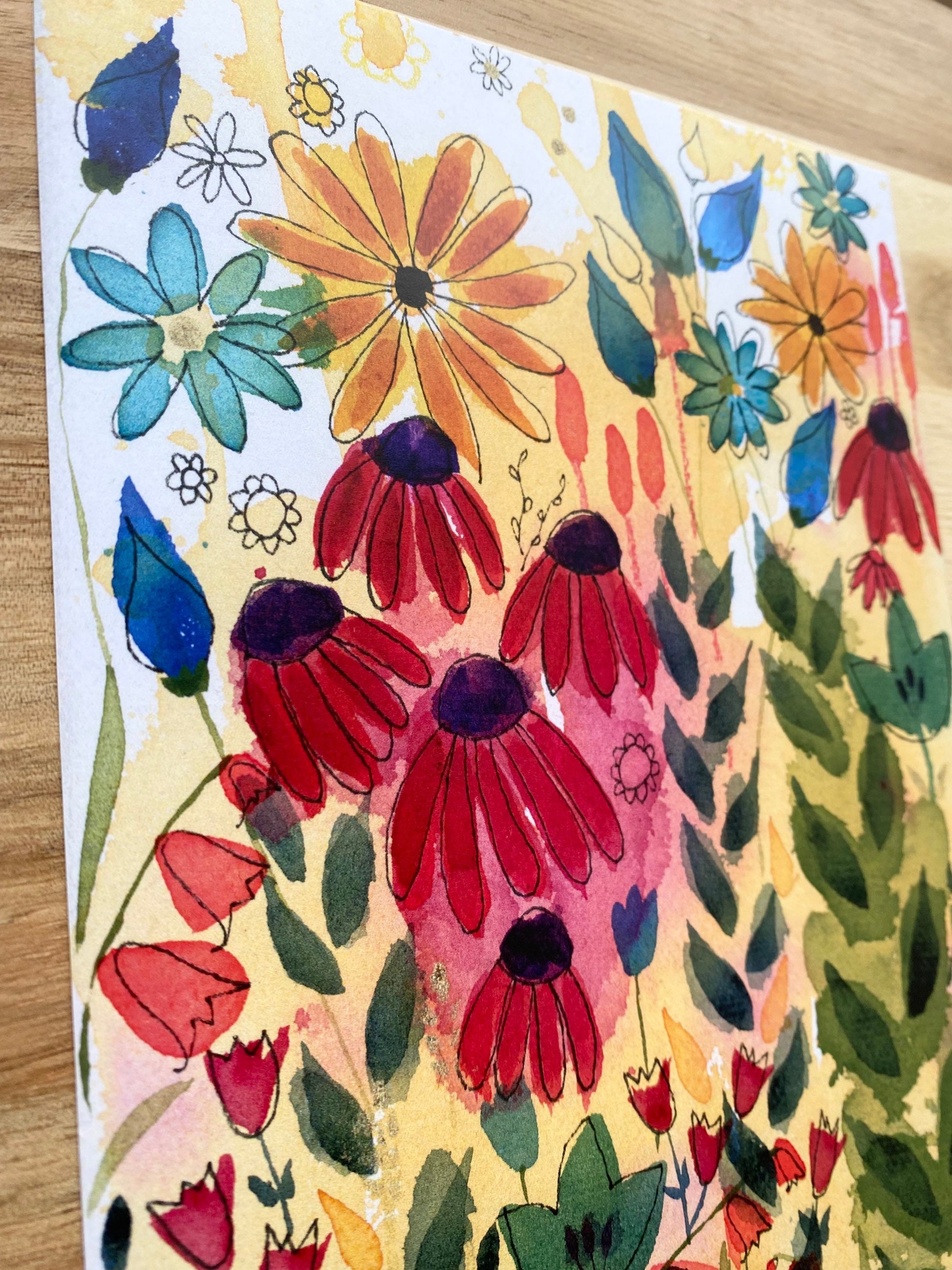 Golden Echinacea is a single, A5 print of a watercolour, gouache and ink artwork which was originally painted onto canvas. This brings amazing texture and a unique style to the painting. The colours are vivid, the warm yellows and cool greens punctuated by bright yellow rudbeckia.
