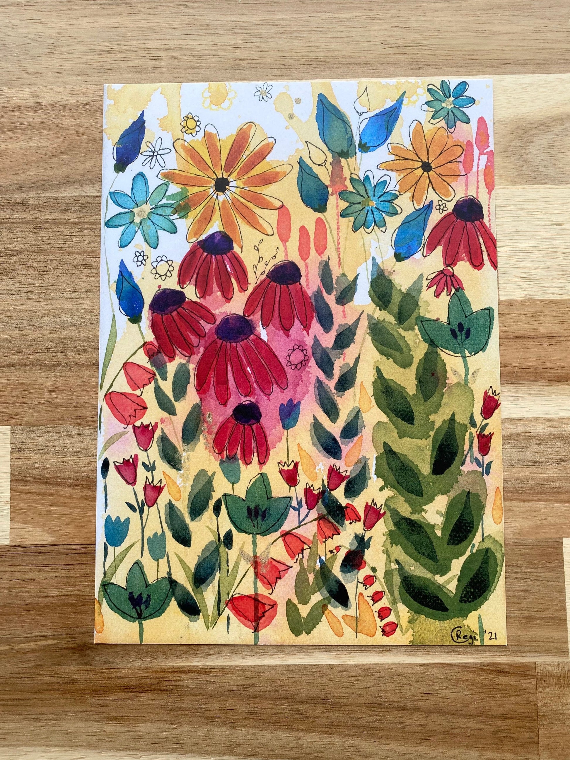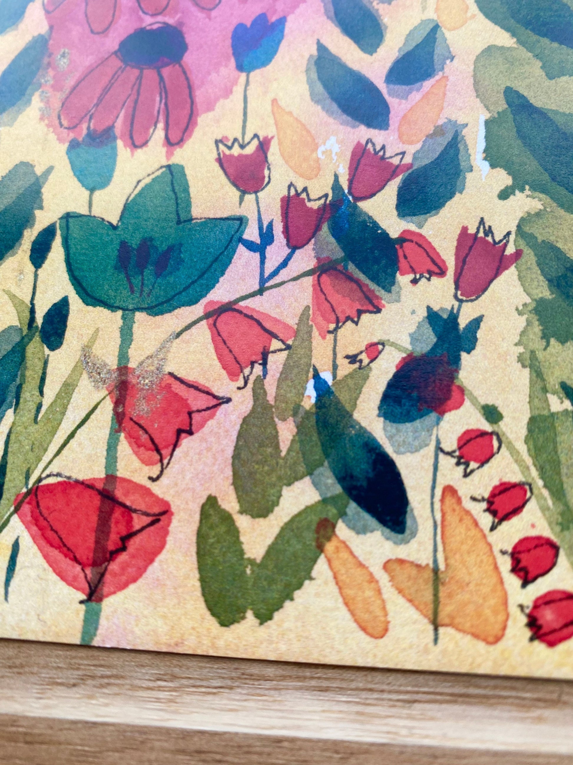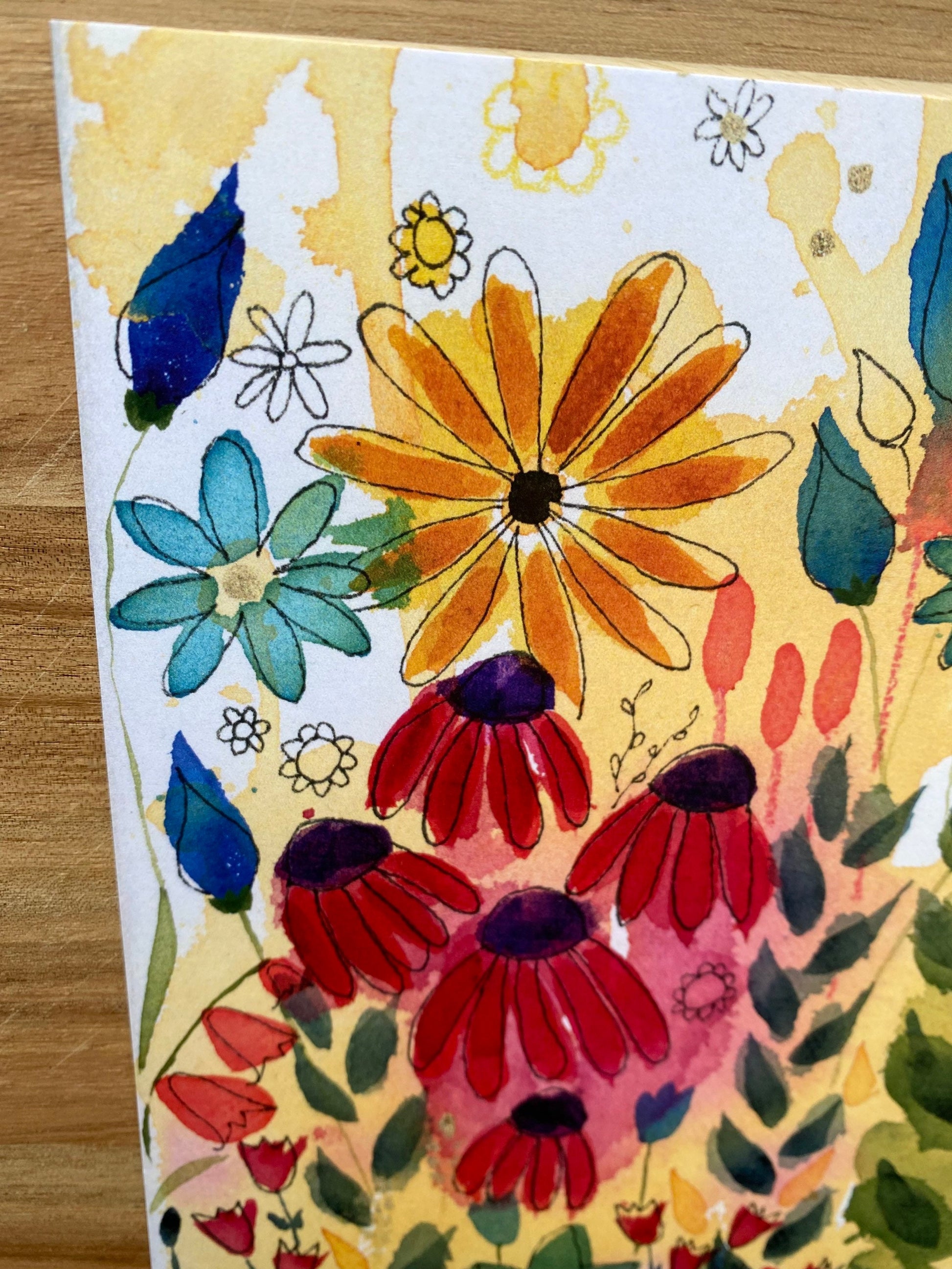 Golden Echinacea is a single, A5 print of a watercolour, gouache and ink artwork which was originally painted onto canvas. This brings amazing texture and a unique style to the painting. The colours are vivid, the warm yellows and cool greens punctuated by bright yellow rudbeckia.