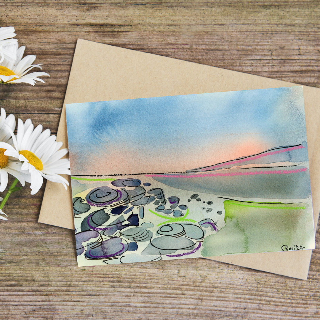 The unique Kinder Scout landscape with a beautiful gradient sky with blues and oranges is a mixed media piece using watercolours, pastels and ink. Pops of pink and bright green bring this original Peak District scene together with spiral stones in the foreground.