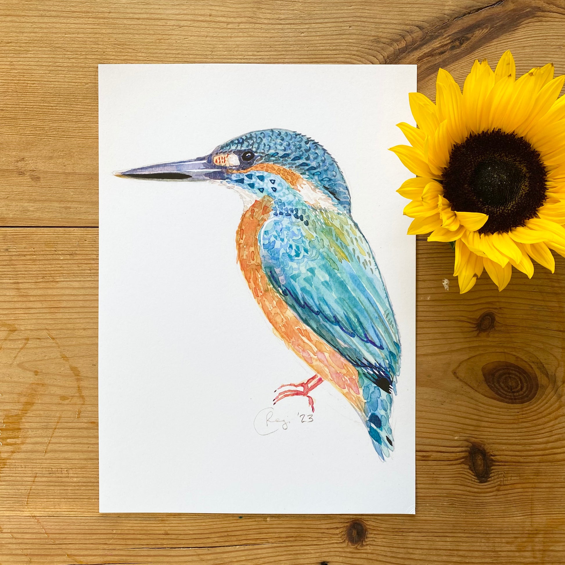 This watercolour kingfisher is full of rich colourful details in its turquoise, teal and orange plumage.