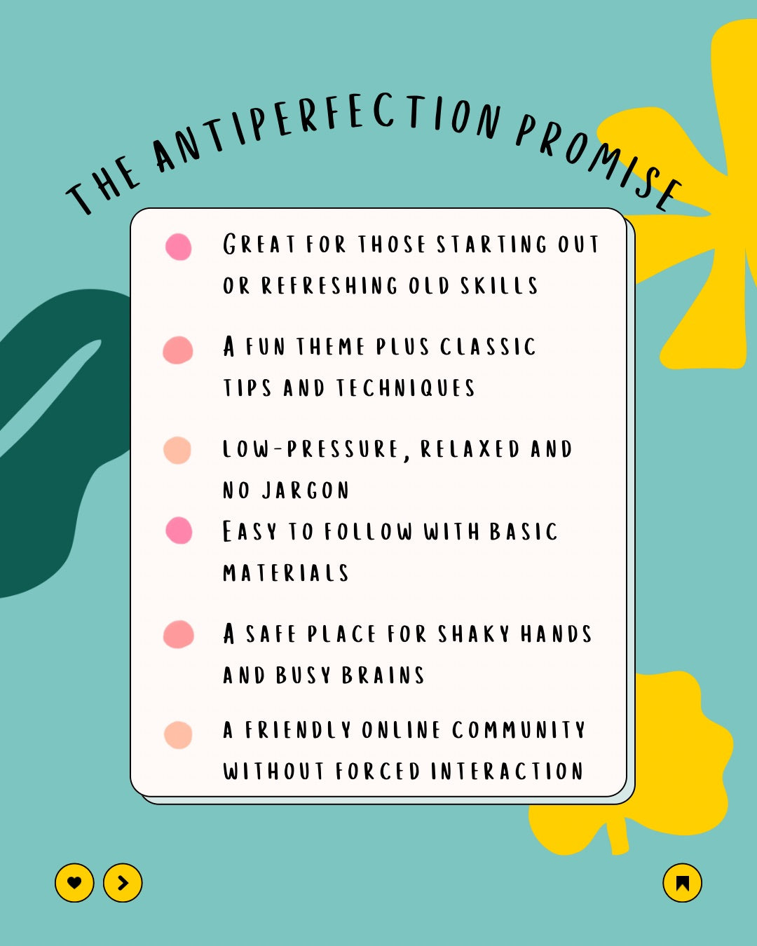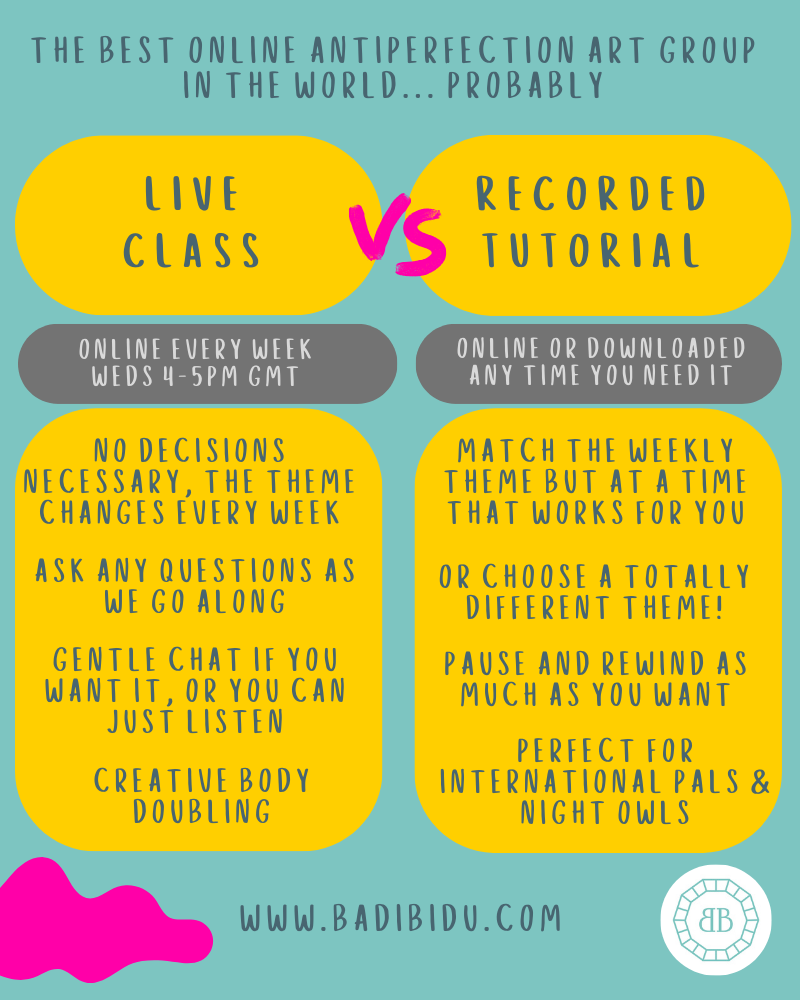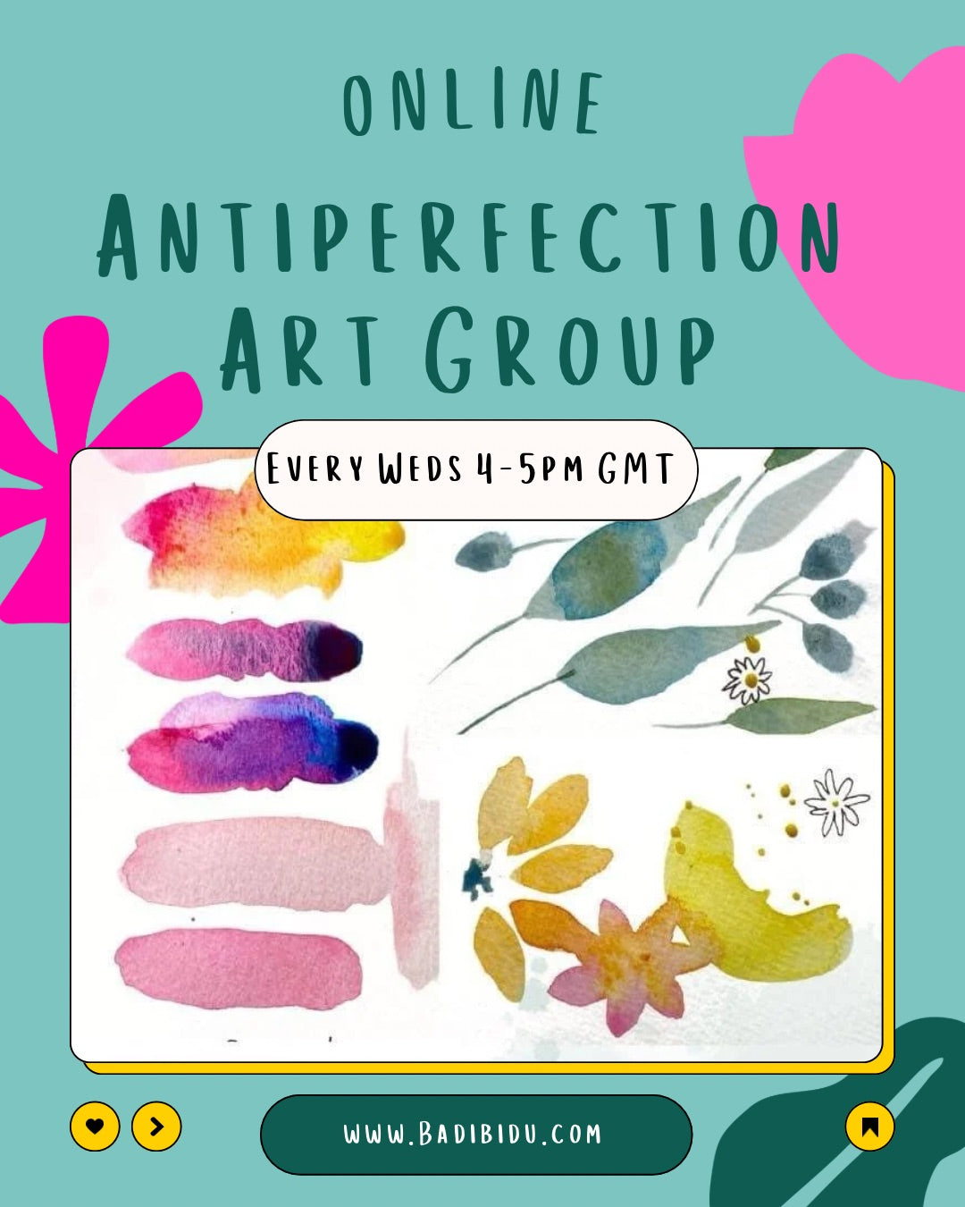 This is a *pre-recorded* virtual session, based on the popular antiperfection art group session which runs live every week with an absolutely lovely gang of attendees. These pre-recorded sessions are approximately 30-40 minutes long, but you can re-watch them and hopefully they will set you off full of inspiration for as long creating as you need.