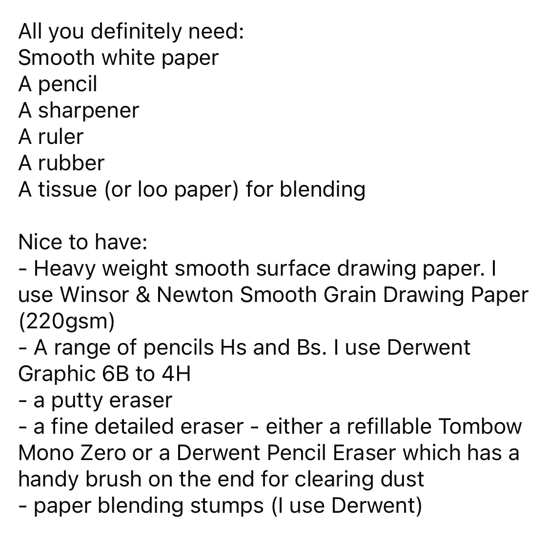 All you need is an HB pencil (or whatever you have), a piece of smooth white paper, a rubber, a pencil sharpener and a small ruler.