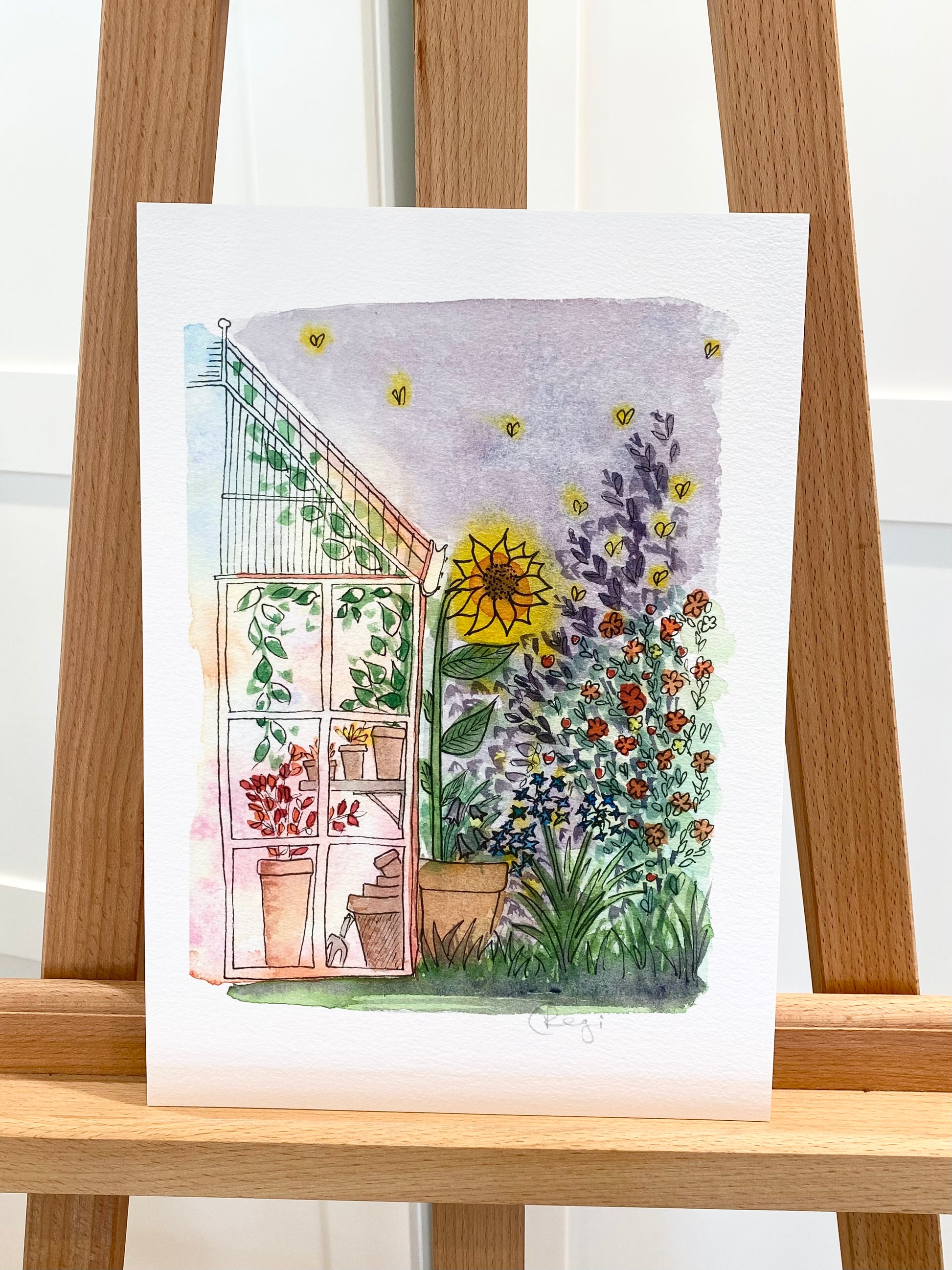 This artwork has been so popular that for this limited edition print I've taken the size up to A4 to make it even more striking. This was one of my first paintings sold as Badibidu and it seems to really resonate with gardeners and plant lovers as a little haven on a dark evening.