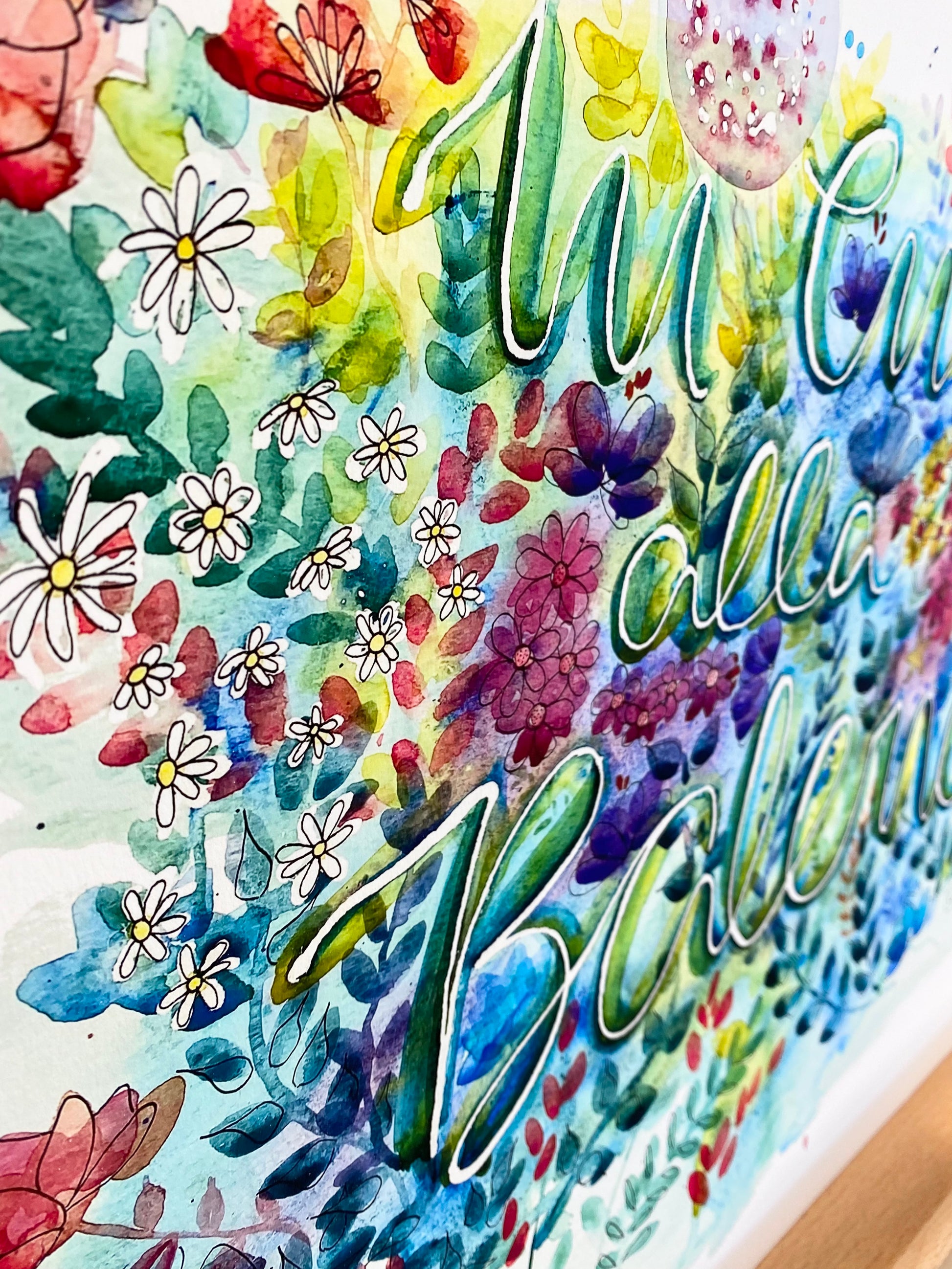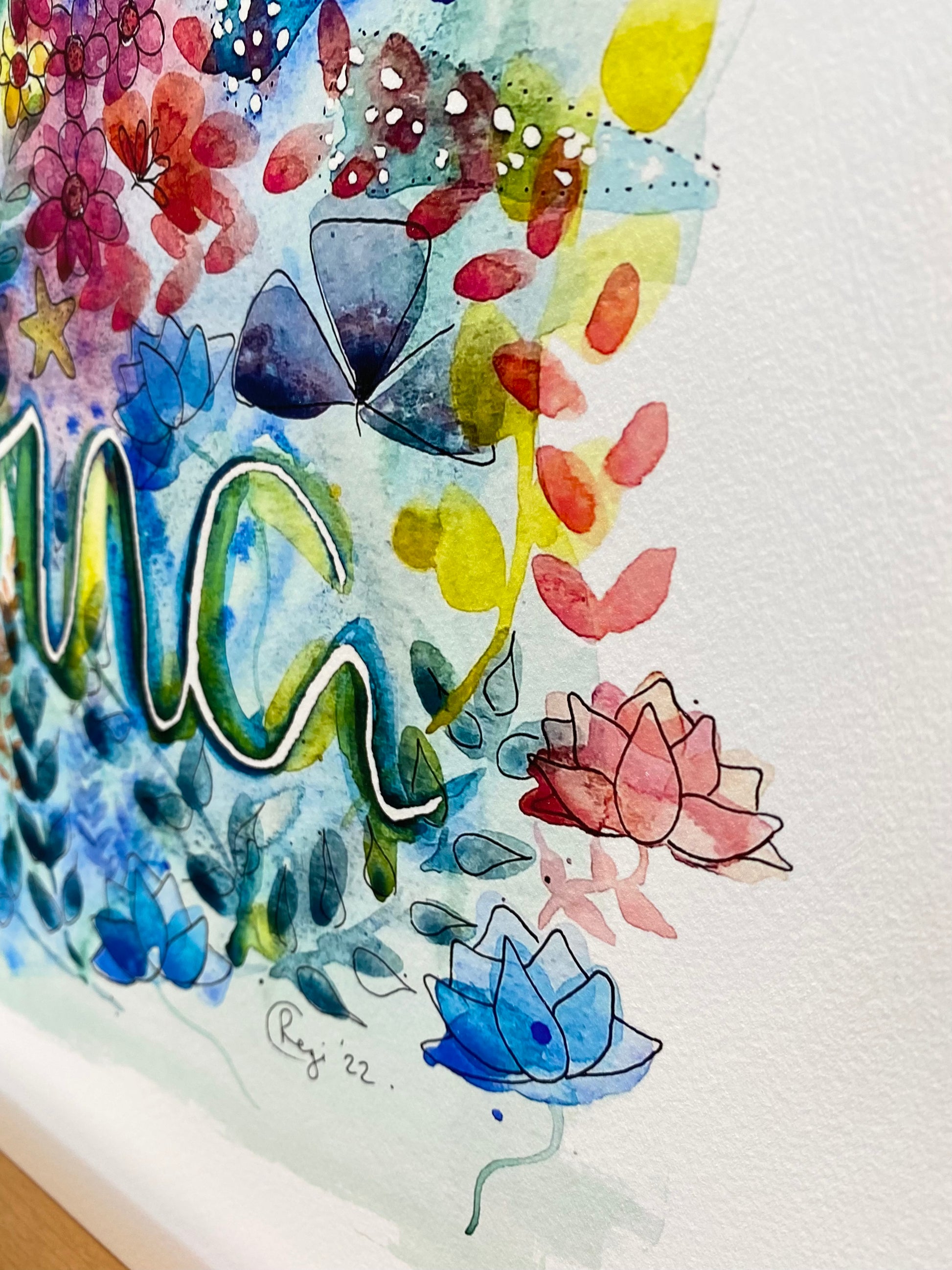 The flowers included are all based on pond and ocean underwater plants, and the wet painting process really adds to the watery theme. The watercolours used all have deep vibrant colours and some details are added in ink.