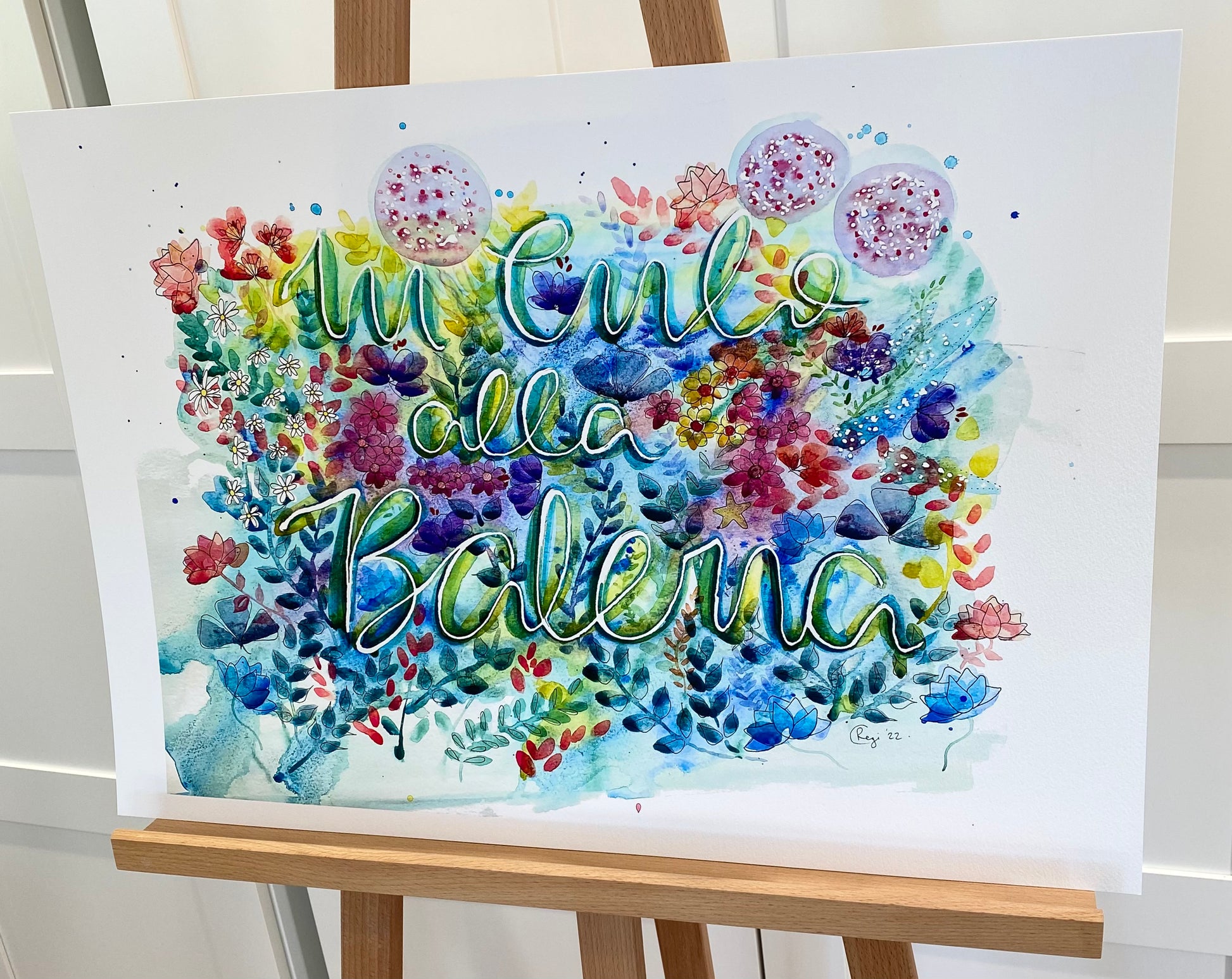 This watercolour and ink painting says 'In Culo all Balena' which means good luck in Italian... it actually means 'up the bum of the whale' and the correct response is 'lets hope it doesn't poo!', so that's a talking point!
