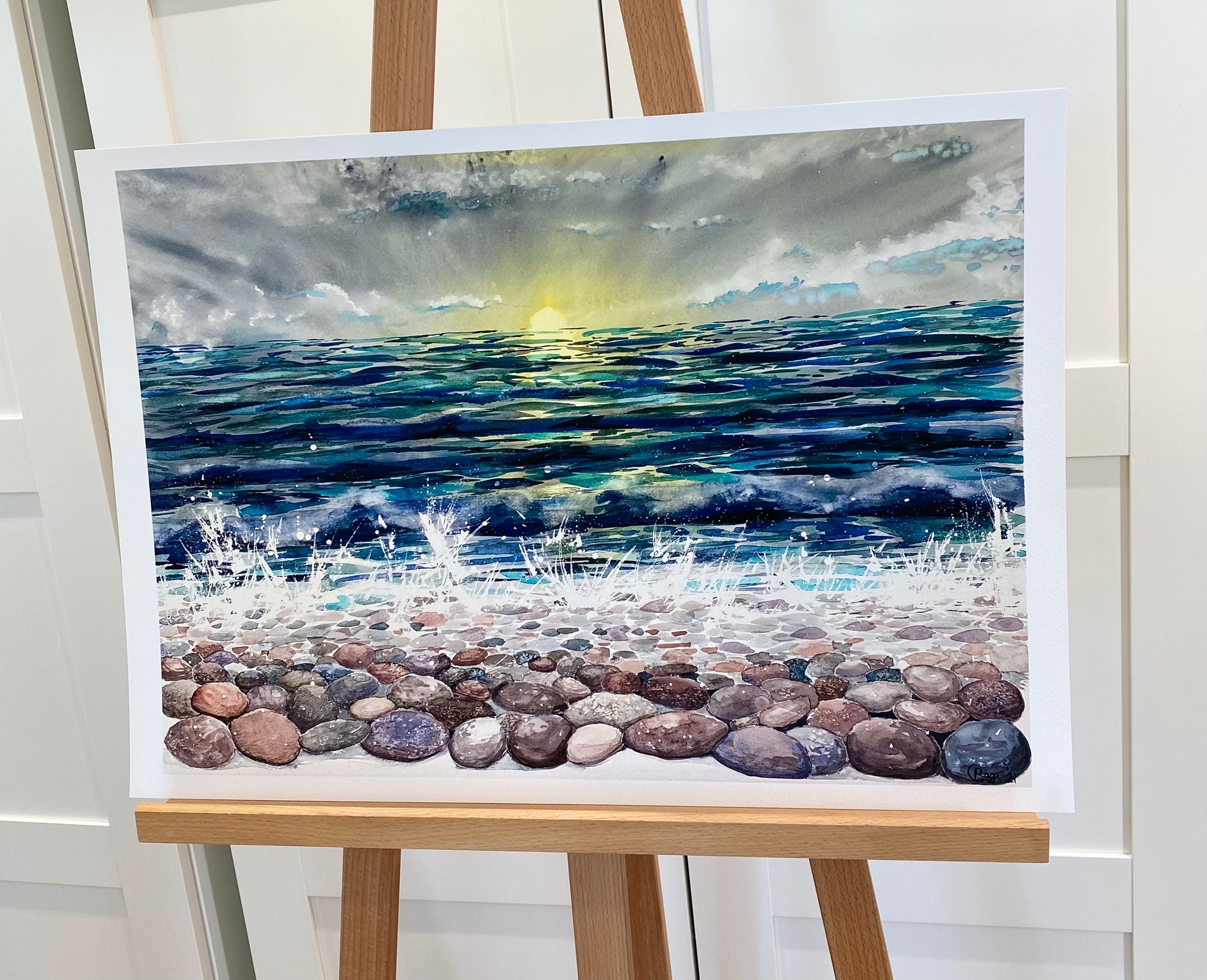 This painting has a fresh morning sun rising over a calm ocean full of blues and greens. The pebbles have a realistic finish and provide endless details to look at. The watercolours used all have deep vibrant colours and some details are added in ink.
