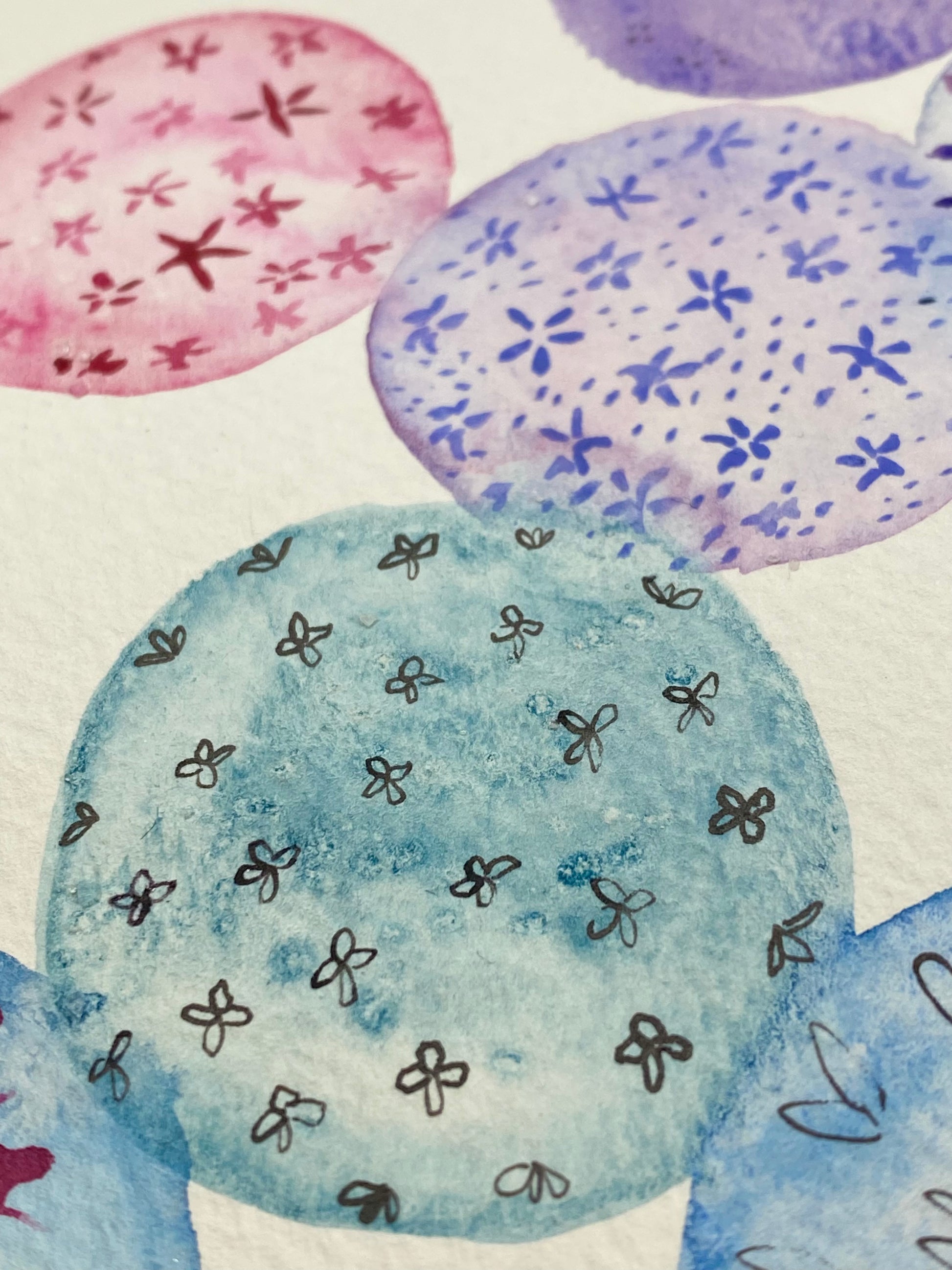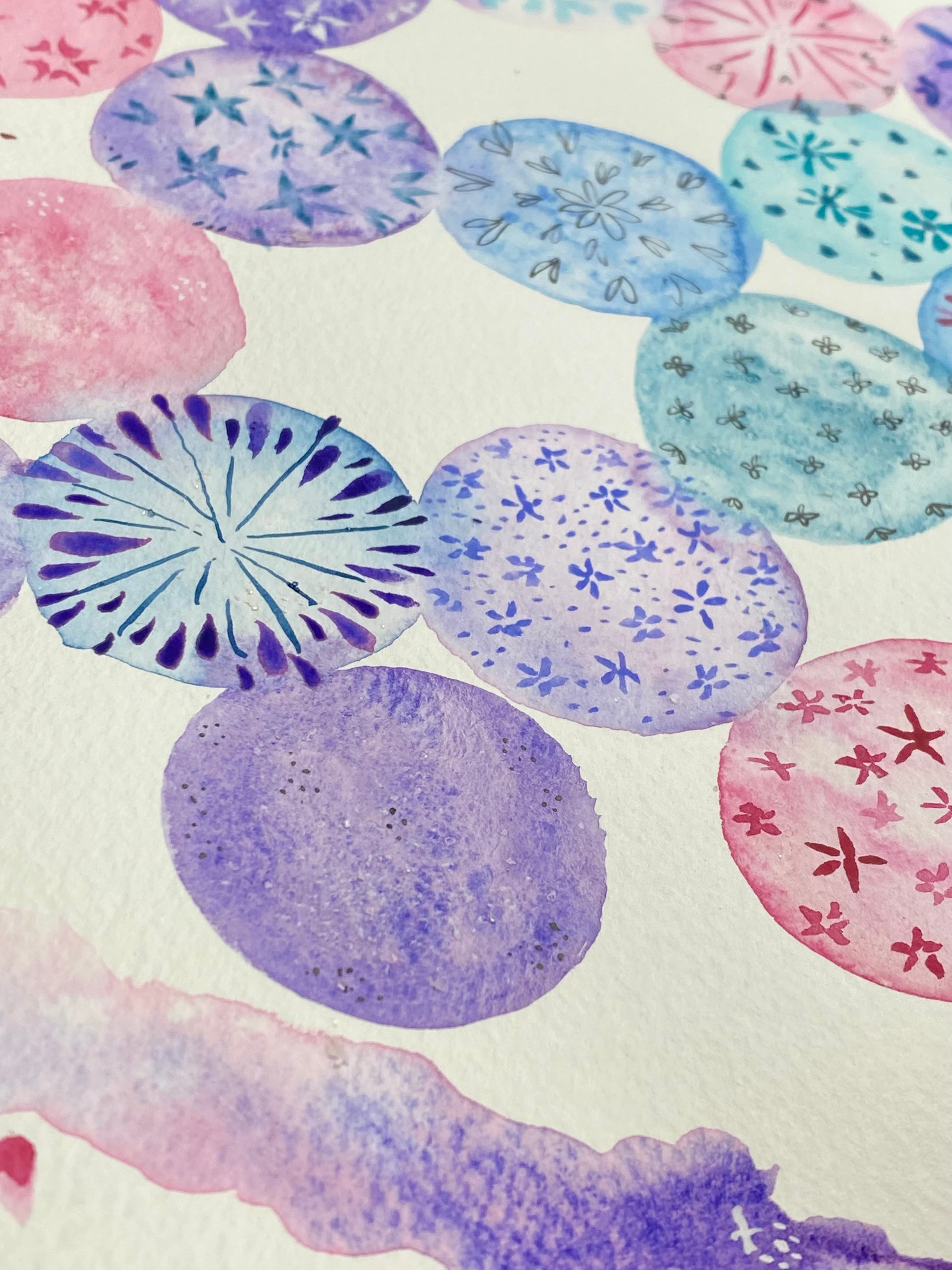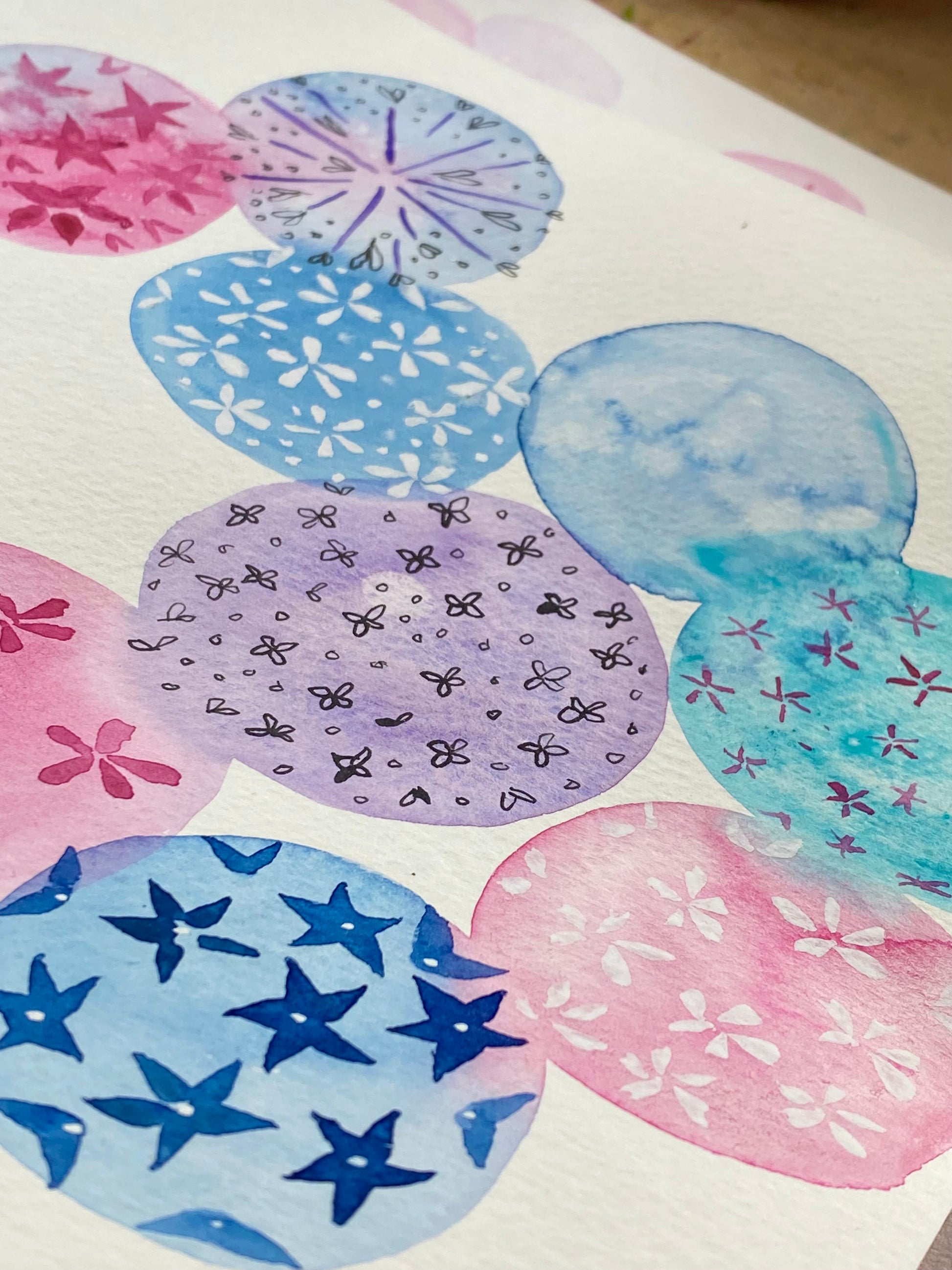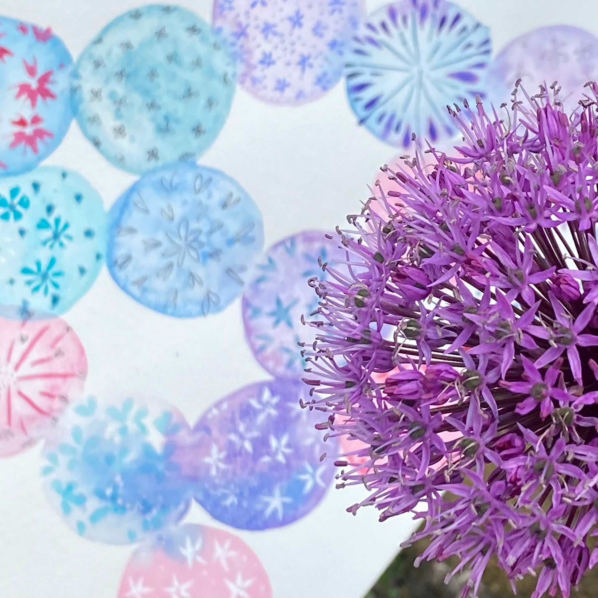 Magical Alliums is based on the antiperfection circles tutorial, a favourite amongst attendees for relaxing and practicing letting go and enjoying the process. Lots of loose, colourful painting followed by lots of doodling on top. Great for all ages and one to be repeated whenever you need to slow the brain.