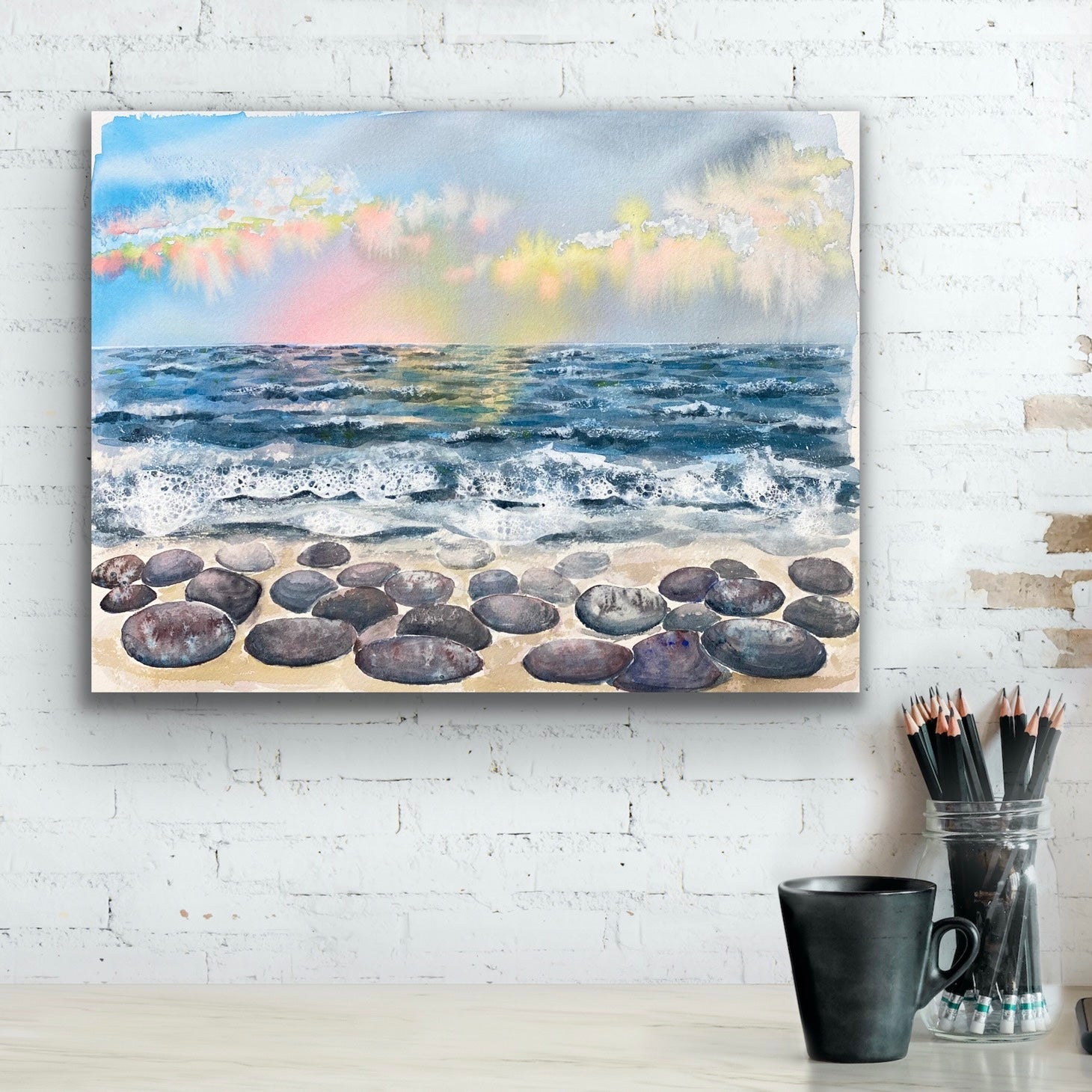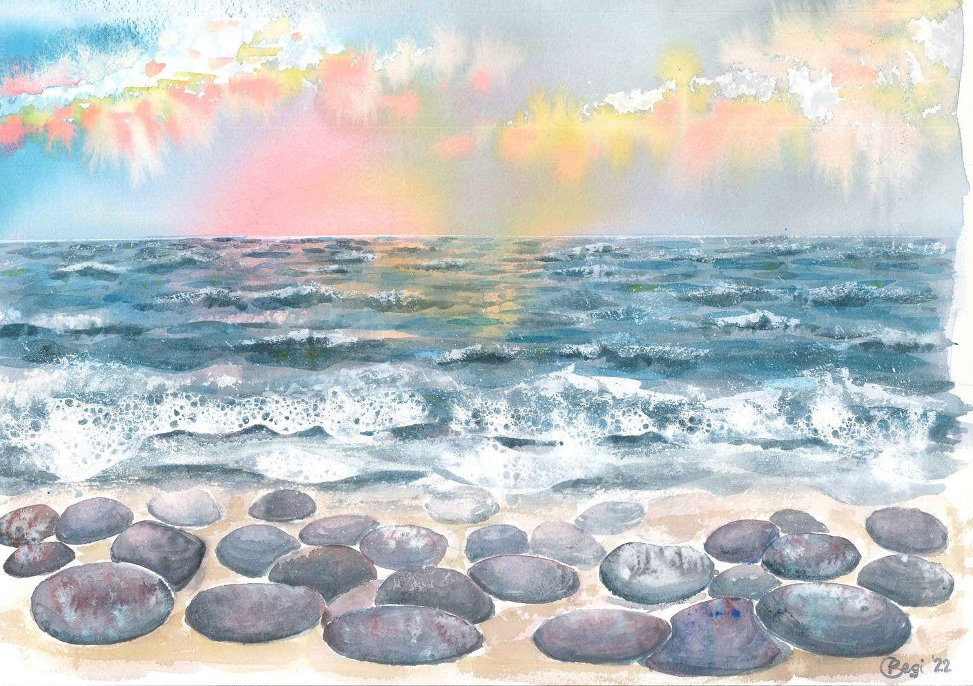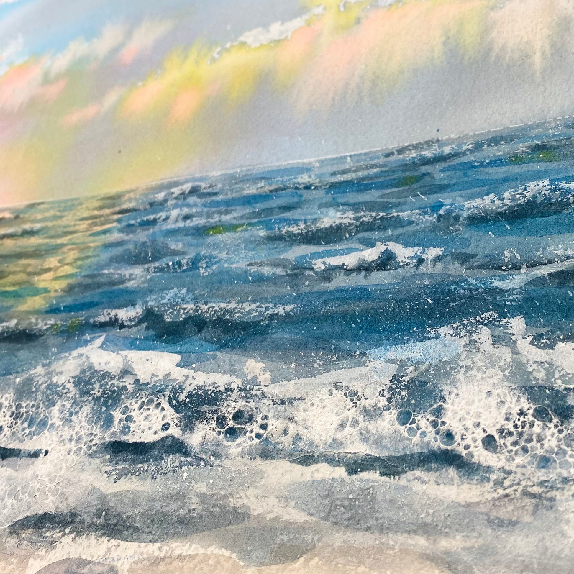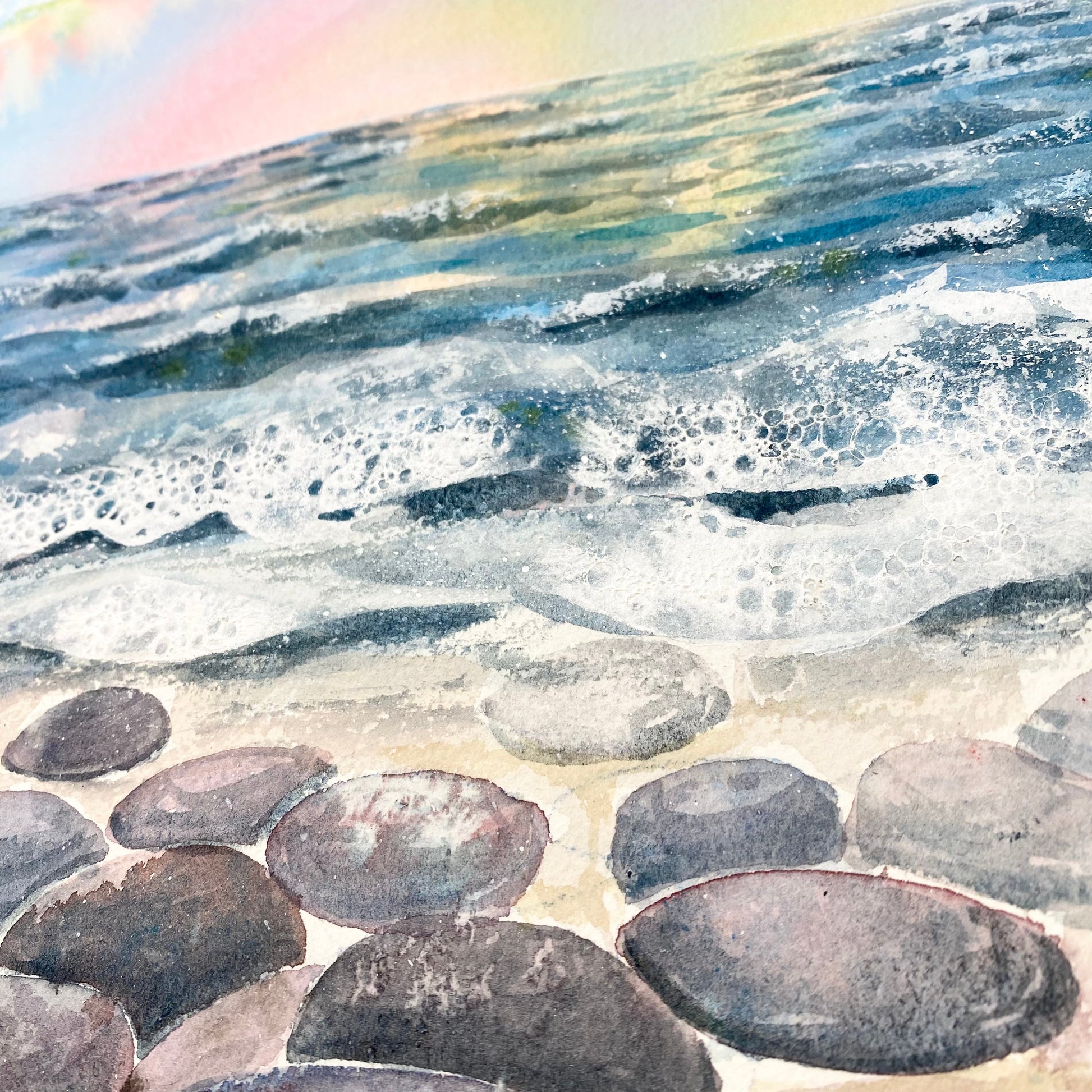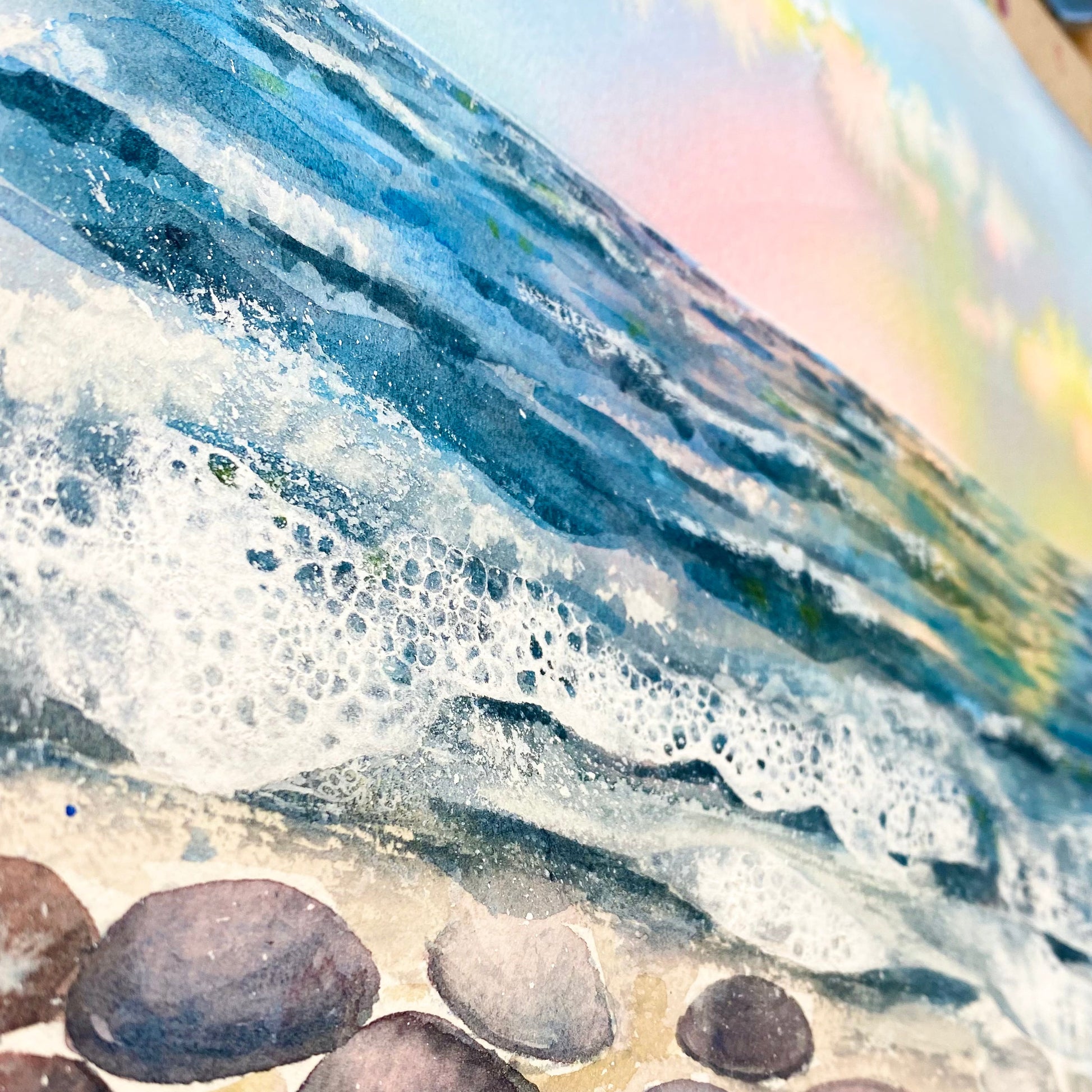 This watercolour shows an ocean with a gentle neon dawn glowing from over the horizon. Sea foam and pebble details complete the calm feel of the painting.