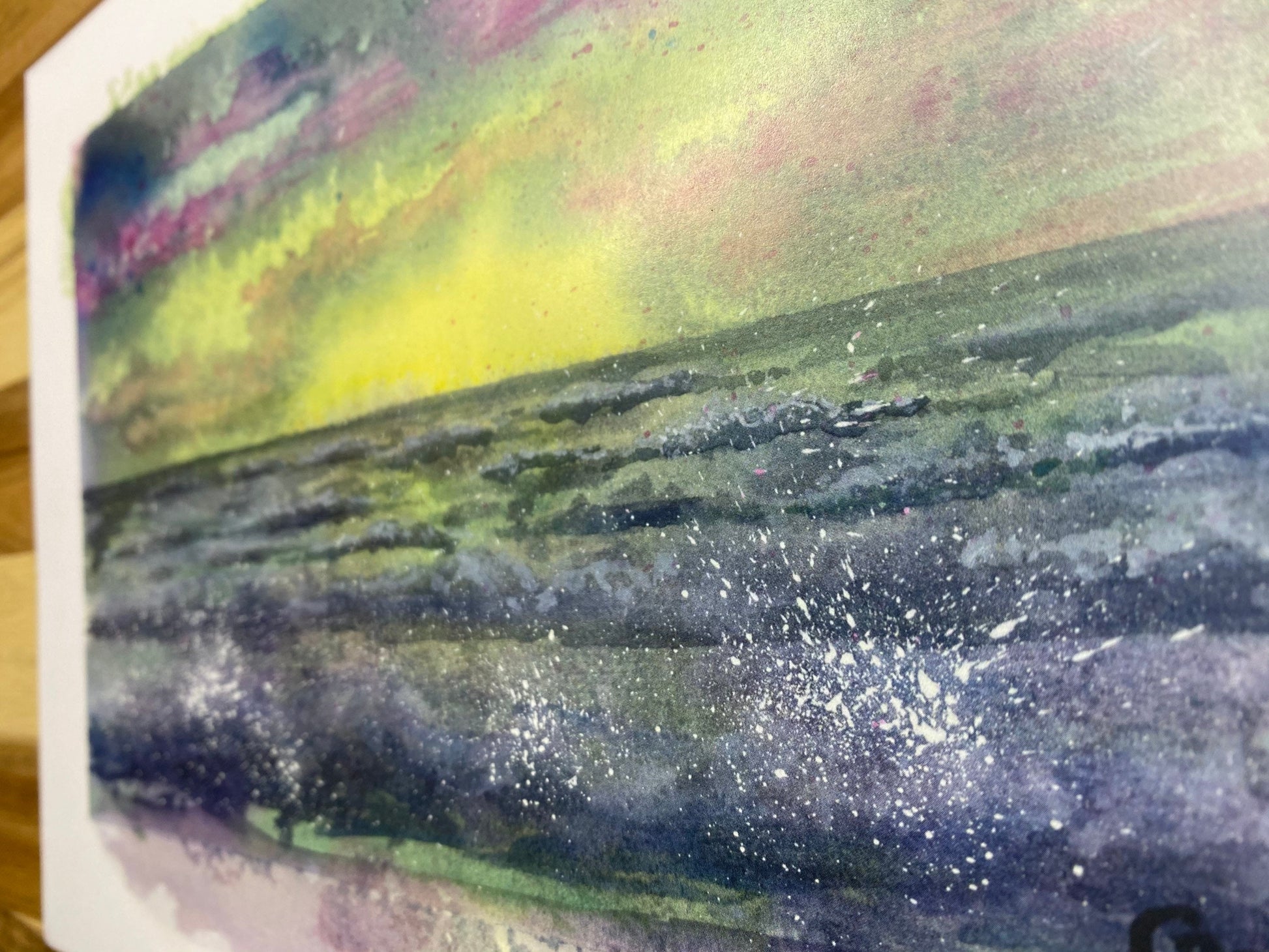 Ocean Sunrise is a single A4 print of a watercolour and gouache artwork. This painting has a bright sun rising over an ocean of gentle waves.