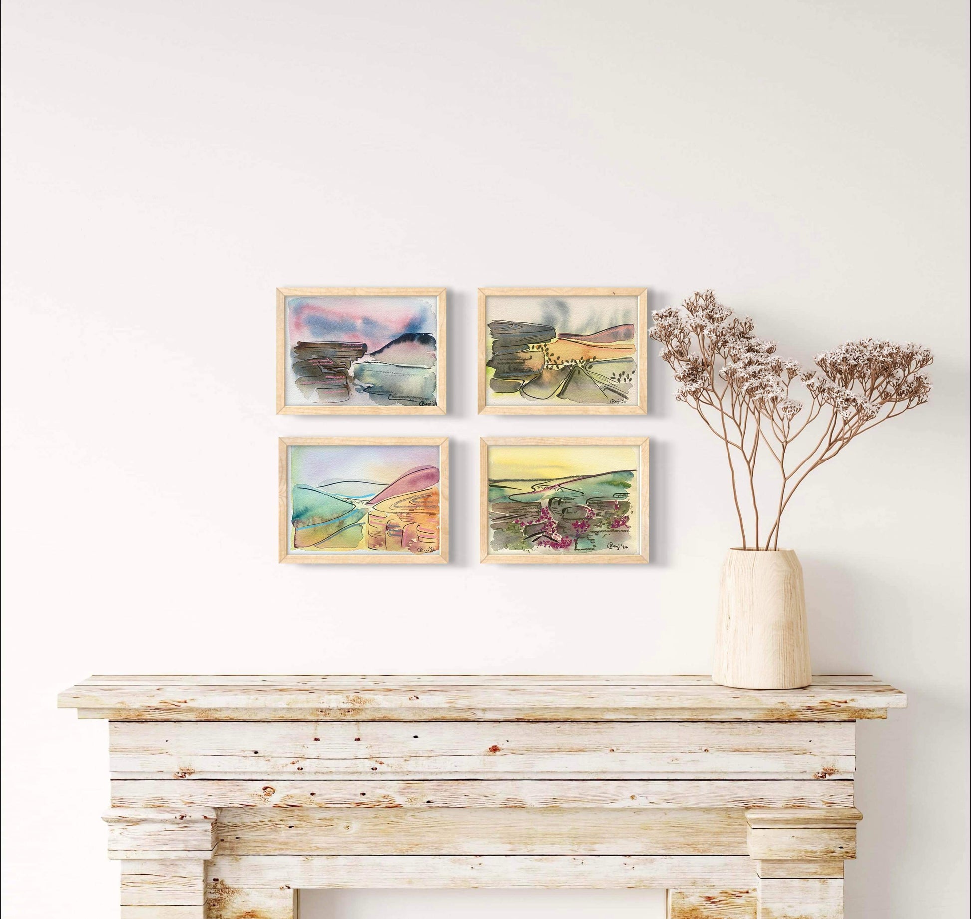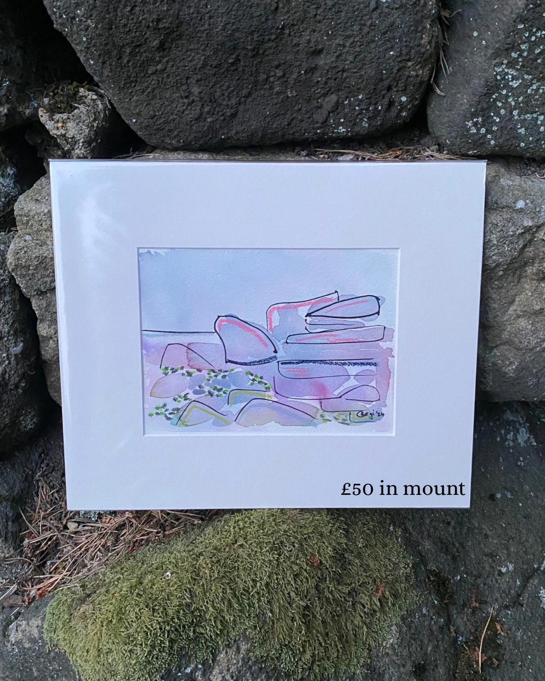 Using gentle washes of lavender, pink and blue, this peaceful landscape inspired by the Peak District is a mixed media original using watercolour, pastels and ink. The perfect piece to bring some calm in to a space.