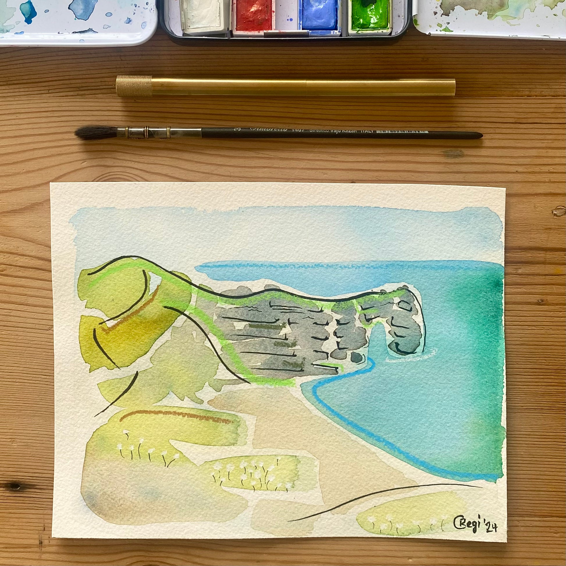 A distinctive landmark of the Dorset landscape, Durdle Door is a beautiful element of the Jurassic coast. Captured here in vibrant watercolours with accents in pastels and ink, this abstract landscape is an original artwork.