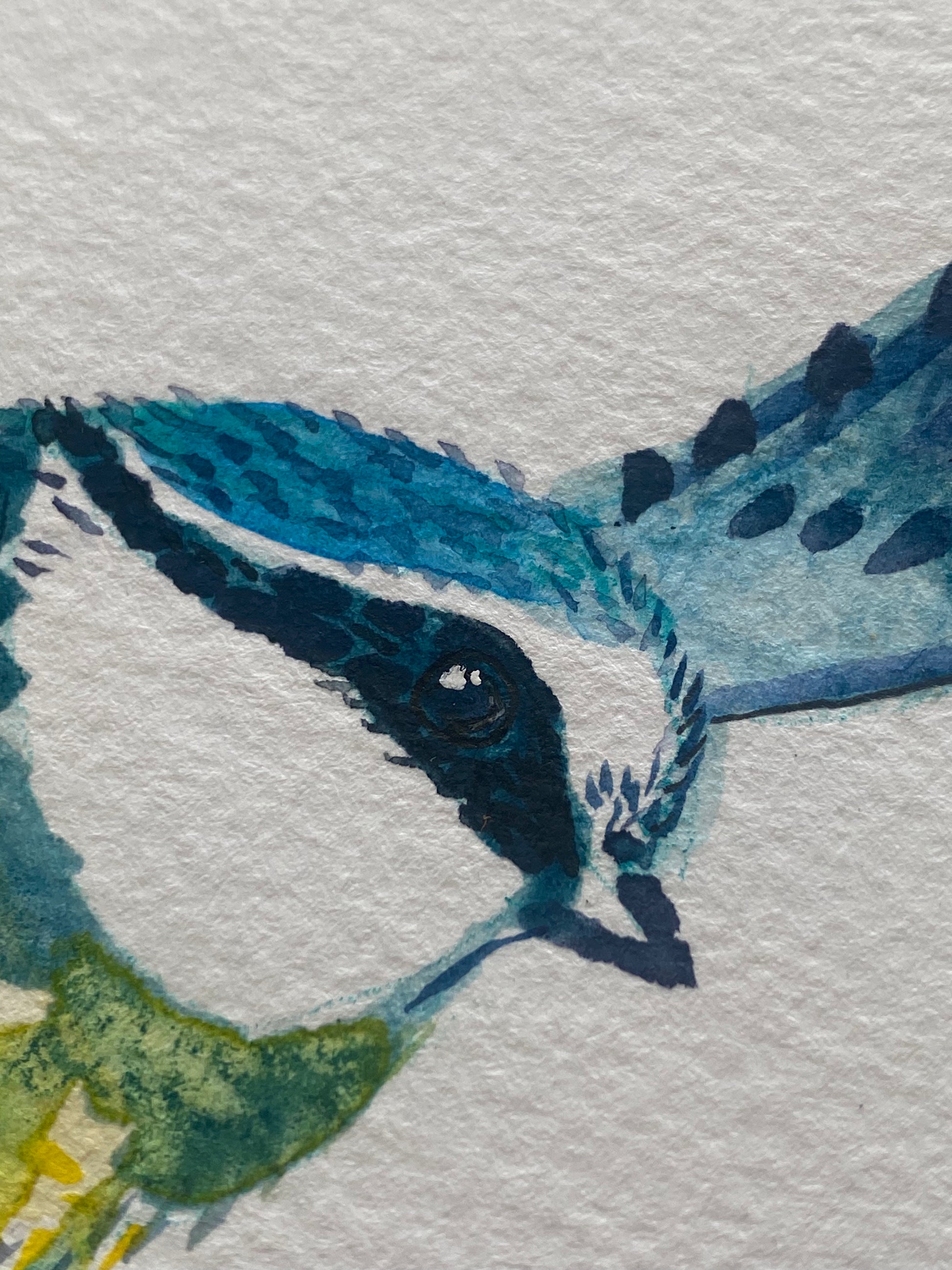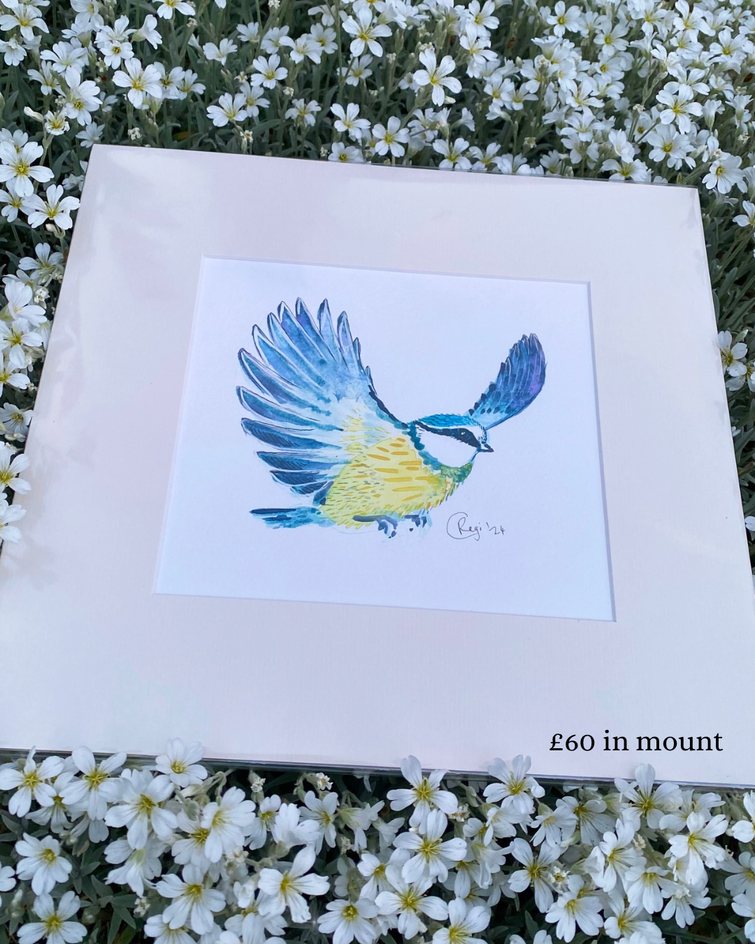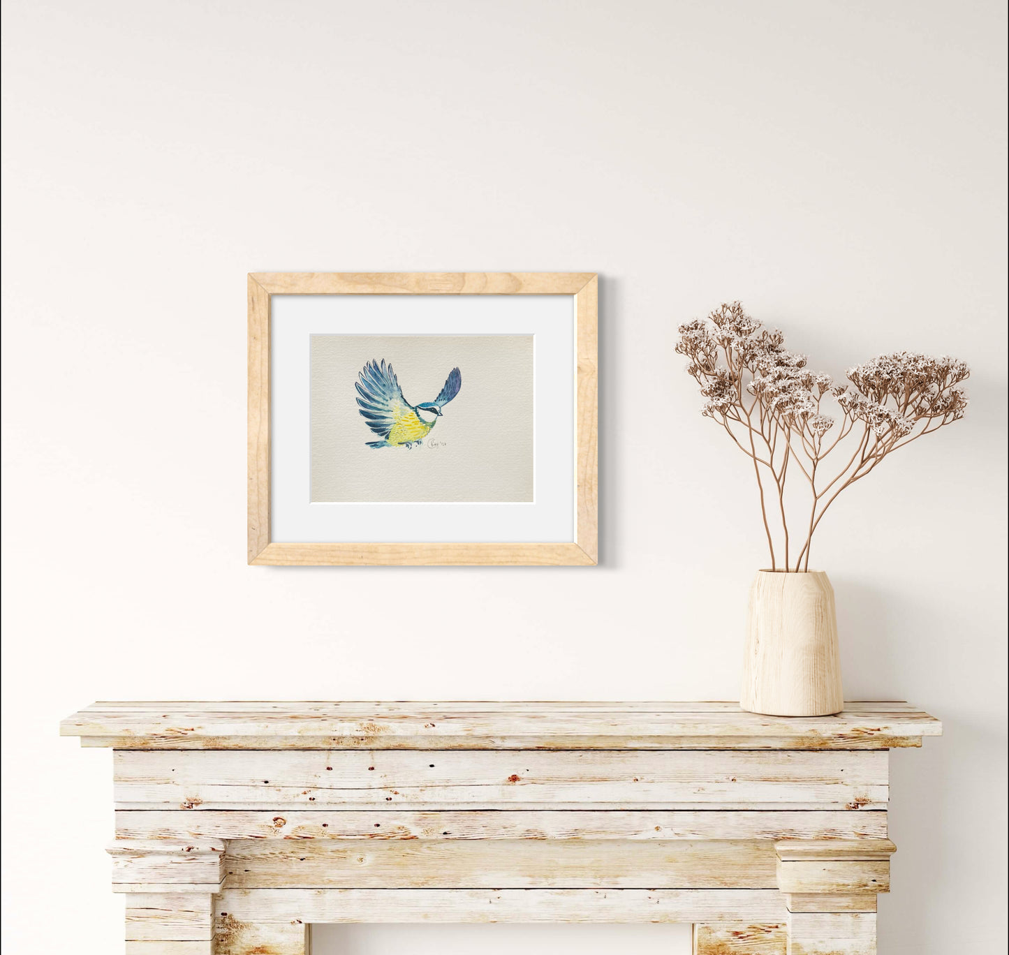 With layers of vibrant yellow and blue, this stunning blue tit in Fly At Your Own Pace is a watercolour original with mixed media accents. Spot the subtle pops of purple and green that enhance the depth of this piece.