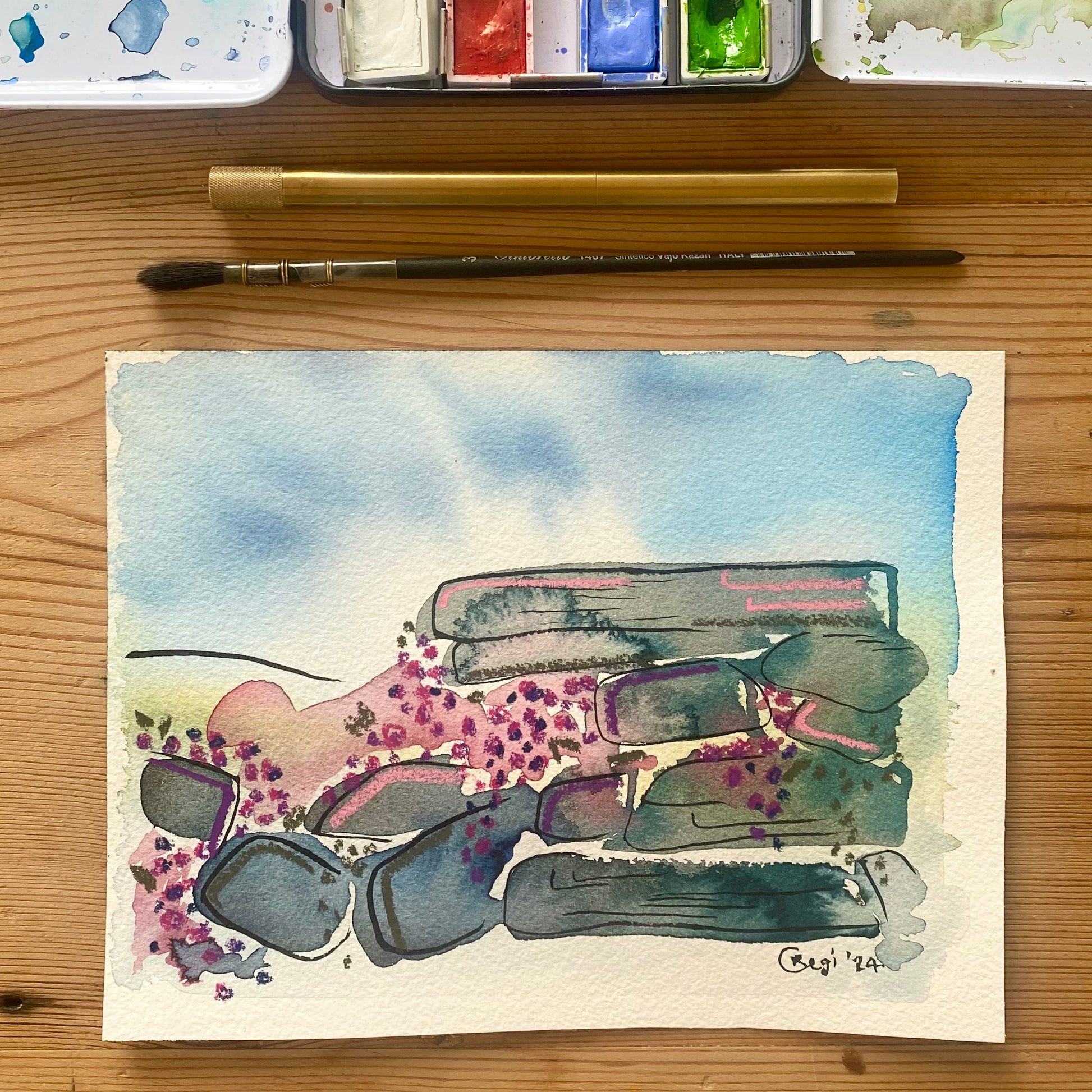 Using vibrant magentas to capture the beautiful heather against the deep greens and greys of Bamford Edge in the Peak District; this abstract landscape is a mixed media piece using watercolour, pastels and ink.