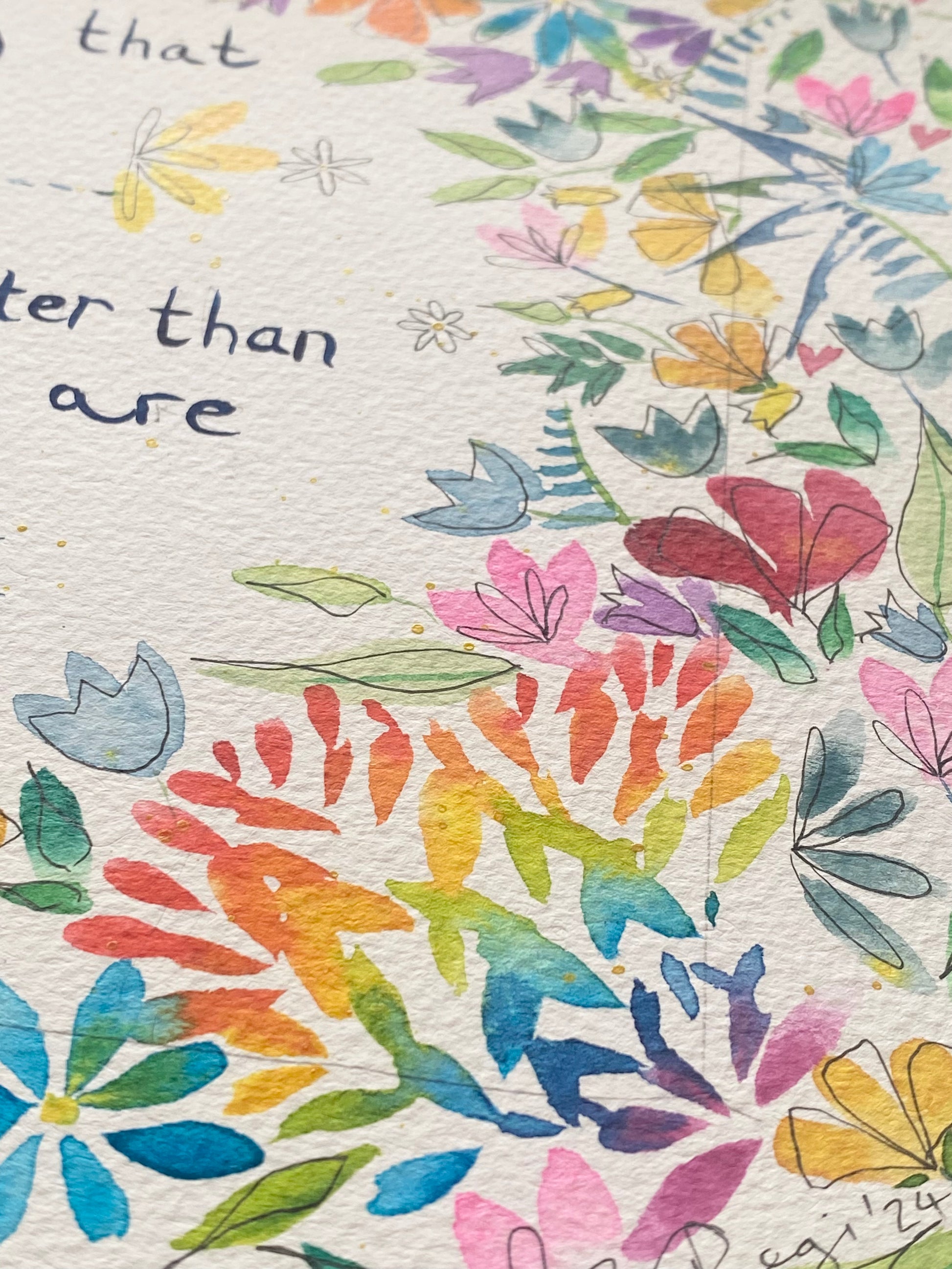 My paintings are created in layers of watercolour, gouache and ink. High-quality paints and 300gsm acid-free paper ensure the colours are vibrant. Please note that some colours may look different on varying computer screens compared to natural light.