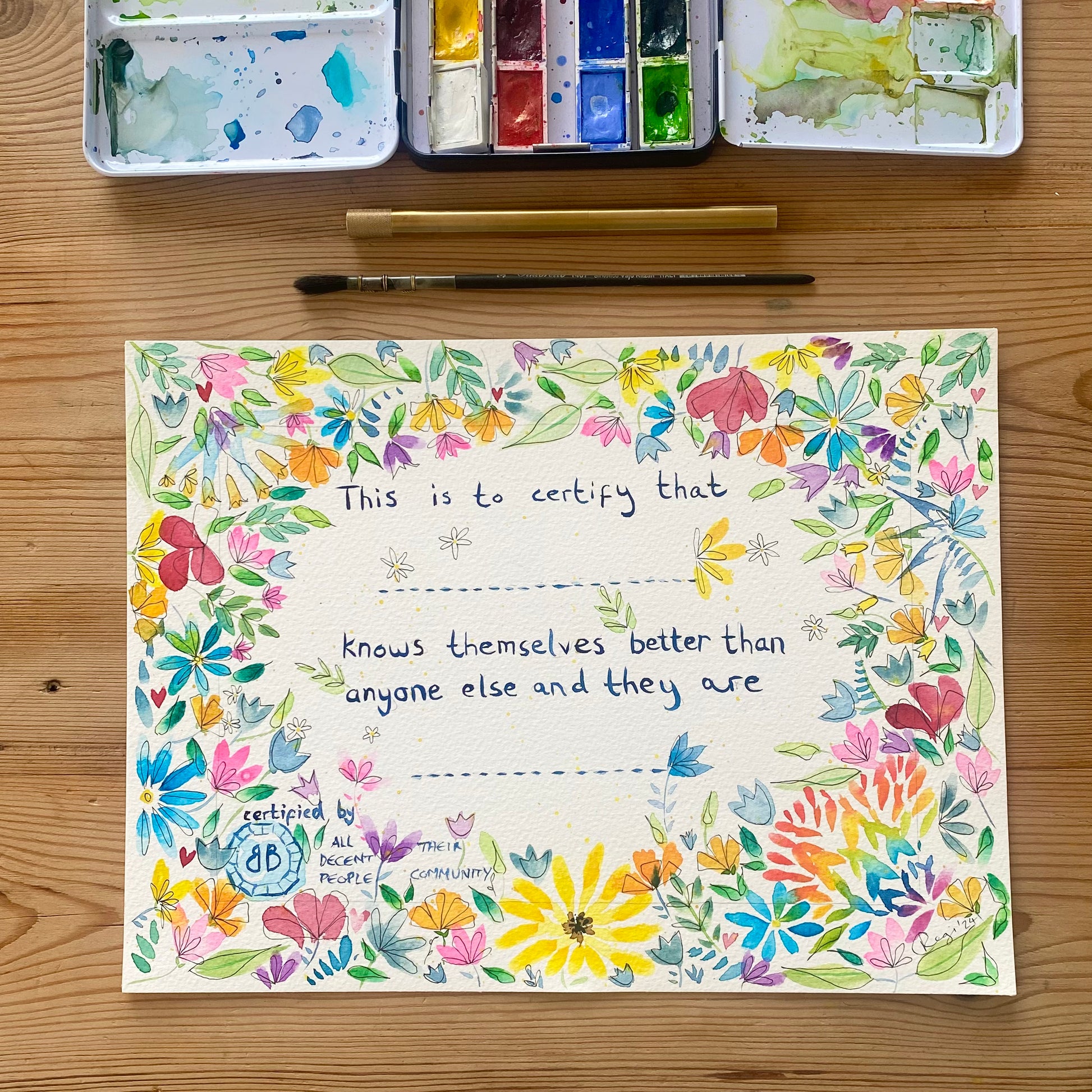 This is an extremely special piece that highlights how important it is to remember that you know yourself best and your feelings are valid. Made for those who would like a beautiful display of their self certification or self ID. If you need this reminder, then this is the perfect piece for you. This is an original watercolour artwork, with mixed media accents.