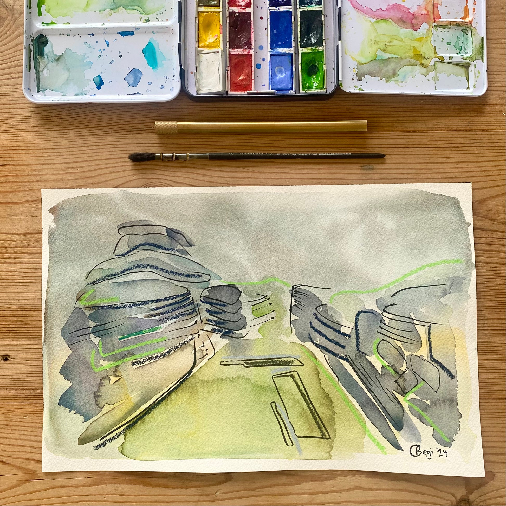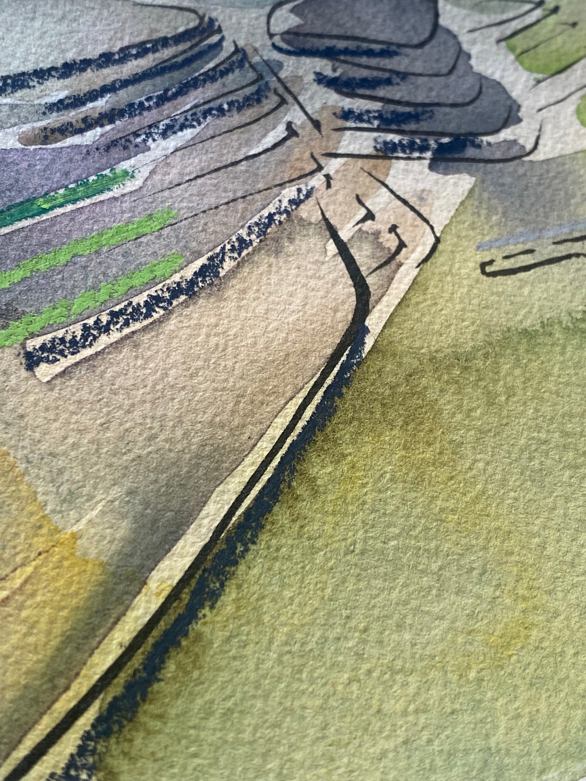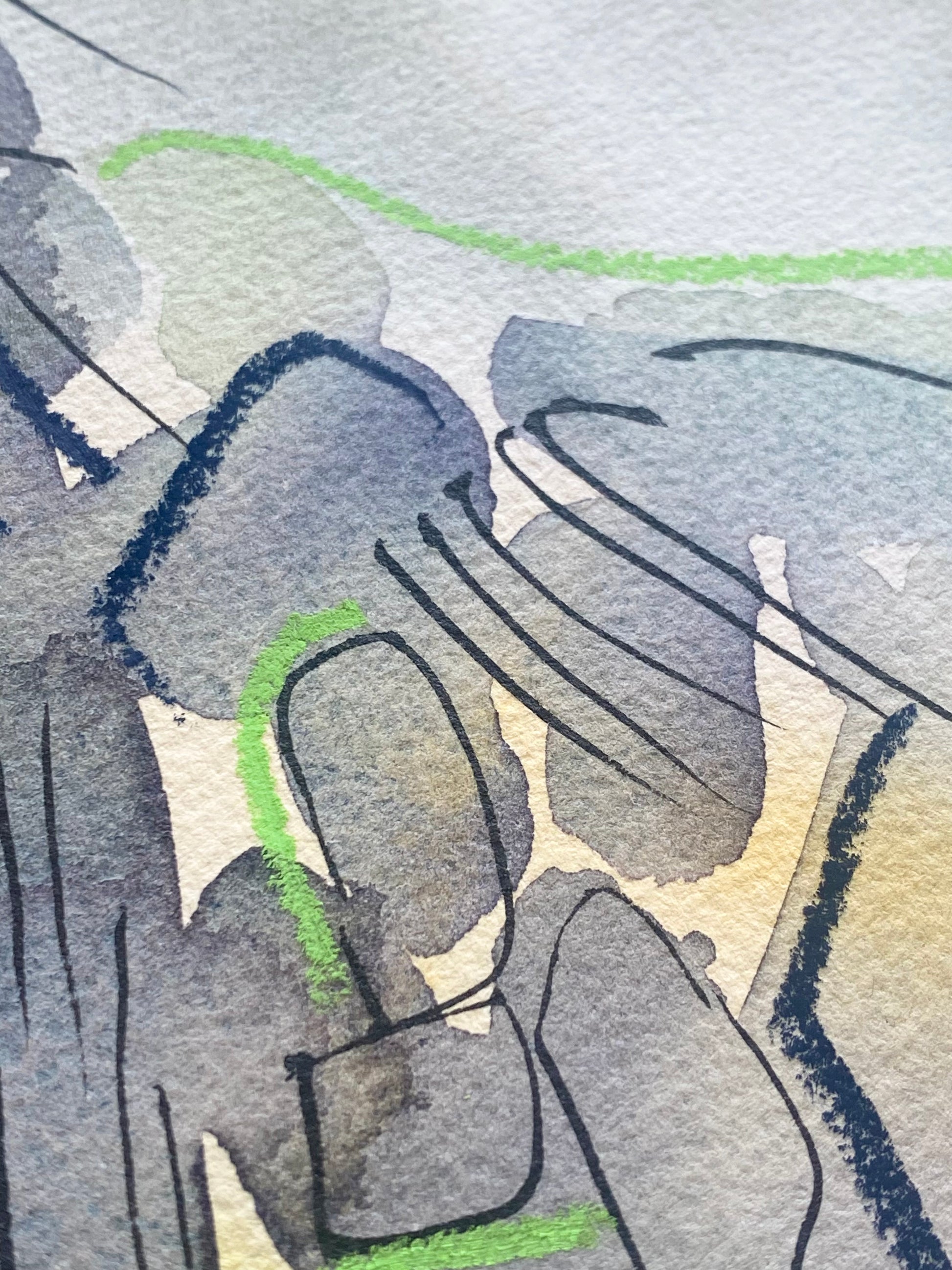 With a clever use of perspective, this beautiful abstract landscape captures the Kinder Scout Passage using watercolours, pastels and ink. This mixed media piece uses spring greens and deep navy to enhance this iconic view.