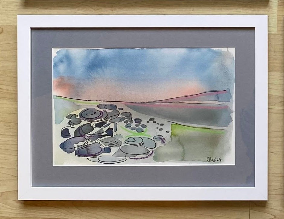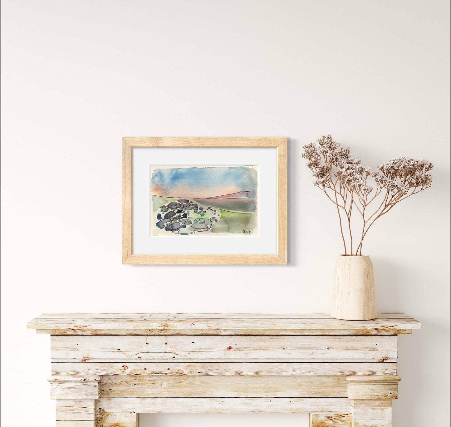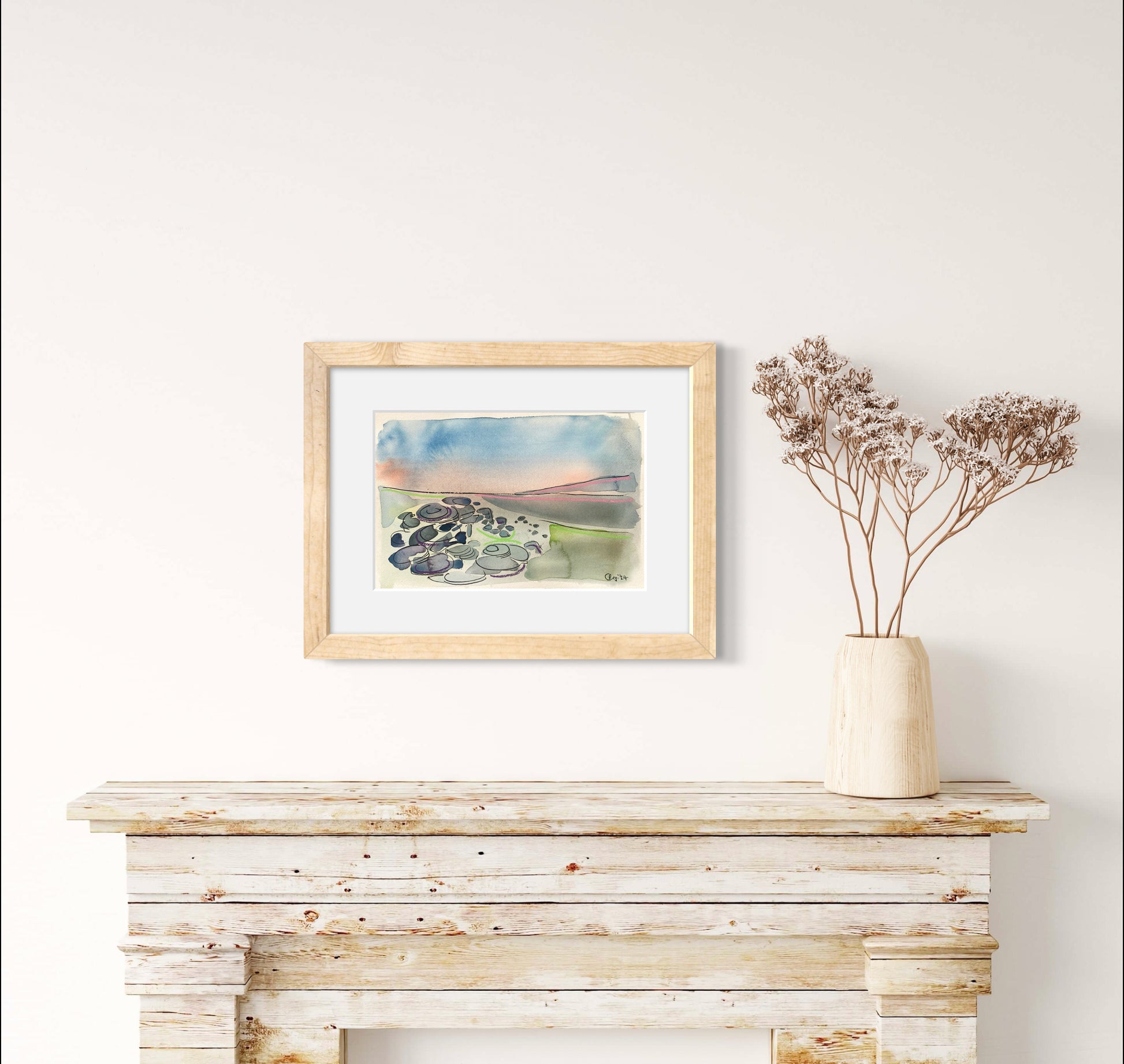 The unique Kinder Scout landscape with a beautiful gradient sky with blues and oranges is a mixed media piece using watercolours, pastels and ink. Pops of pink and bright green bring this original Peak District scene together with spiral stones in the foreground.