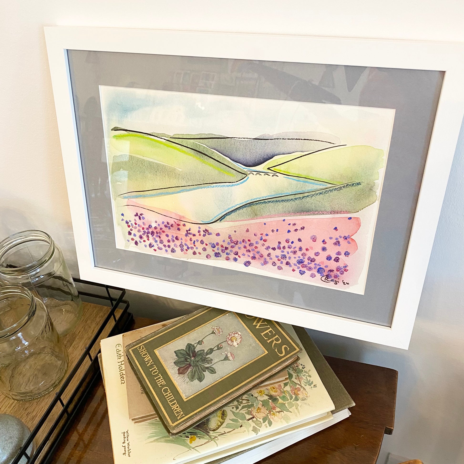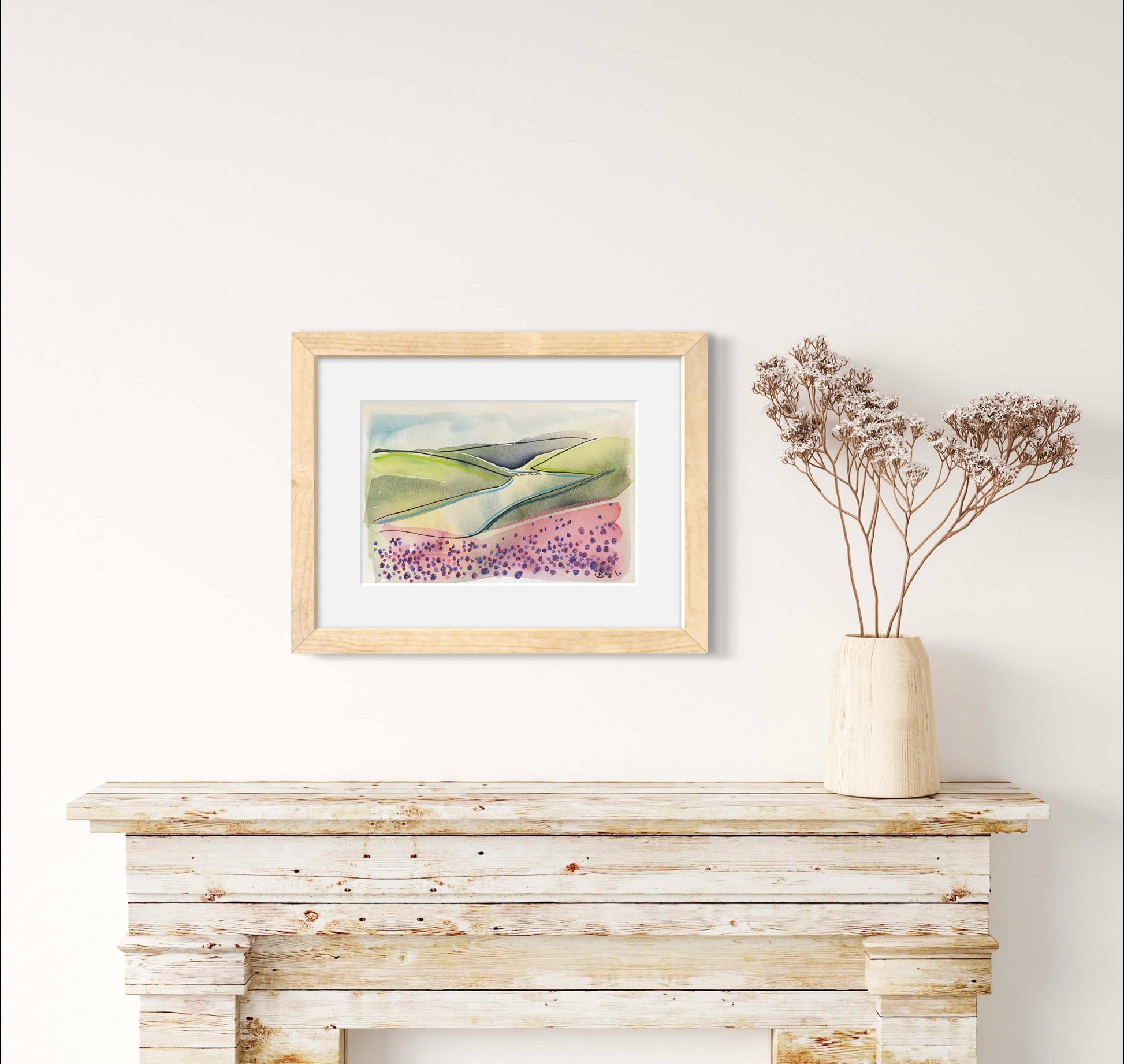 This mixed media original is an abstract landscape of Ladybower in the Peak District, using watercolours, pastels and ink. This striking landscape features beautiful flowers at the forefront in rich pinks and purples.