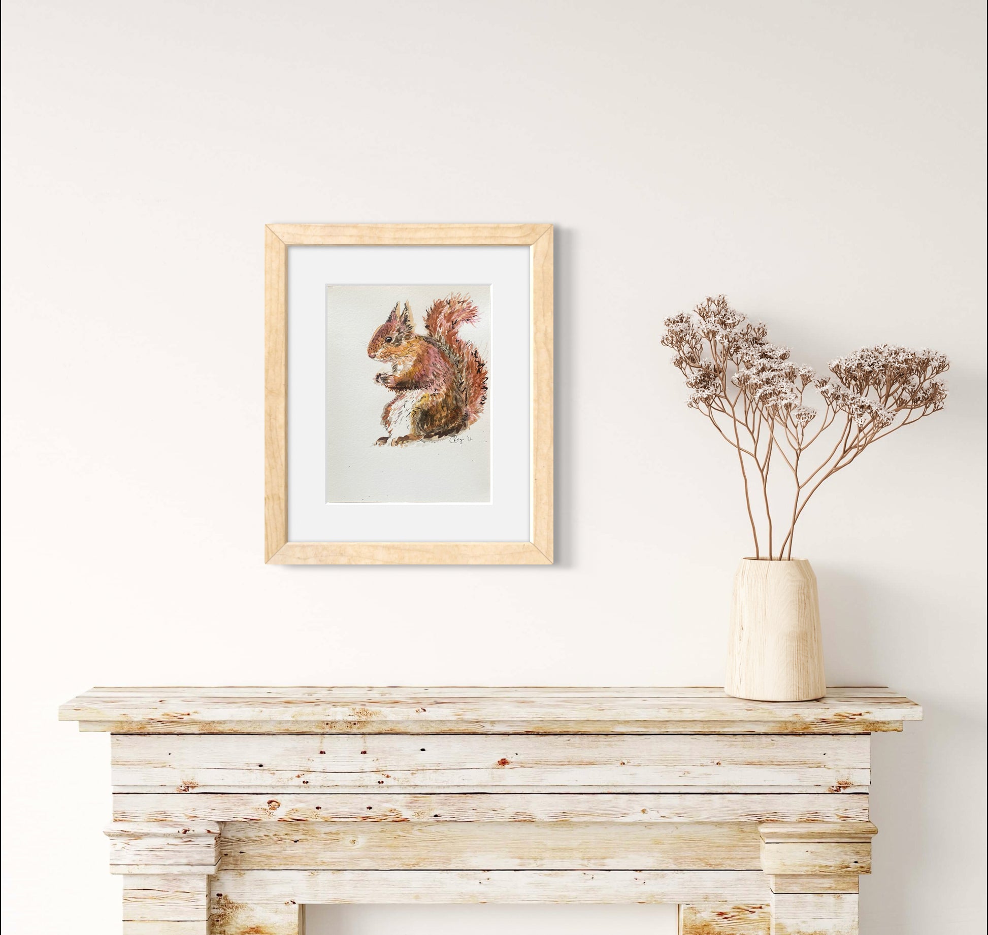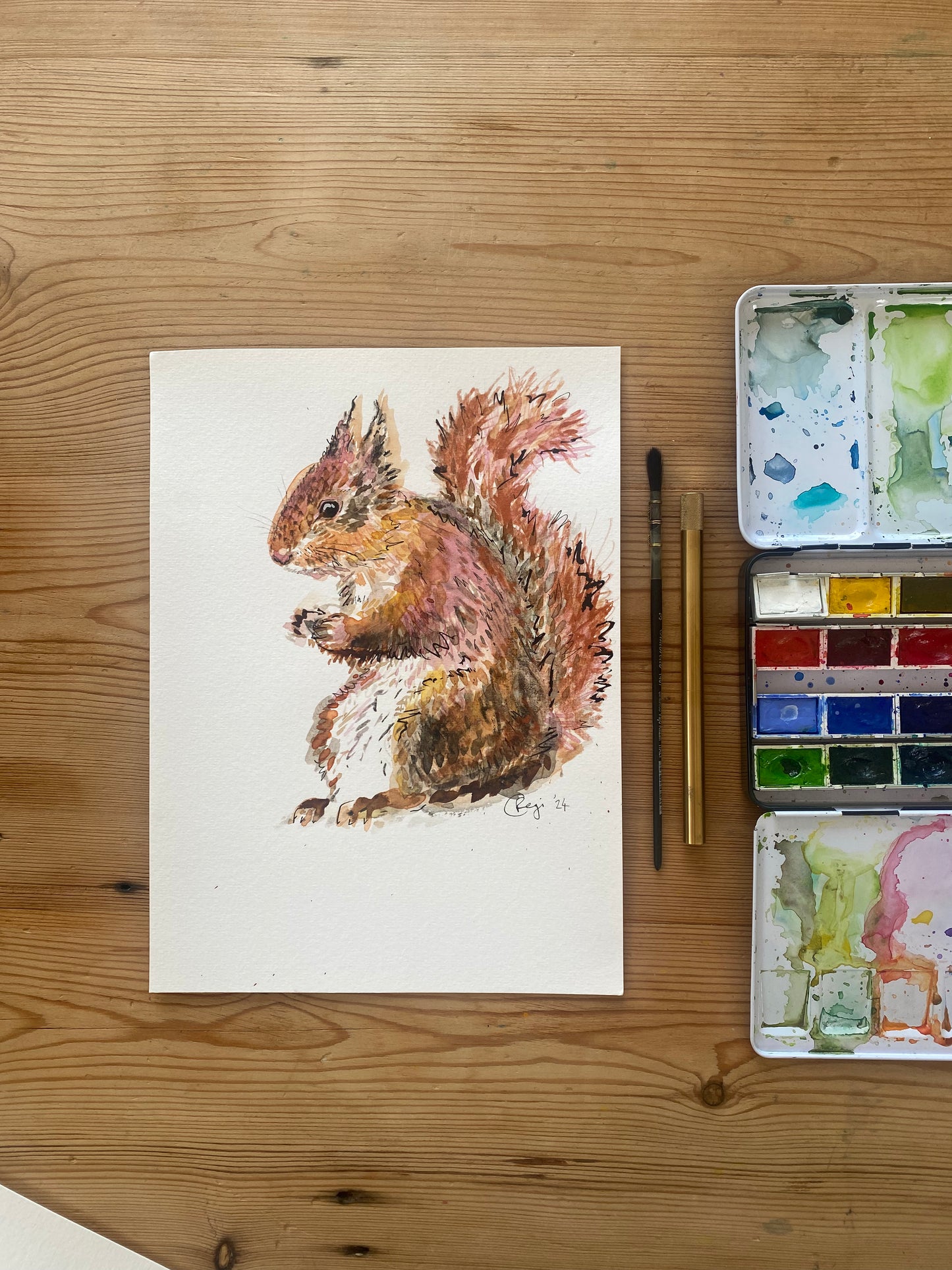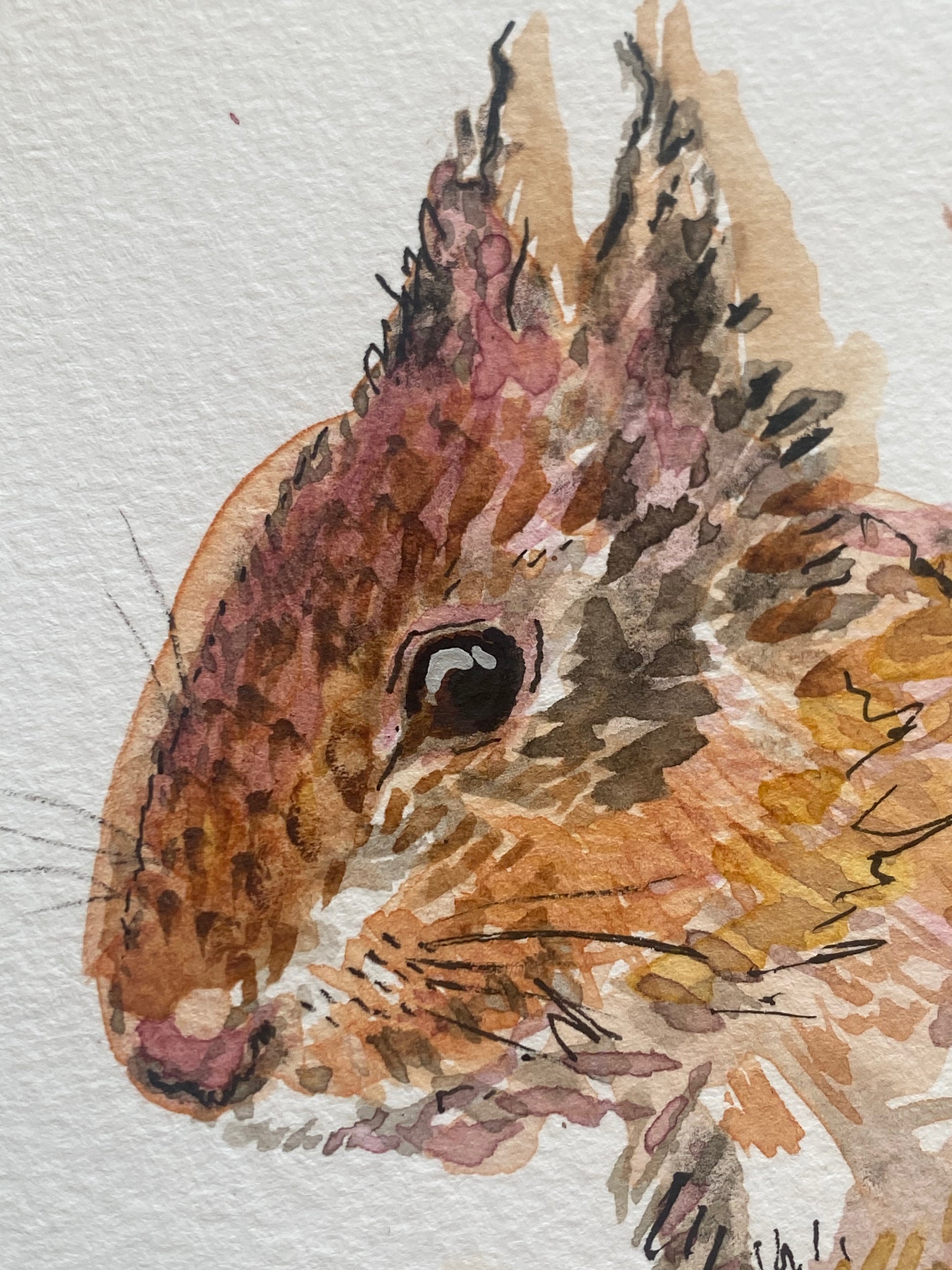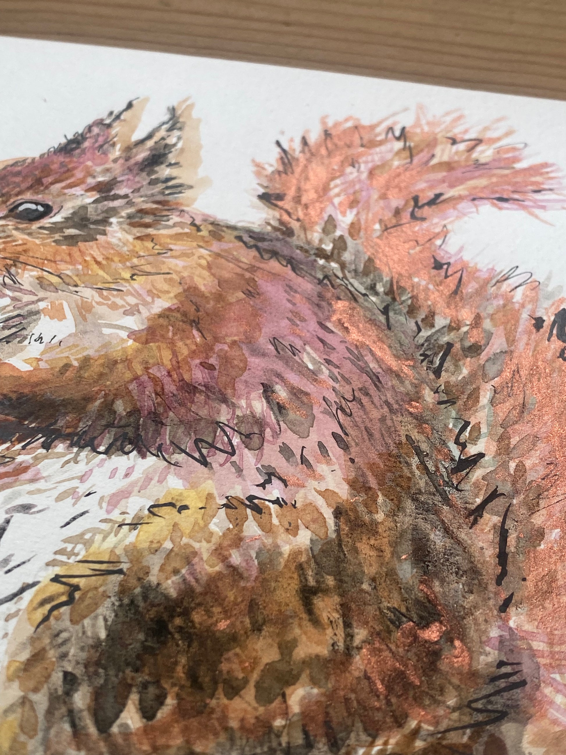 With stunning metallic mixed media accents; Let Your Fire Shine Bright is a beautiful red squirrel in a detailed watercolour original, with layers or rich oranges and red browns.