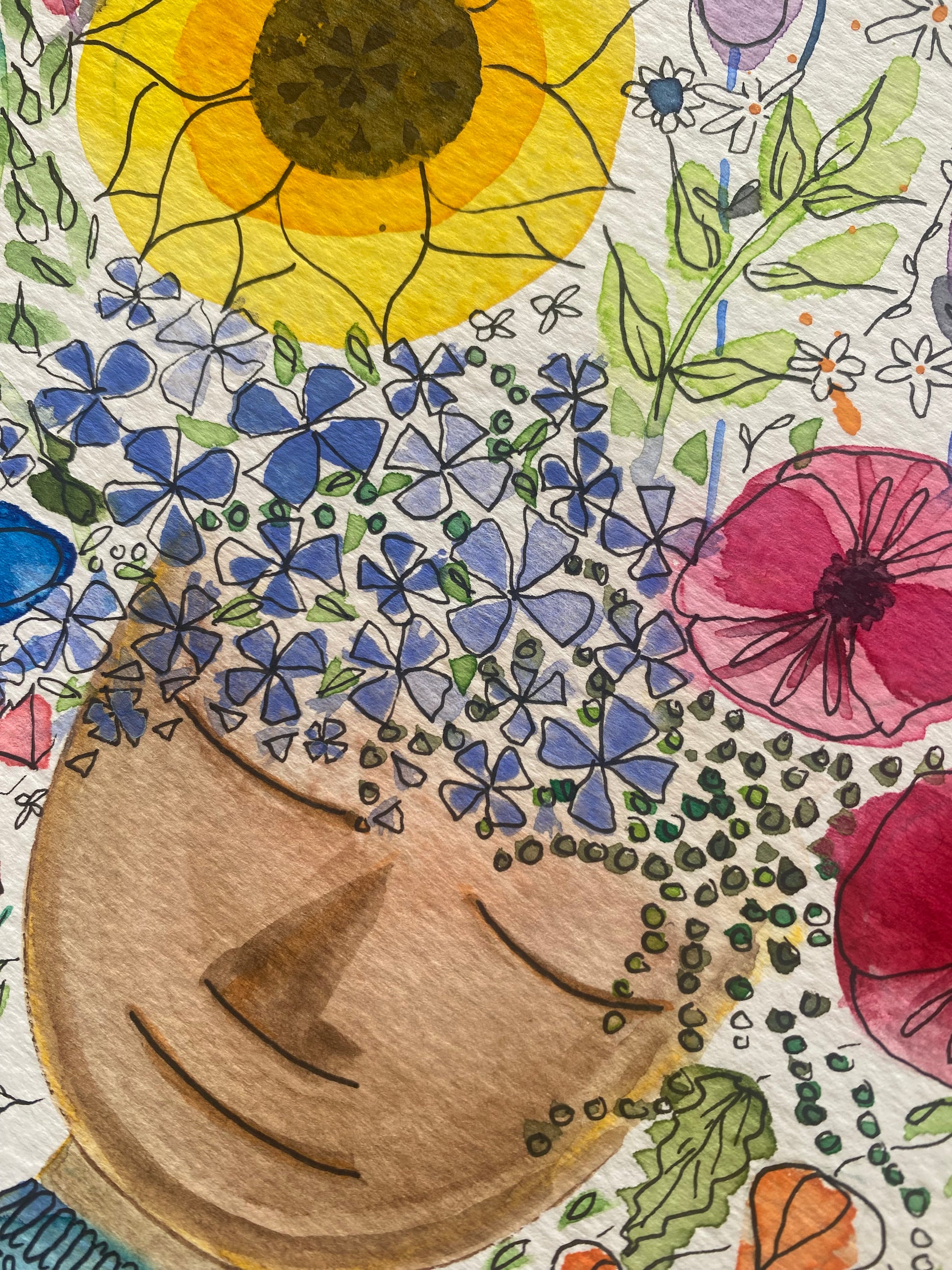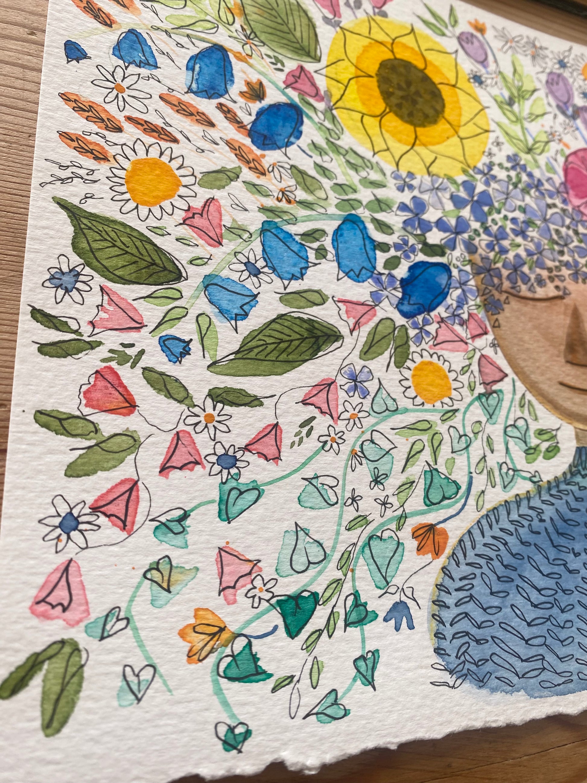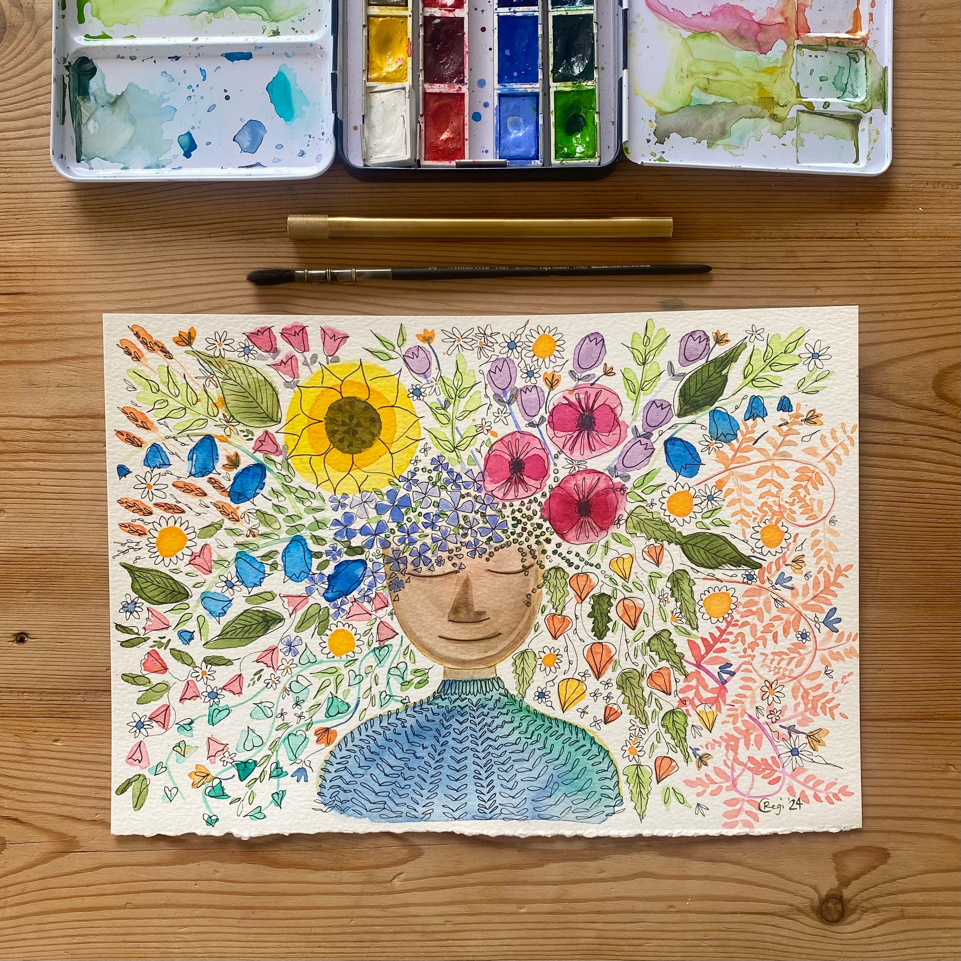 This beautiful piece is a wonderful reminder that not everything has to be perfect in order to be beautiful. Our brains can be messy places, but that does not stop us from being able to create beautiful things. This piece has been created using a combination of watercolours and mixed media accents.
