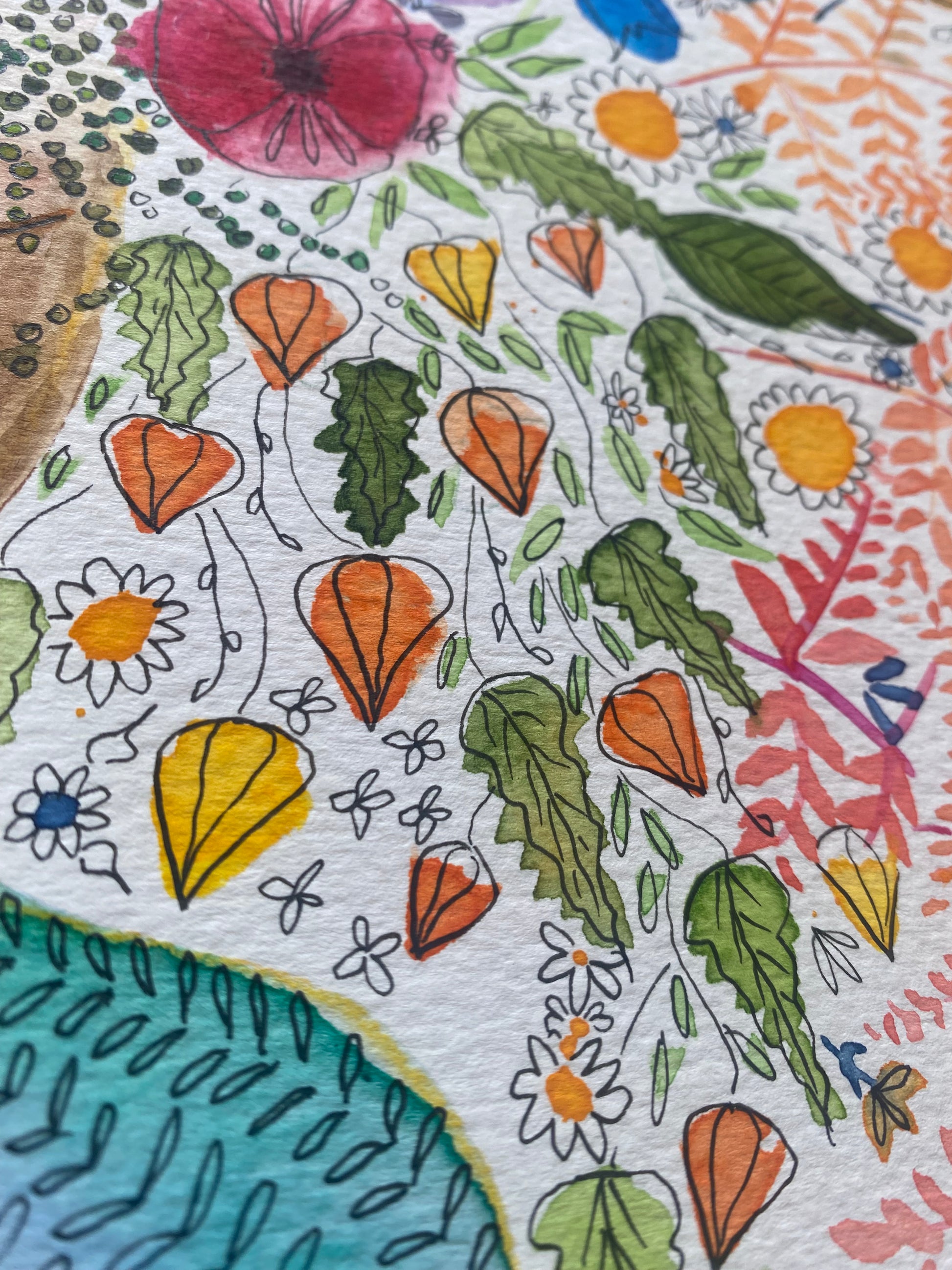 My paintings are created in layers of watercolour, gouache and ink. High-quality paints and 300gsm acid-free paper ensure the colours are vibrant. Please note that some colours may look different on varying computer screens compared to natural light.