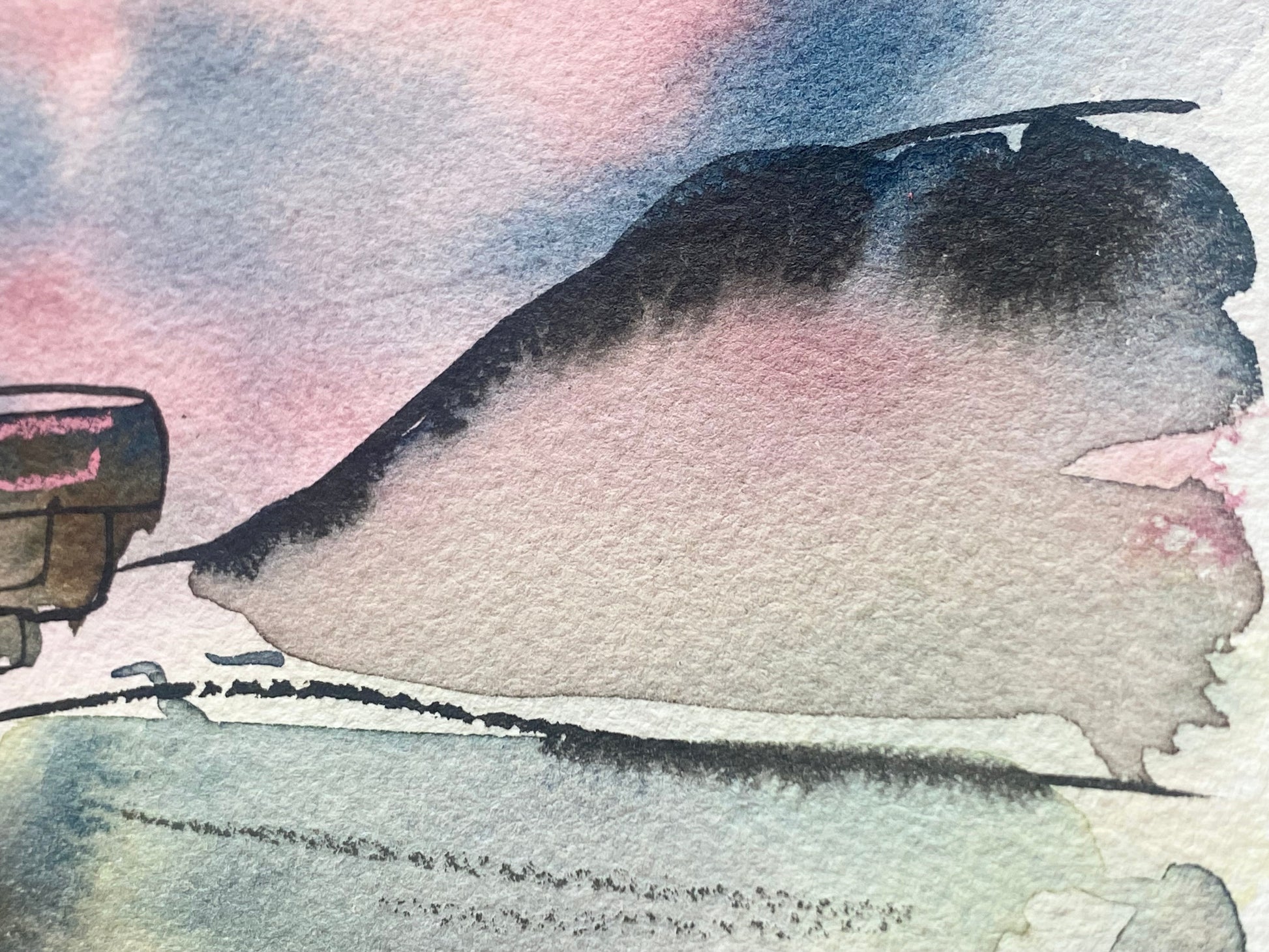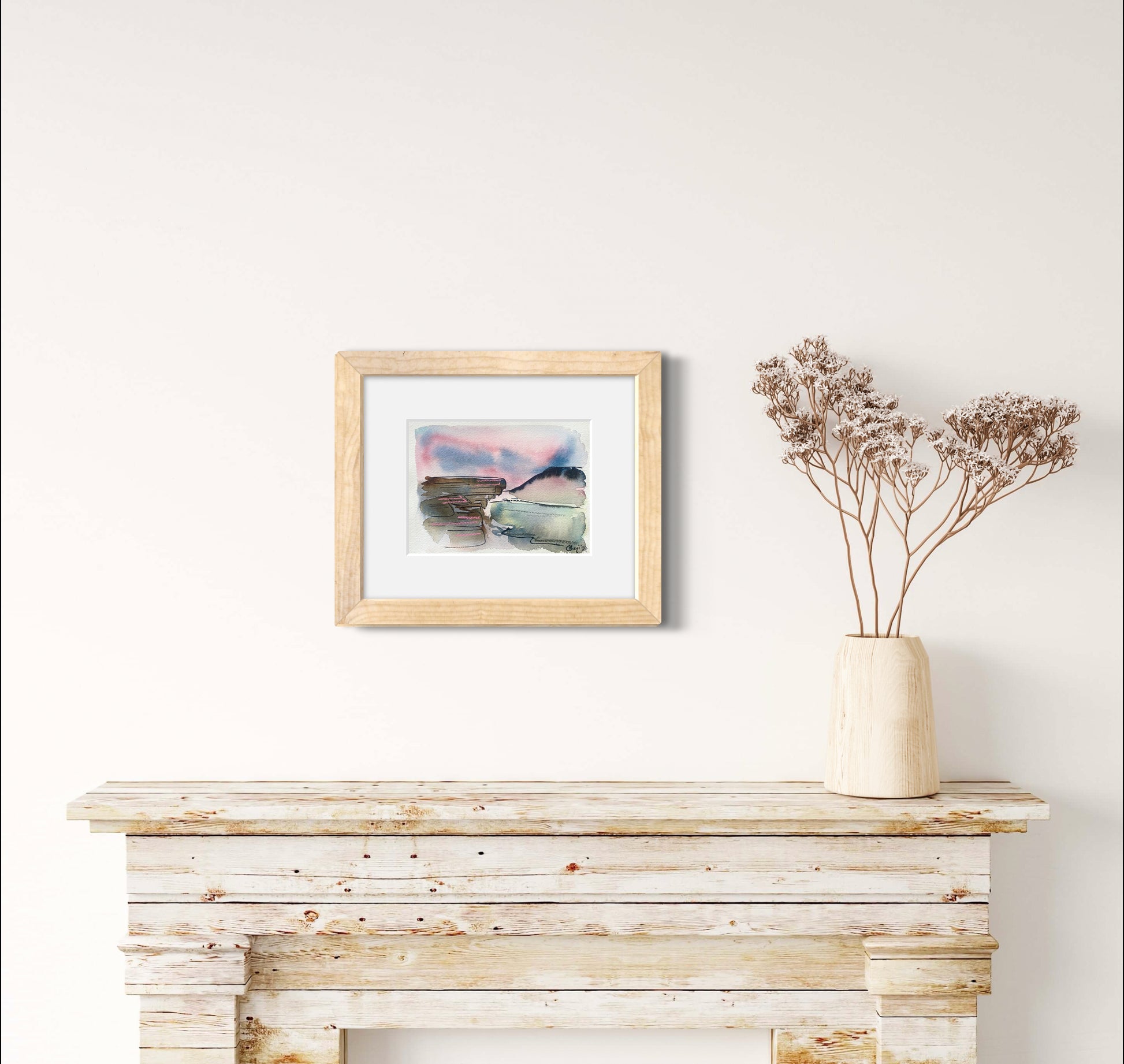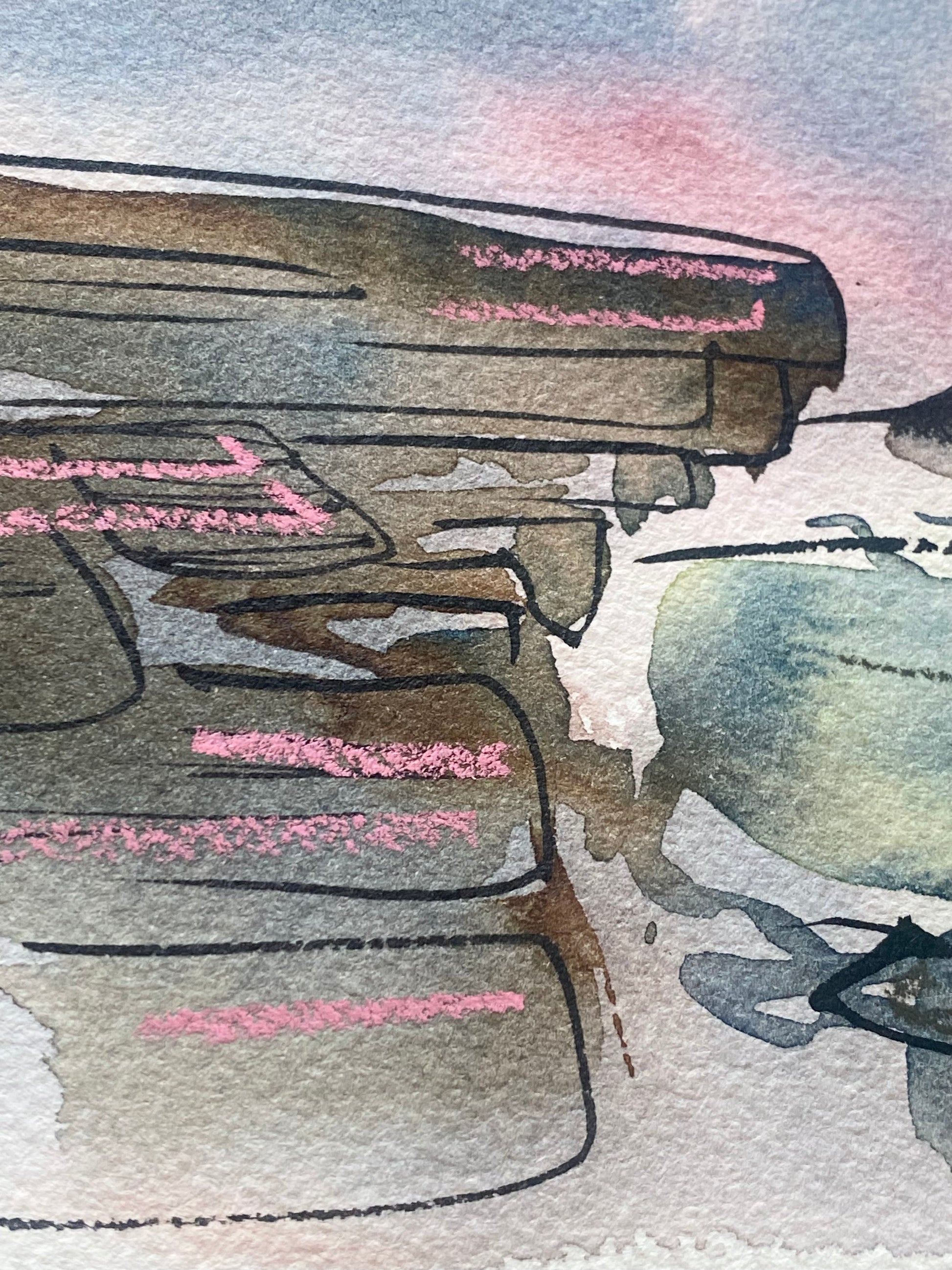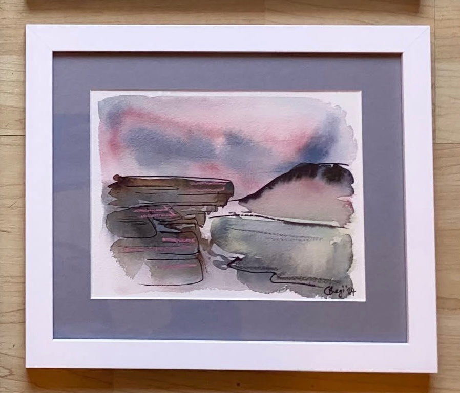 This atmospheric landscape inspired by Bamford Edge in the Peak District features a selection of blues with vibrant pops of pink; this is an original mixed media piece, created using watercolours, pastels and ink.