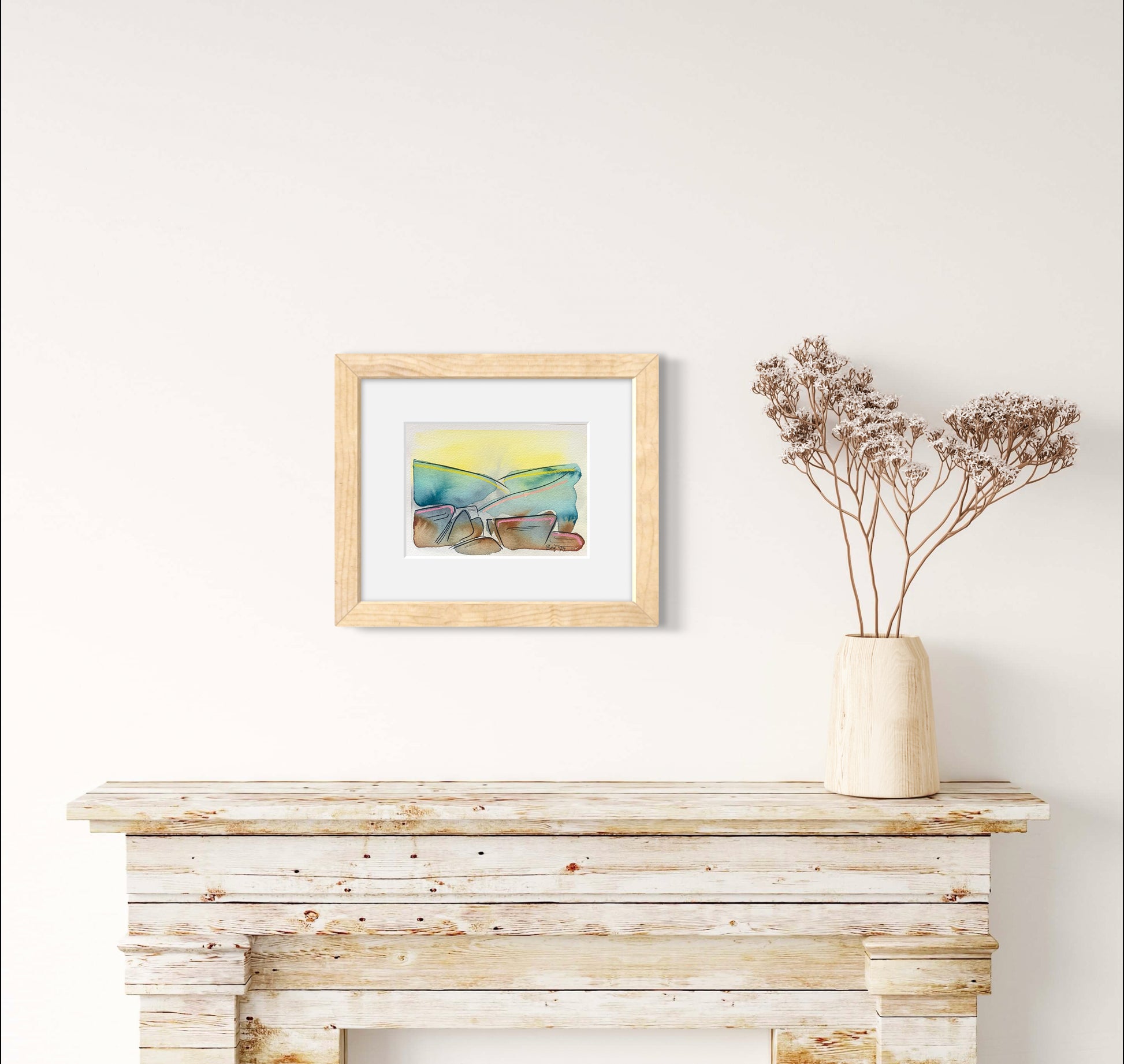 Using beautiful spring hues to capture a landscape inspired by the Peak District; this original abstract piece with a striking yellow sky has been created using washes of watercolours, with bright pastel accents and definition added in ink.