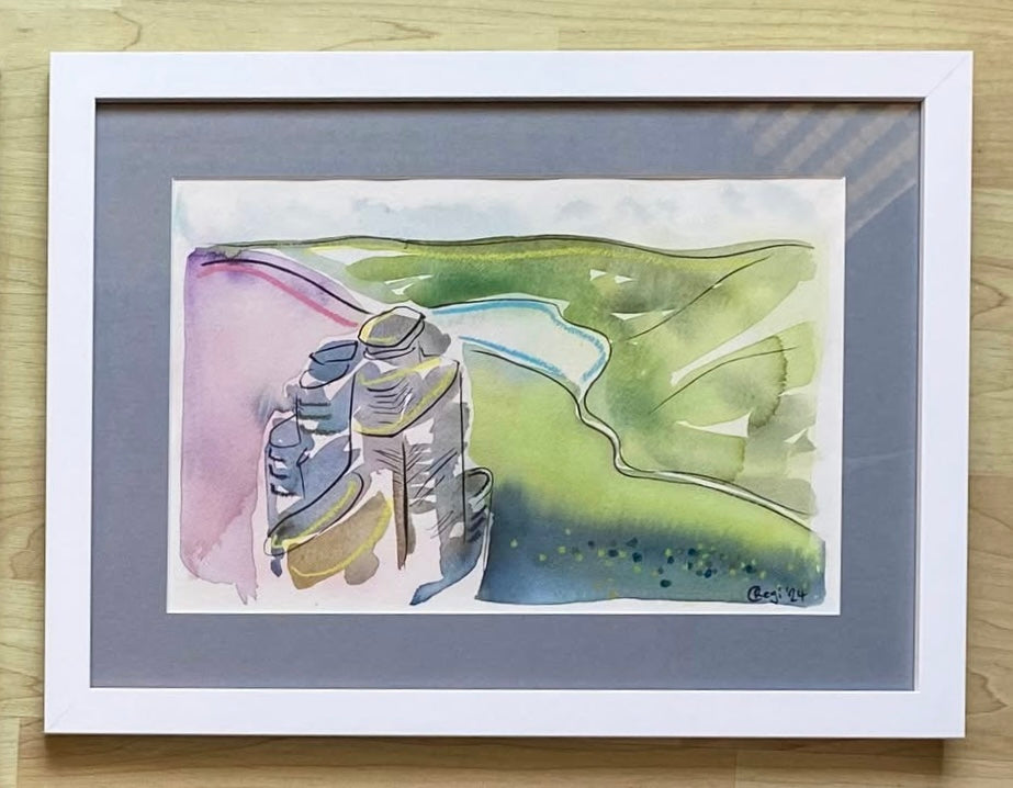 This distinctive landmark of the Peak District landscape has been captured in stunning mixed media of watercolours, pastels and ink. This is an original, abstract piece with gentle washes of purples and greens and bright accents.