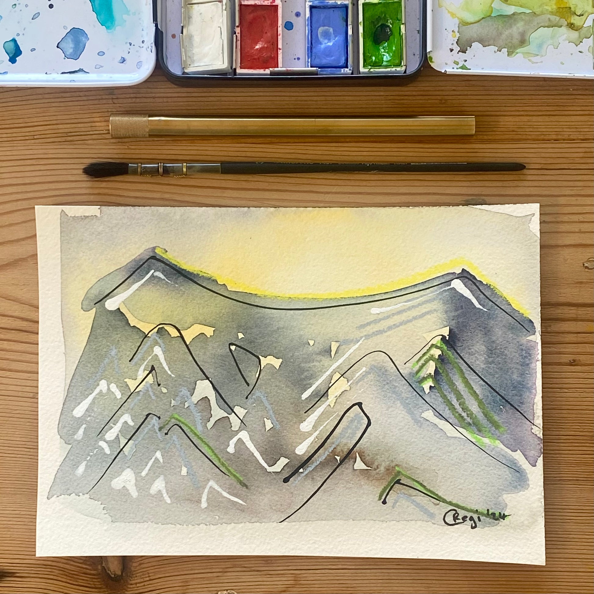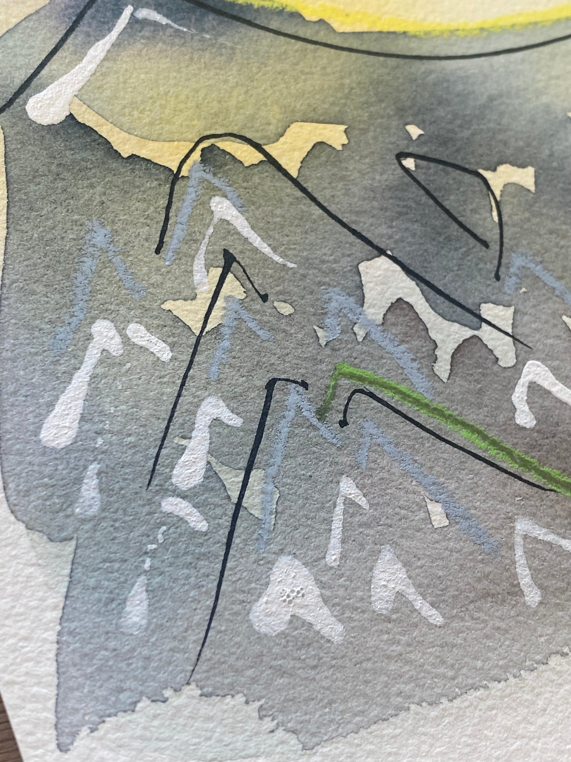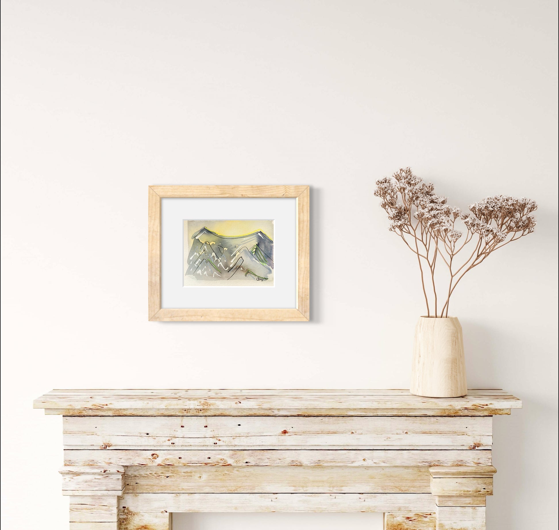 Inspired by the Welsh Mountains, this abstract original has been created using layers of watercolour to create a distinctive landscape, with a wash of yellow bathing the mountains with sun. Mixed media accents create pops of colour, applied using pastels and ink.