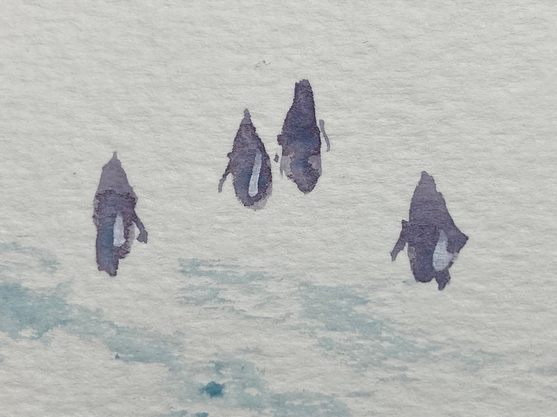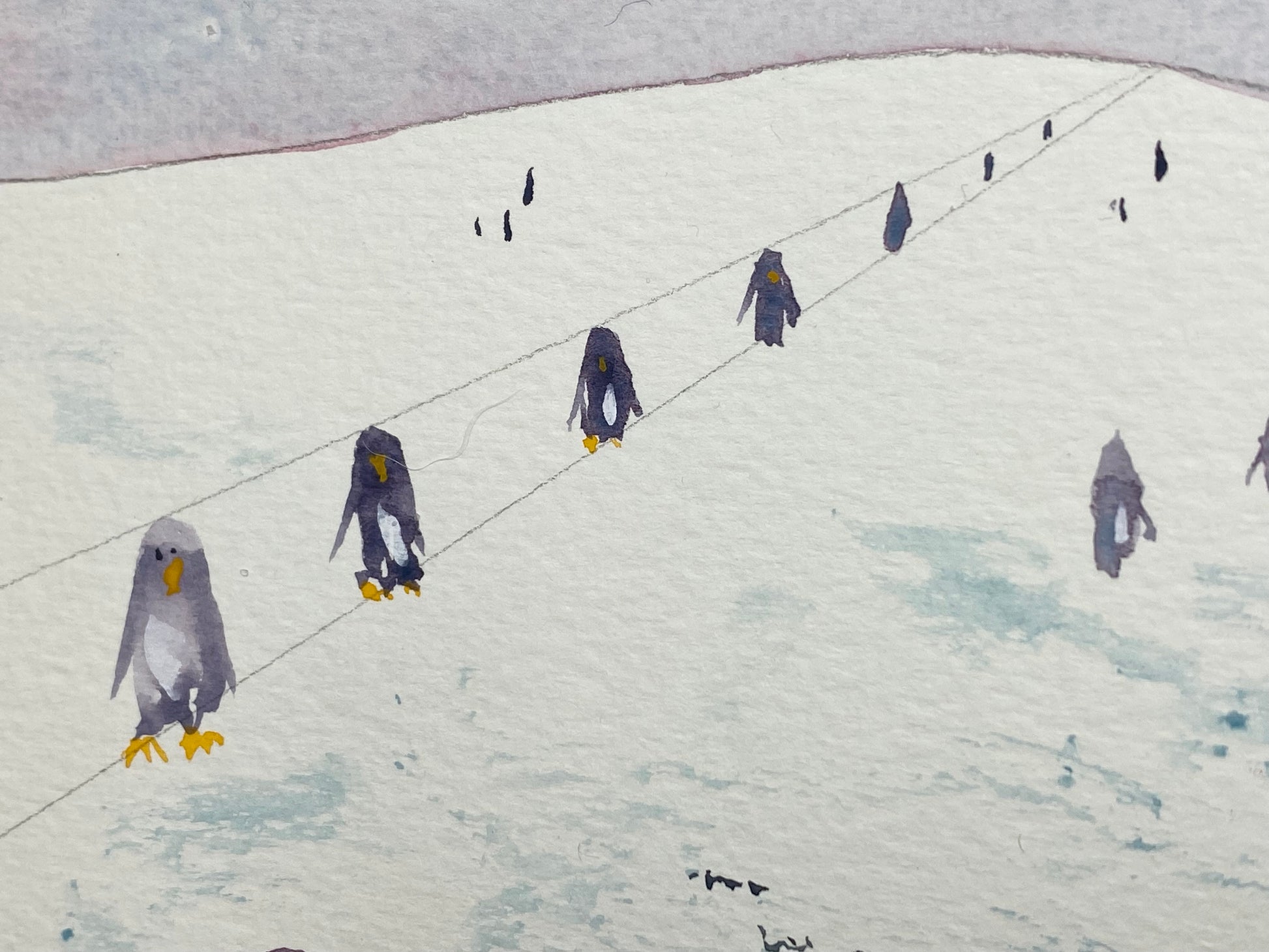 A playful title and one that kids will gravitate to, but absolutely full of information at all levels to play with textures, different techniques and more than anything to make sure your perspective is right. This will mean you don’t end up with parts of your painting completely out of proportion to everything else, and help you create a feeling of depth and distance. After running through the principles in penguin form, we run through a quick exercise to see how the skills transfer to a more traditional watercolour landscape!