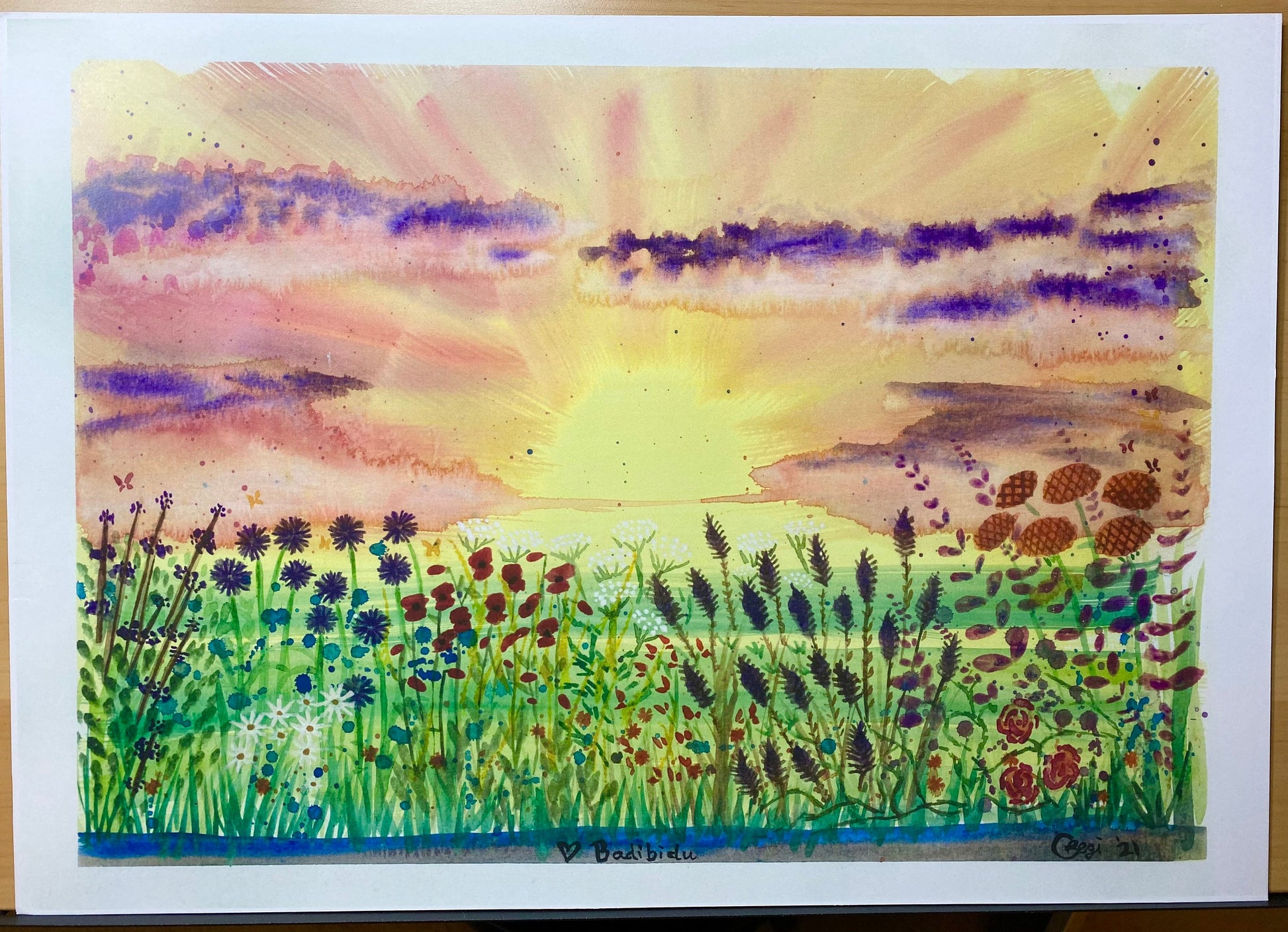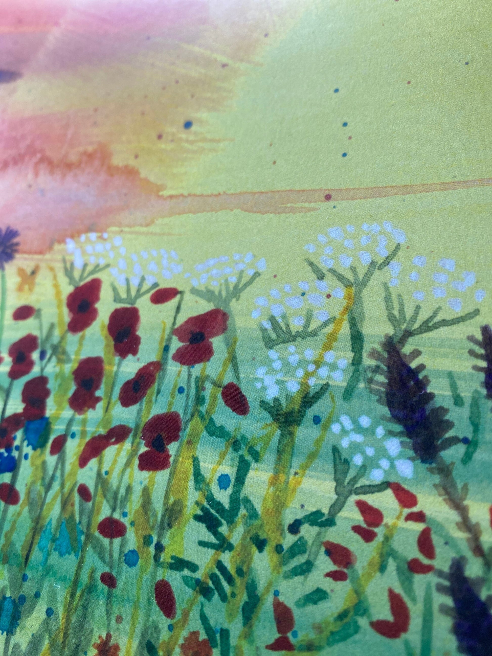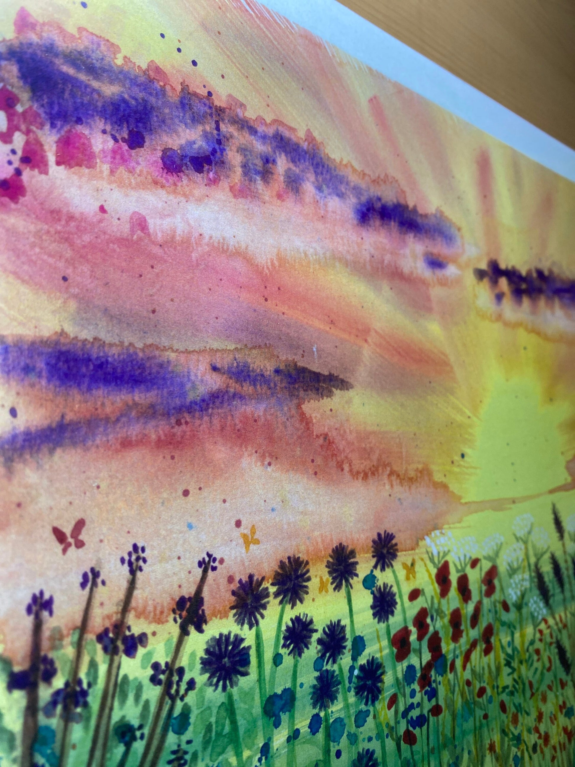 The star of this A3 print is the sky with its bright shining sun and hopeful glow. The wildflowers frame this, including teasel, cow parsley, poppies, foxgloves, daisies, and all sorts of other colourful varieties.