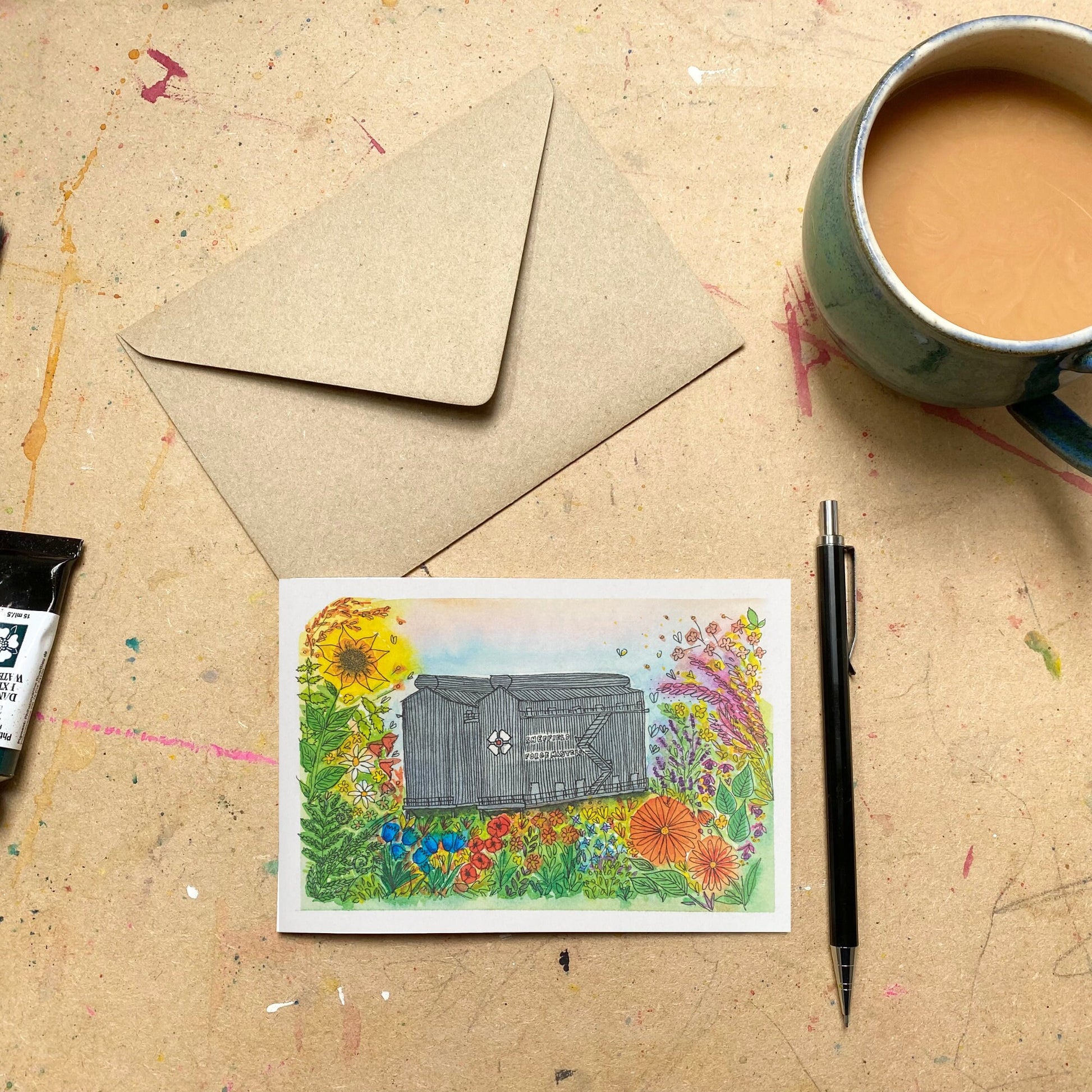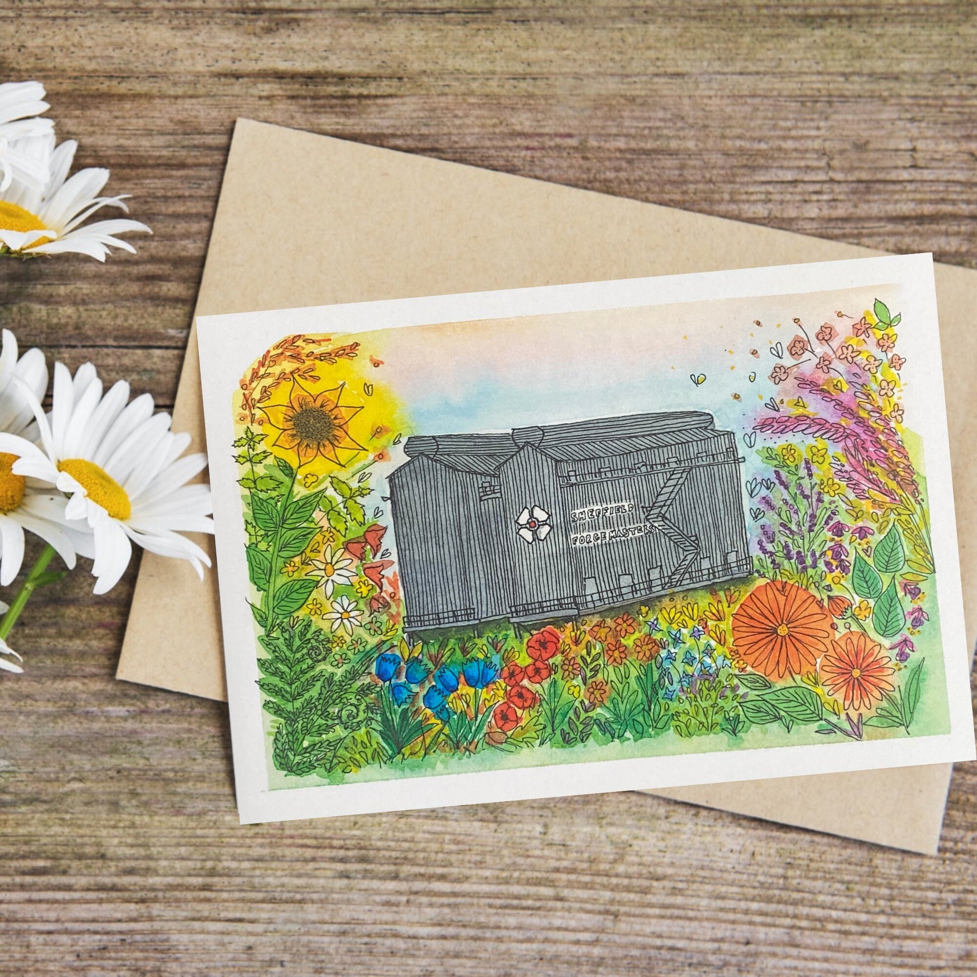 Blank A5 greetings card with a print of a watercolour design of the beloved Forgemasters in Sheffield. This is the perfect card for someone who loves Sheffield or is moving to or from there!