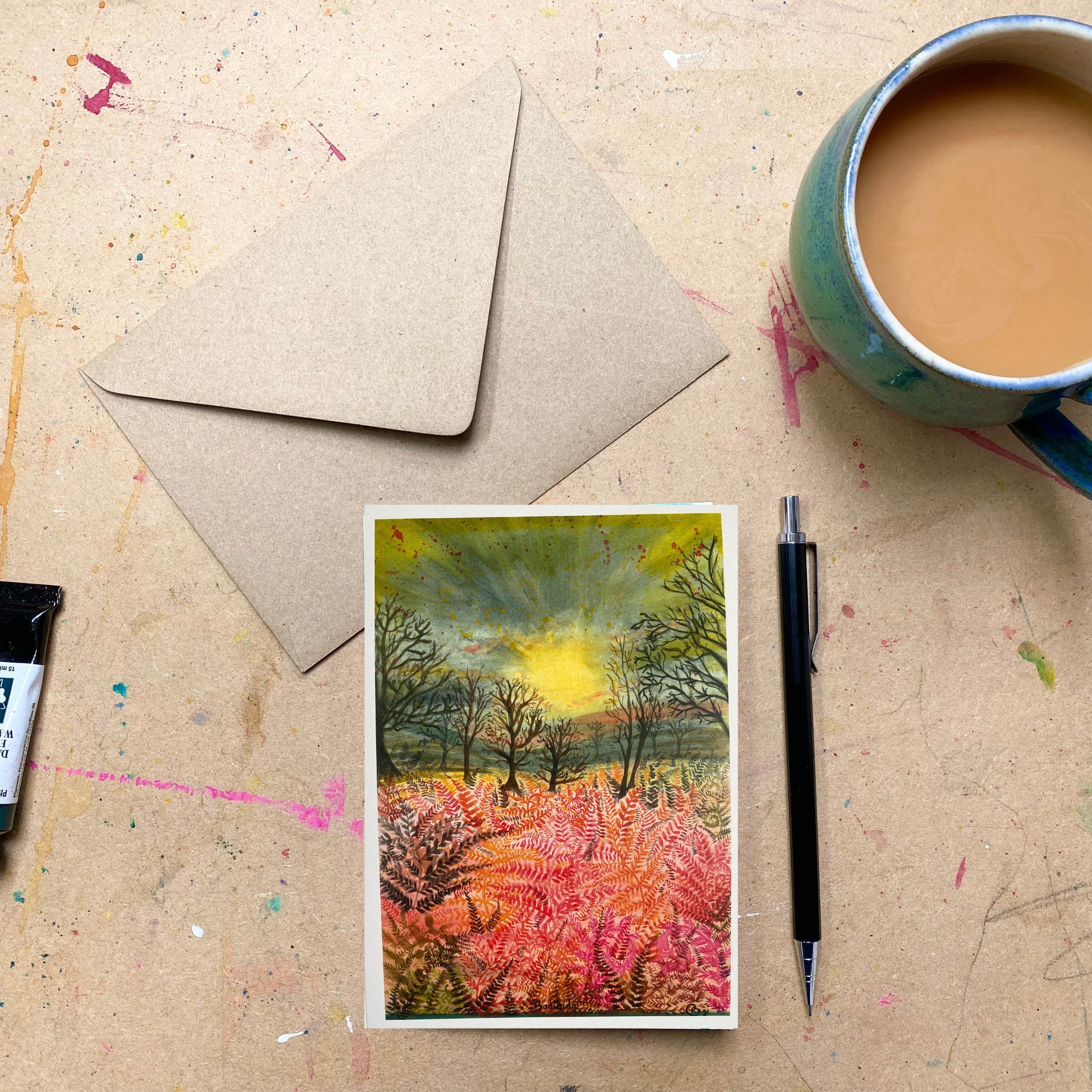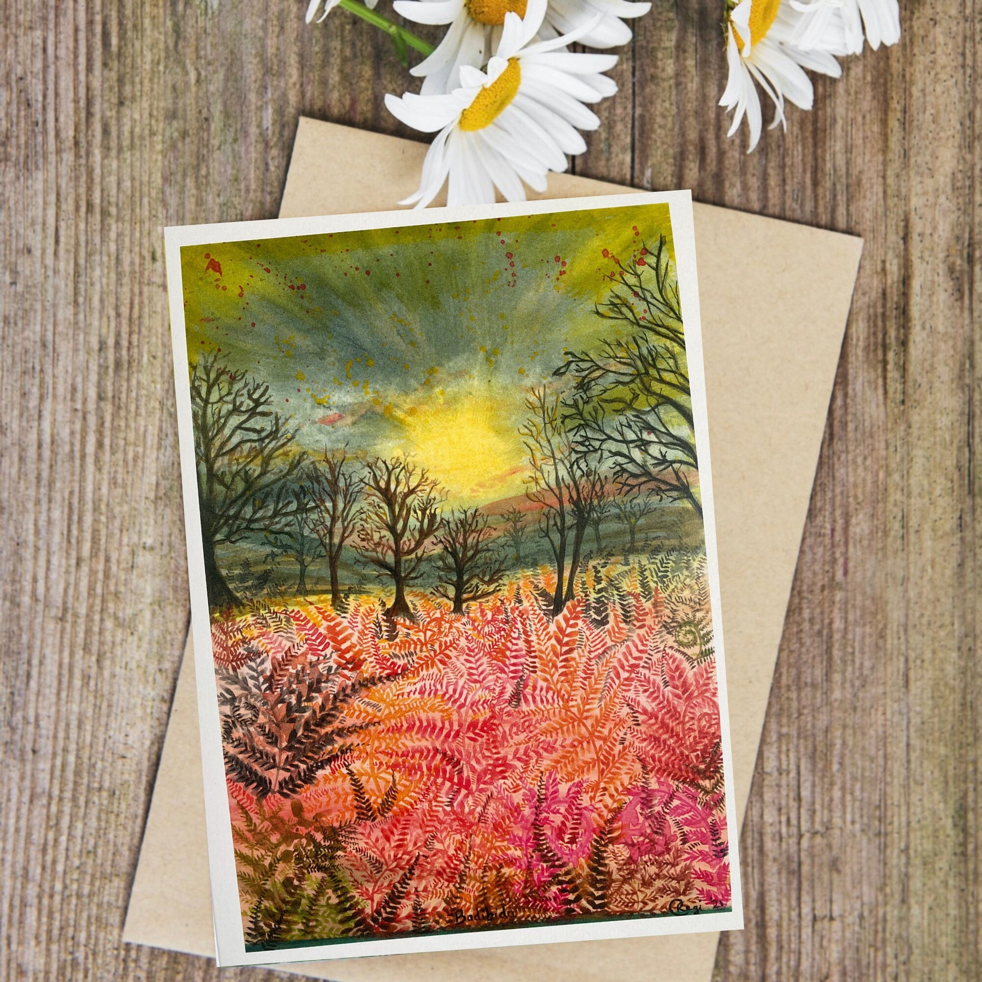 Blank A5 greetings card with a print of a watercolour painting of the beloved Hathersage Ferns in Sheffield. This is the perfect card for someone who loves Sheffield or is moving to or from there!
