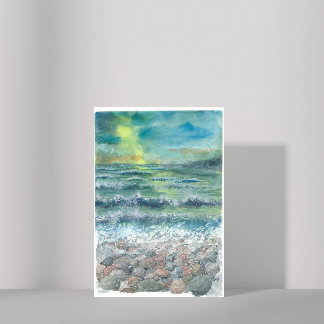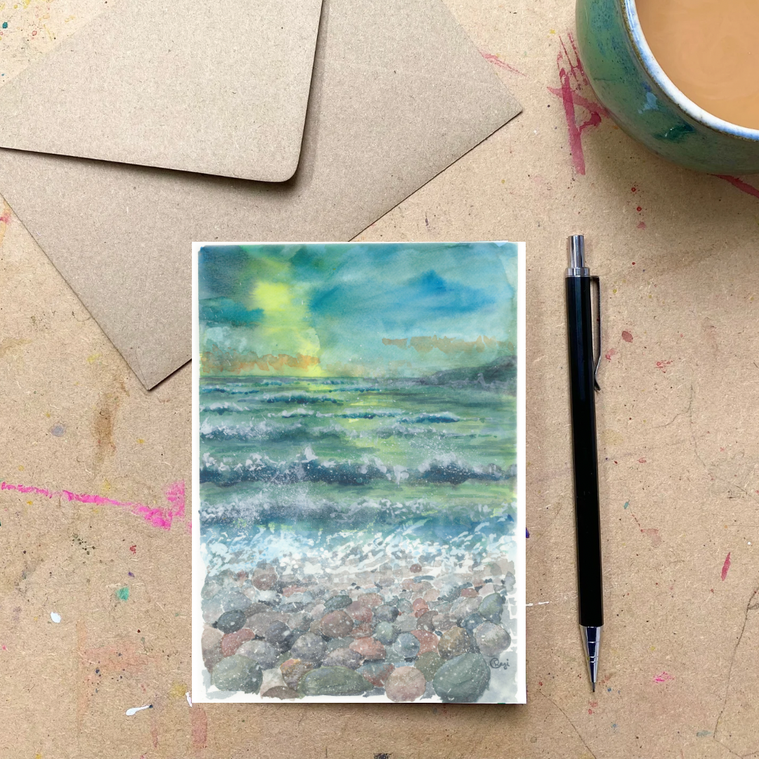 Blank A5 greetings card with an original watercolour design of a bright sun glinting off a blue/green ocean, splashing onto a pebble beach.