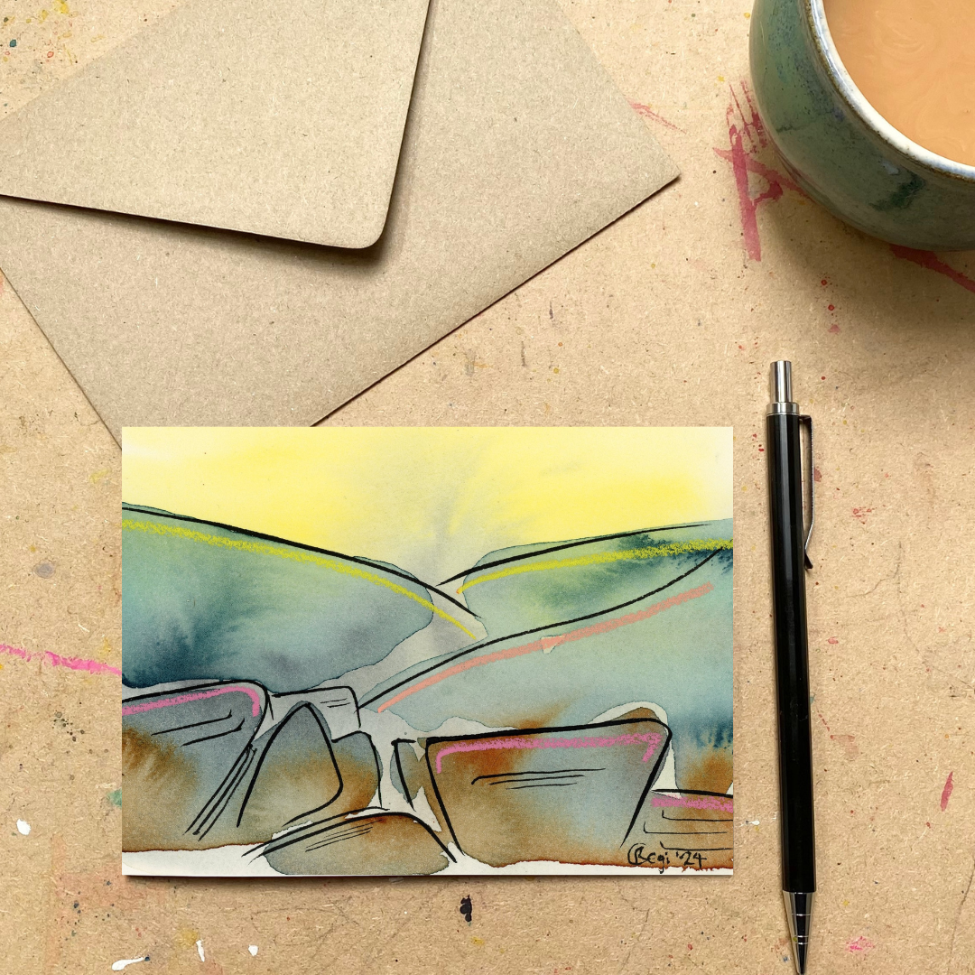 Using beautiful spring hues to capture a landscape inspired by the Peak District; this original abstract piece with a striking yellow sky has been created using washes of watercolours, with bright pastel accents and definition added in ink.